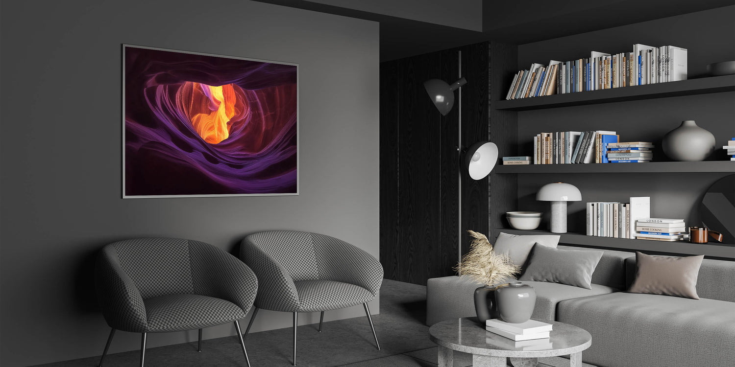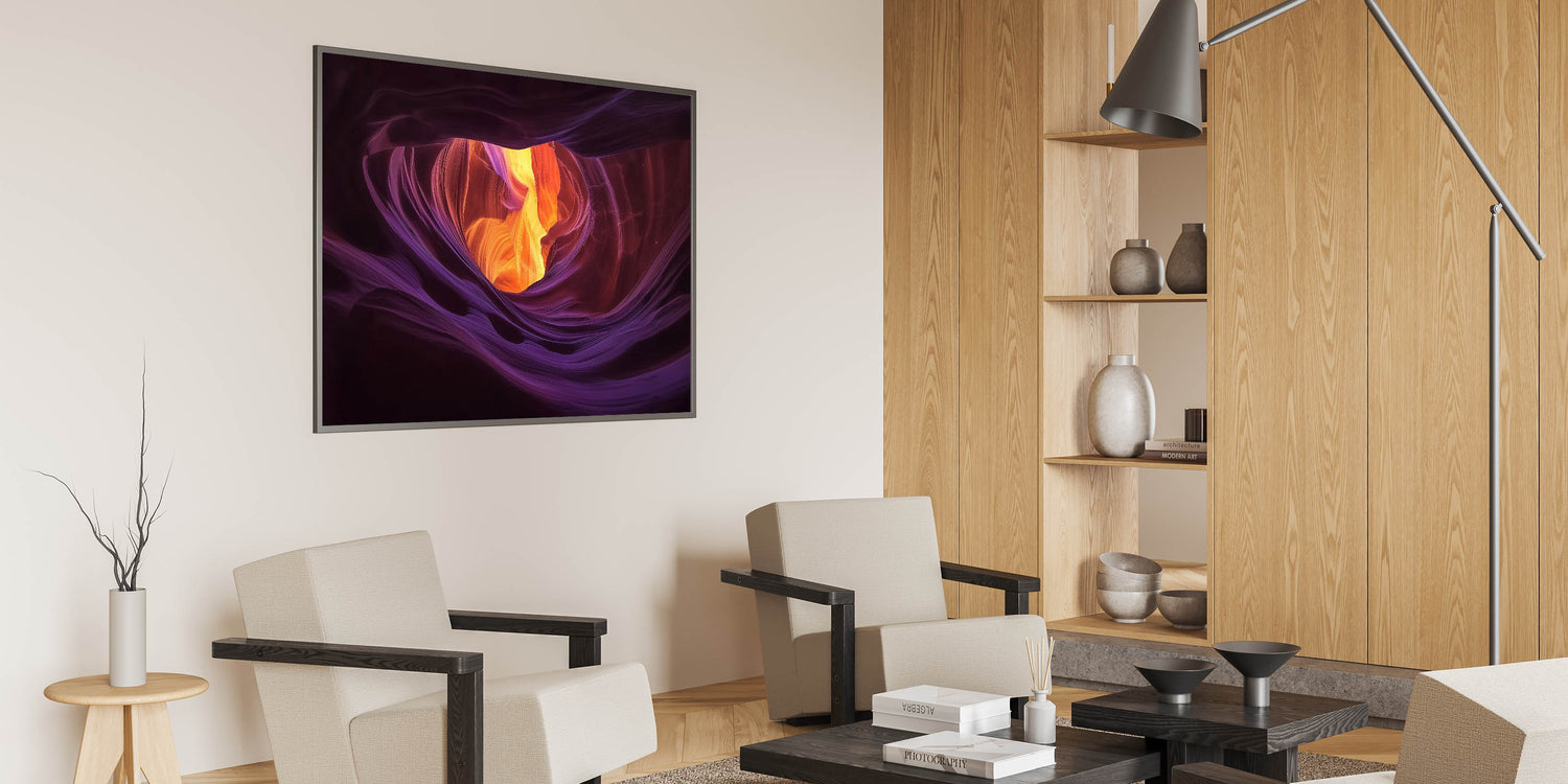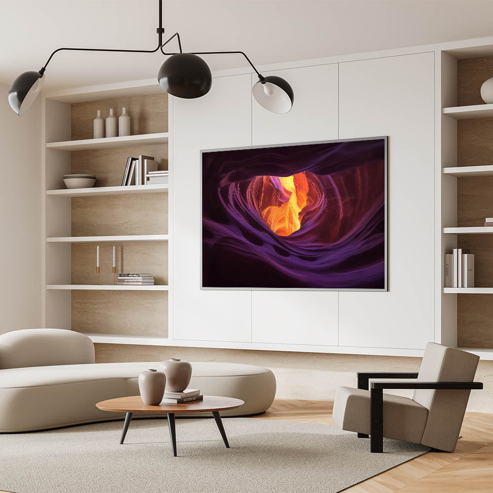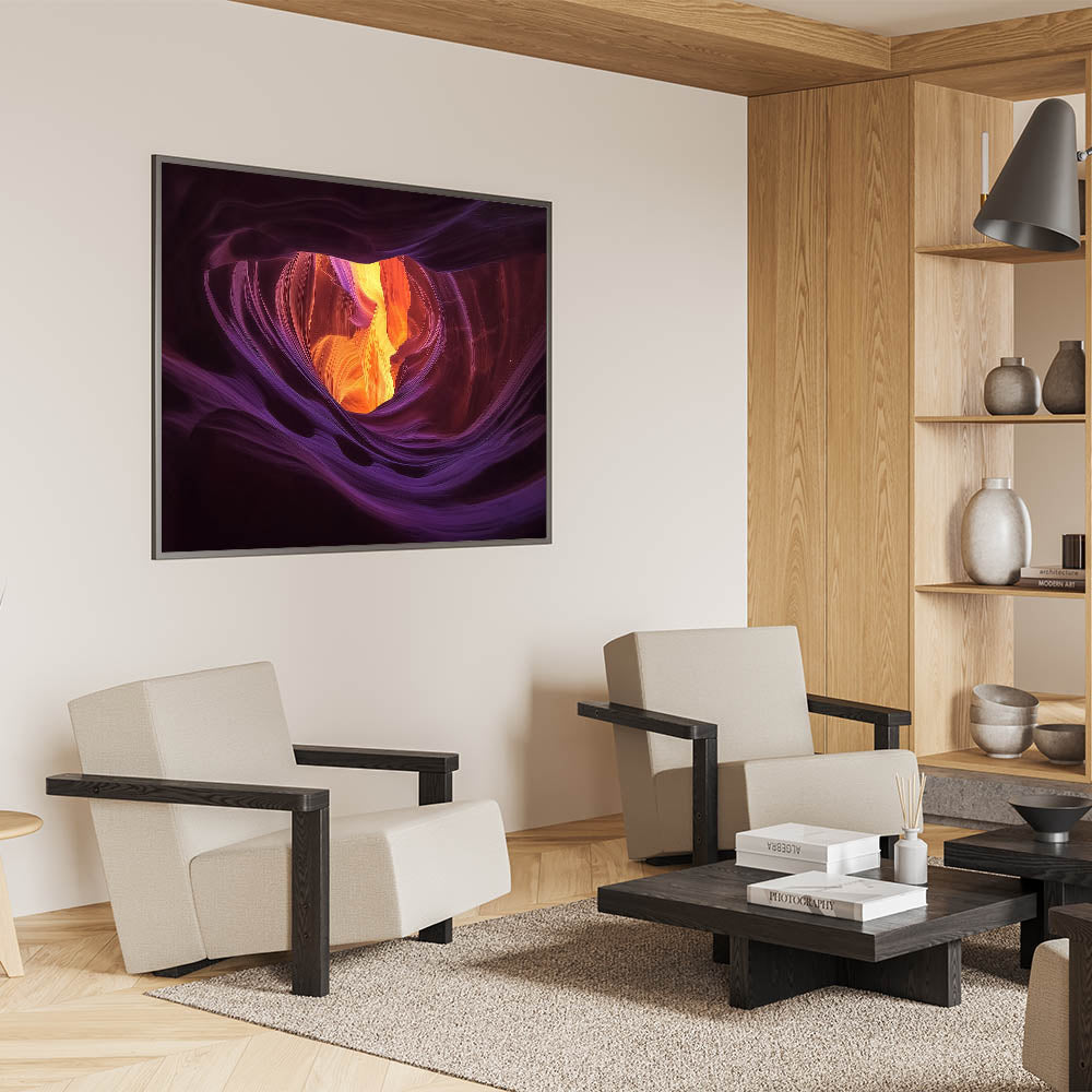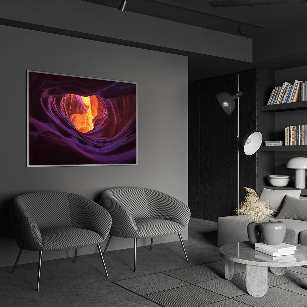 Transform your living space with the radiant beauty of this canyon artwork. The contrast of fiery orange highlights against deep purple shadows adds depth and drama to any interior. Whether displayed as a standalone piece or part of a gallery wall, this canyon artwork brings sophistication and warmth to your decor.