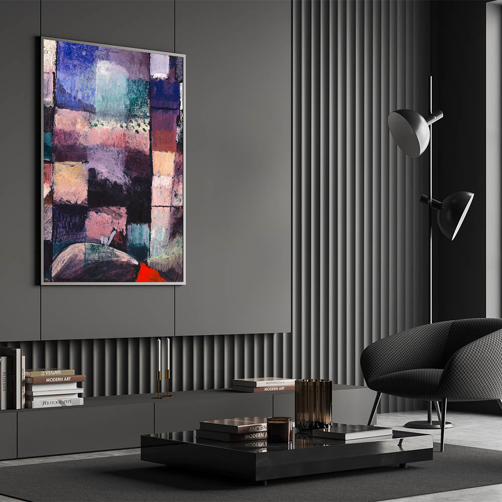 Immerse yourself in the rich colors and textures of Paul Klee's About a Motif from Hammamet, a stunning abstract art print inspired by the vibrant landscapes of Tunisia. This modern masterpiece features an array of deep purples, pinks, and greens, with textured brushstrokes that create a sense of movement and depth. Ideal for contemporary and eclectic decor styles, this artwork adds a sophisticated, artistic flair to any room. Perfect for those who appreciate abstract art, this piece brings both warmth and complexity, making it an excellent focal point in any setting.