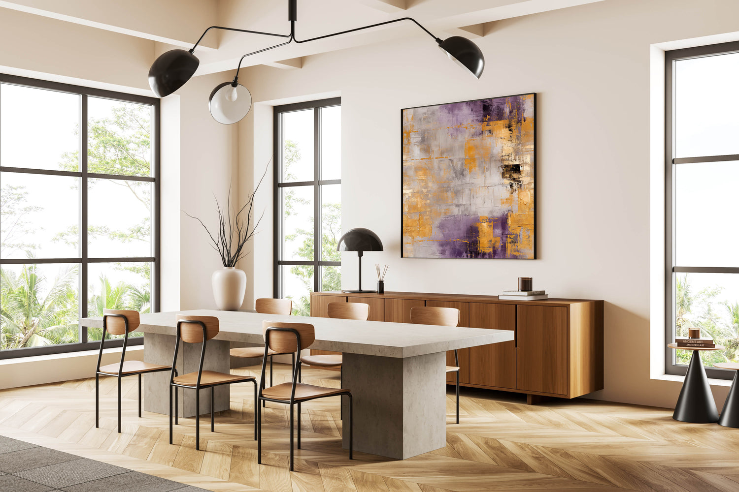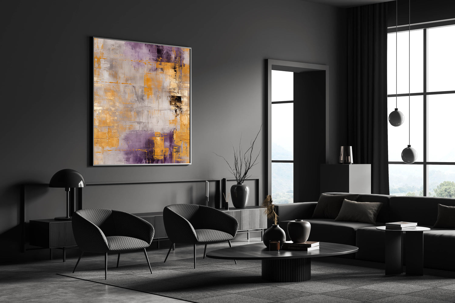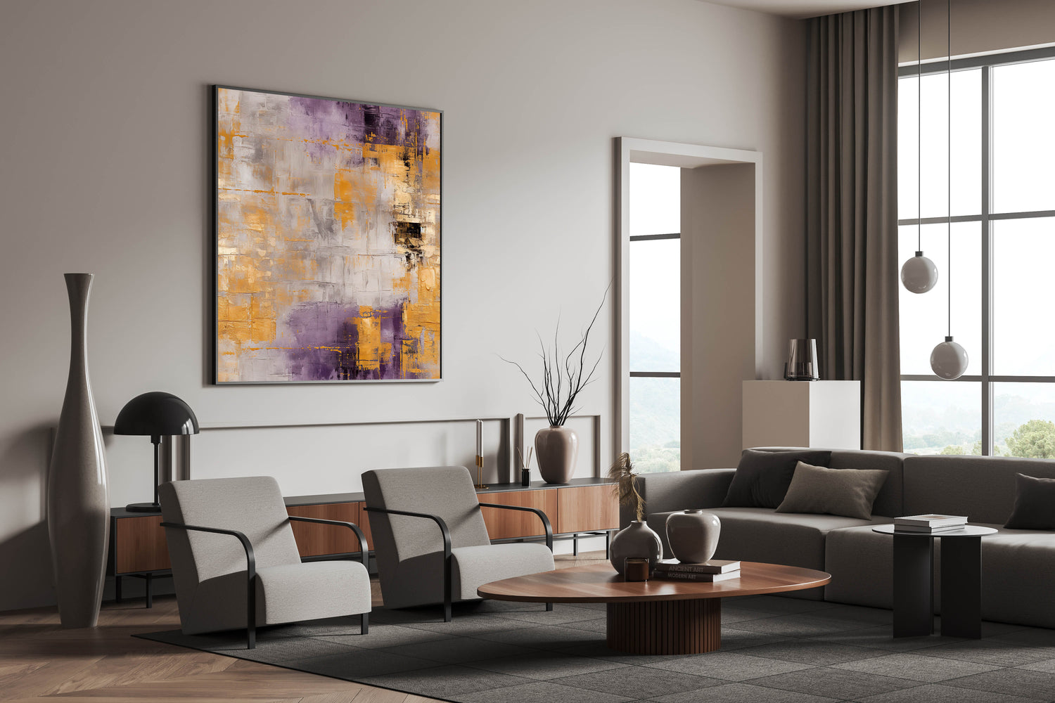 This artwork's unique color palette and geometric style make it an eye-catching choice for any room. Its combination of muted gray tones with the richness of purple and the shimmer of gold creates a balanced and sophisticated aesthetic.