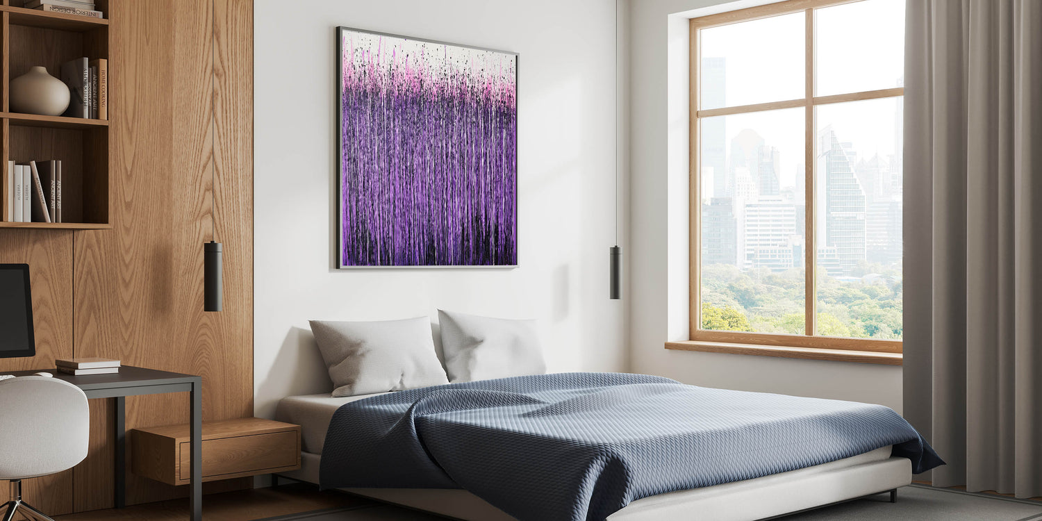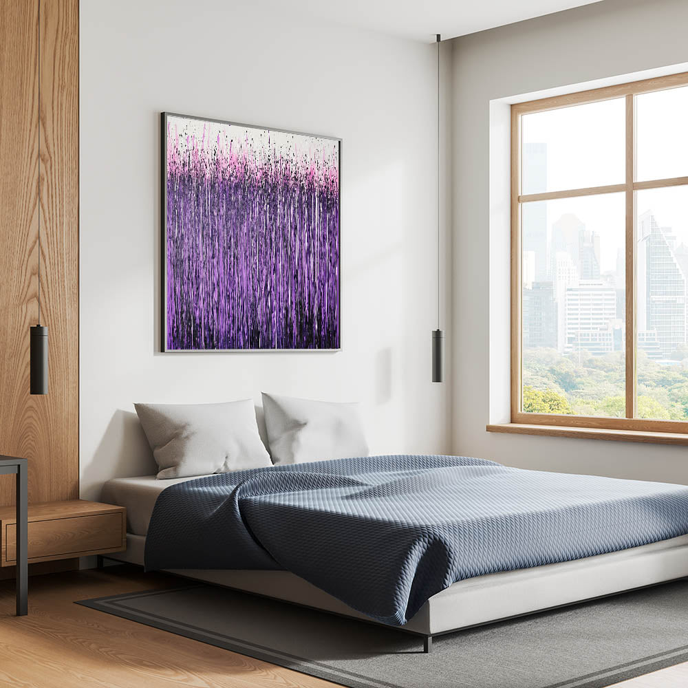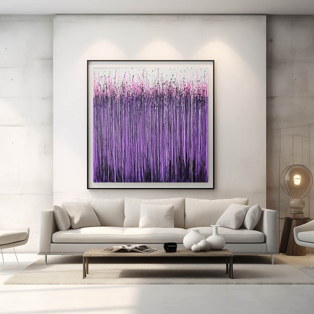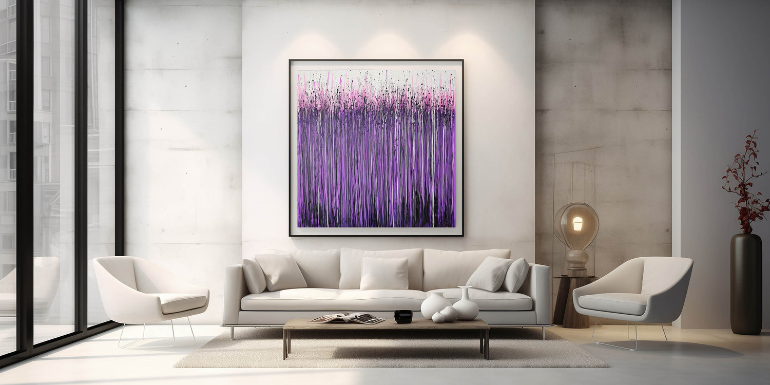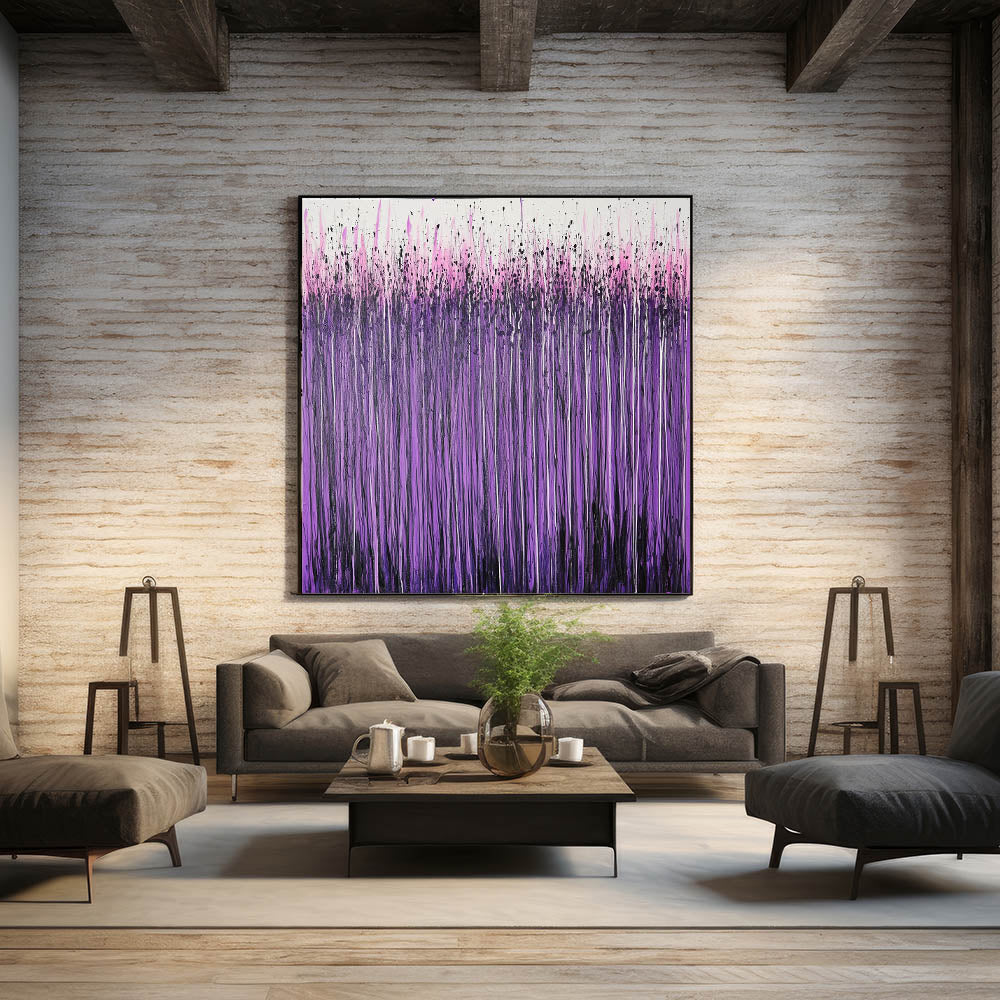 Make a statement with this living room wall art, featuring a striking abstract drip painting in vibrant purple, lilac, and hot pink tones. The cascading vertical streaks and energetic splatter effect create a visually dynamic and expressive design, making this modern wall art a perfect addition to contemporary interiors. Whether displayed as canvas wall art or framed wall art, this piece brings bold color and artistic depth to any space.