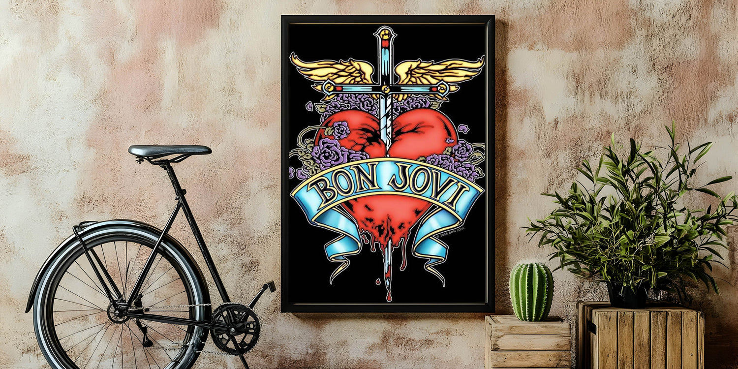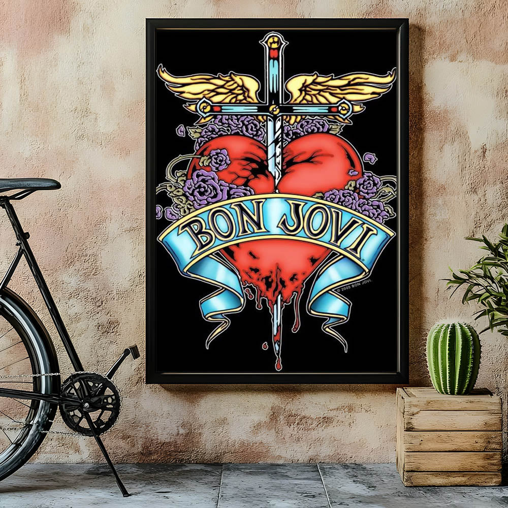 Celebrate the iconic Bon Jovi with this bold Tattoo Heart Poster. Featuring a striking design of a bleeding heart pierced by a sword with wings, this retro music wall art captures the essence of rock 'n' roll and classic retro style. Perfect for fans of Bon Jovi and lovers of vintage decor, this piece embodies the nostalgic art prints of the 80s and 90s, bringing a rockstar edge to any space.