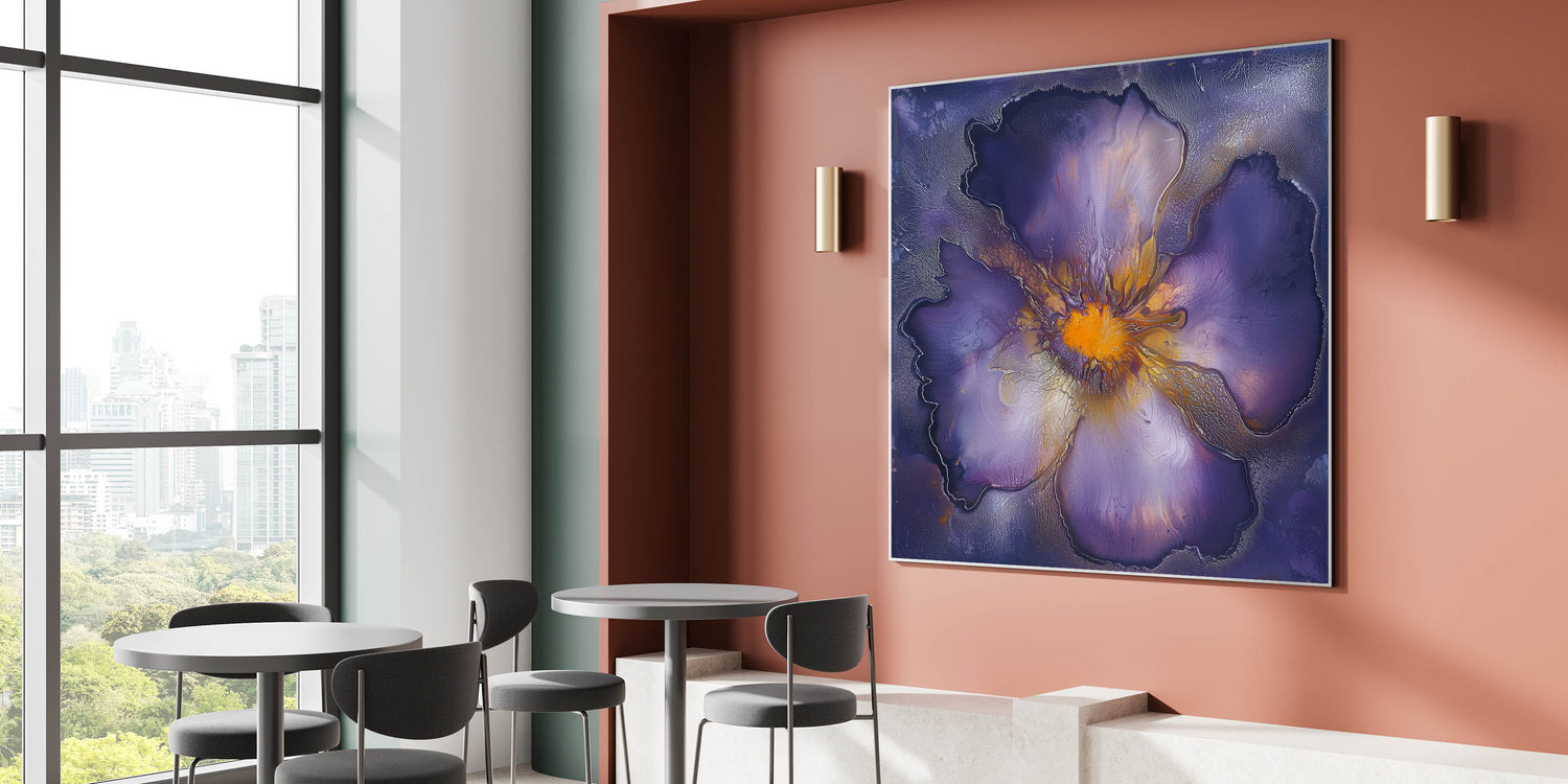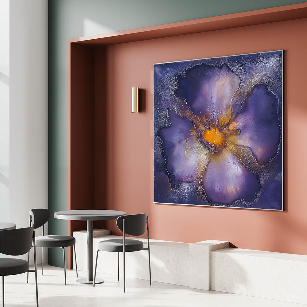 • Vivid Abstract Floral Design: A bold blend of purple hues and warm gold accents creates a striking centerpiece.