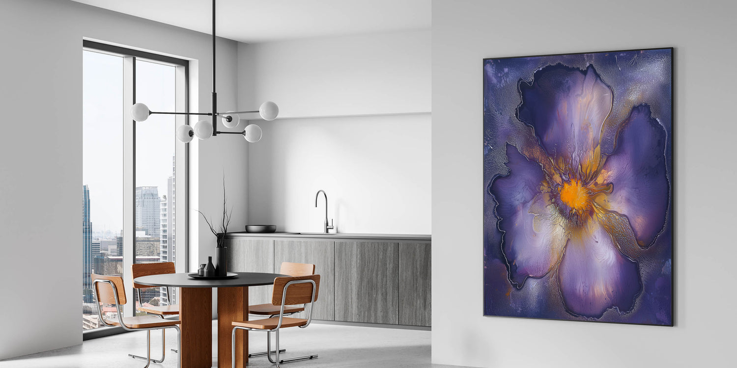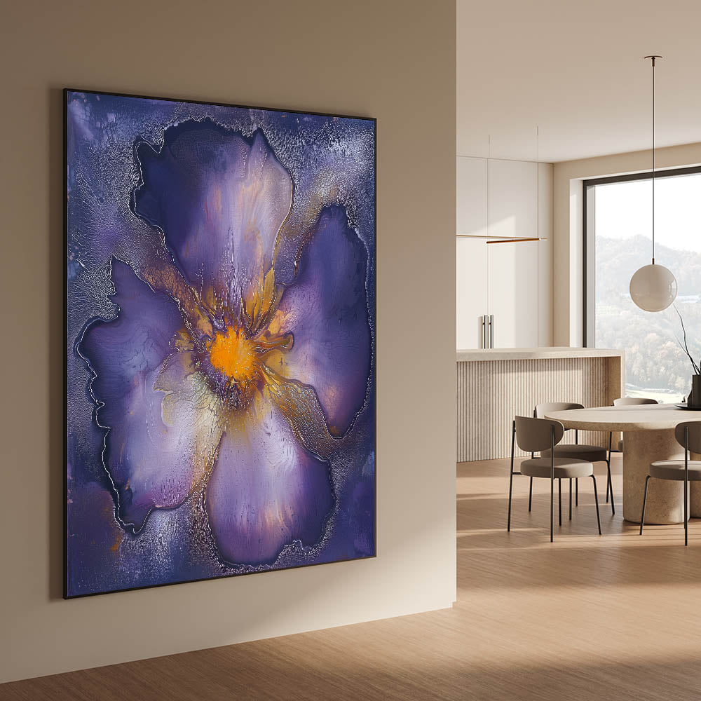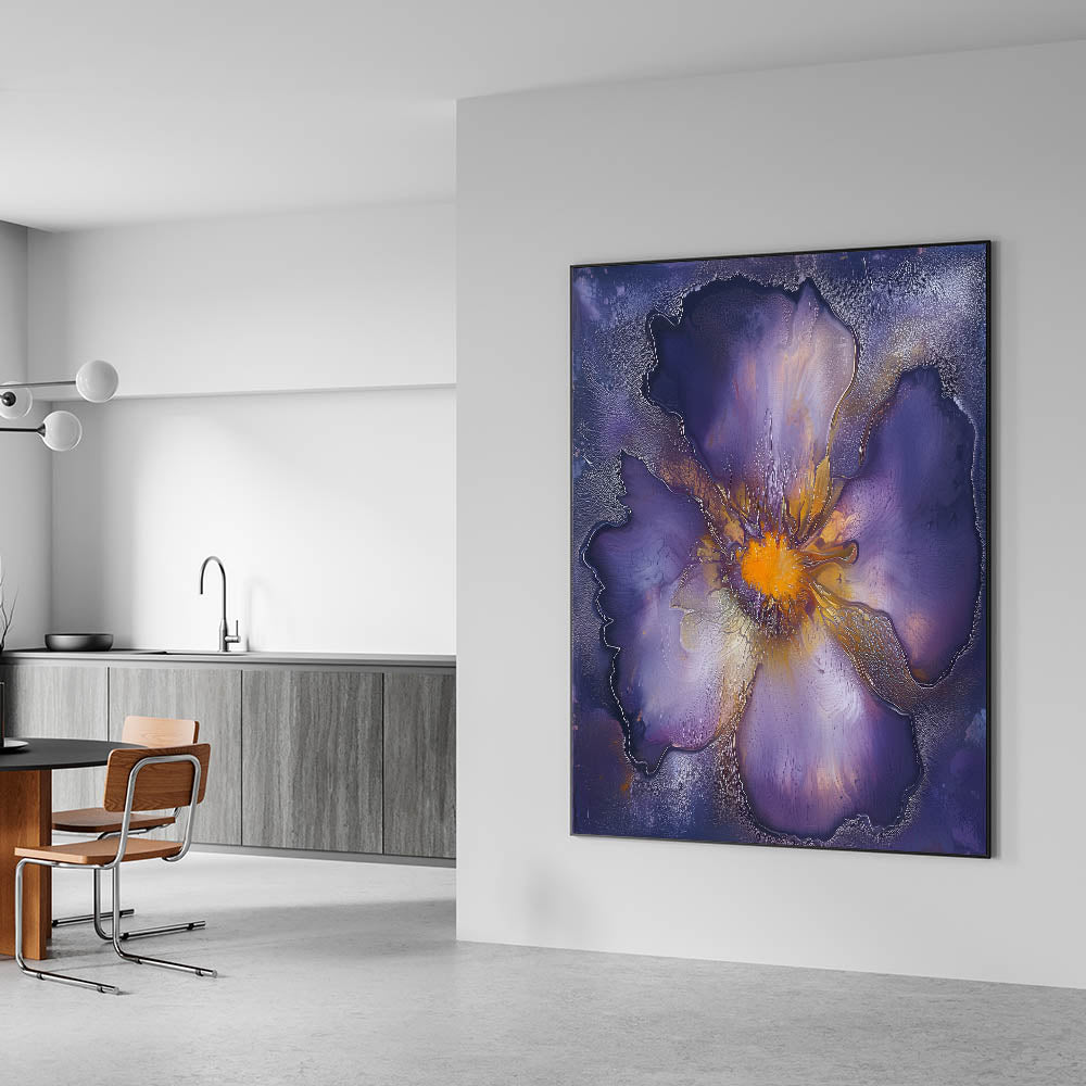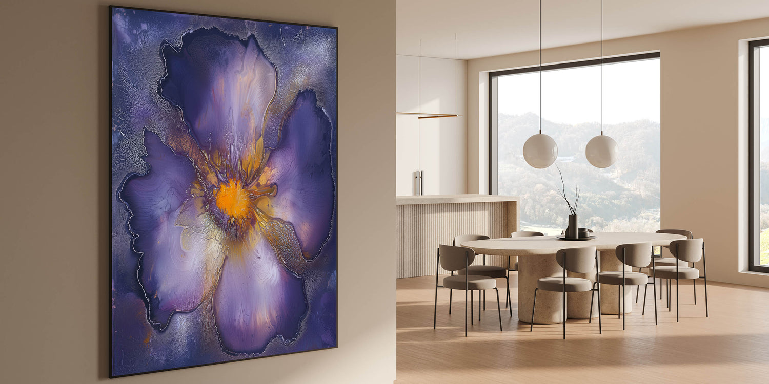 Bring a sophisticated and artistic touch to your dining space with this canvas art for dining area. Featuring a stunning abstract floral design, this piece blends deep purples, lavender, and golden yellow in a mesmerizing composition. The fluid textures and rich colors make this artwork an eye-catching addition to any modern dining room art collection.