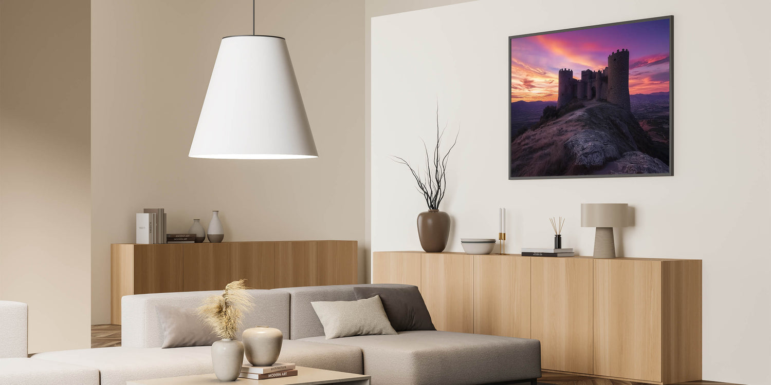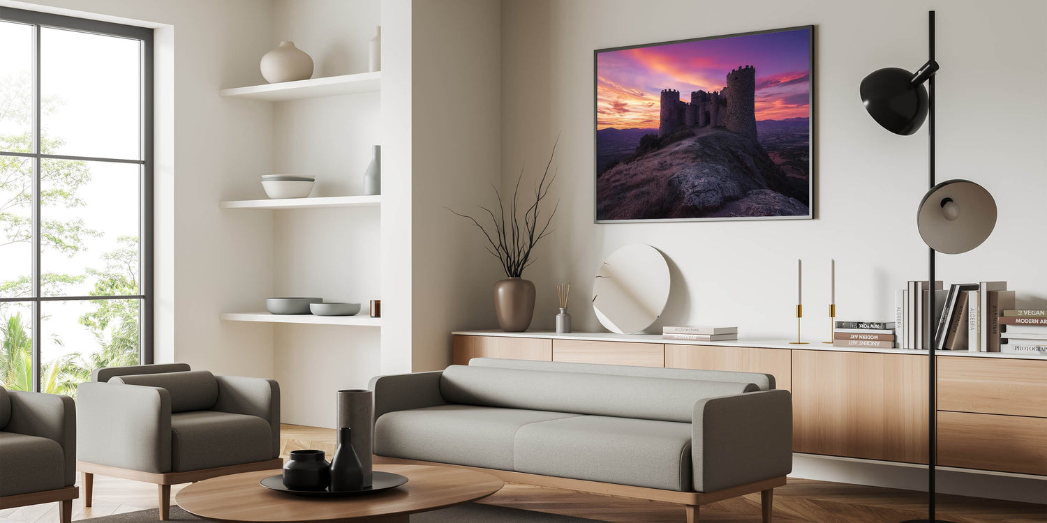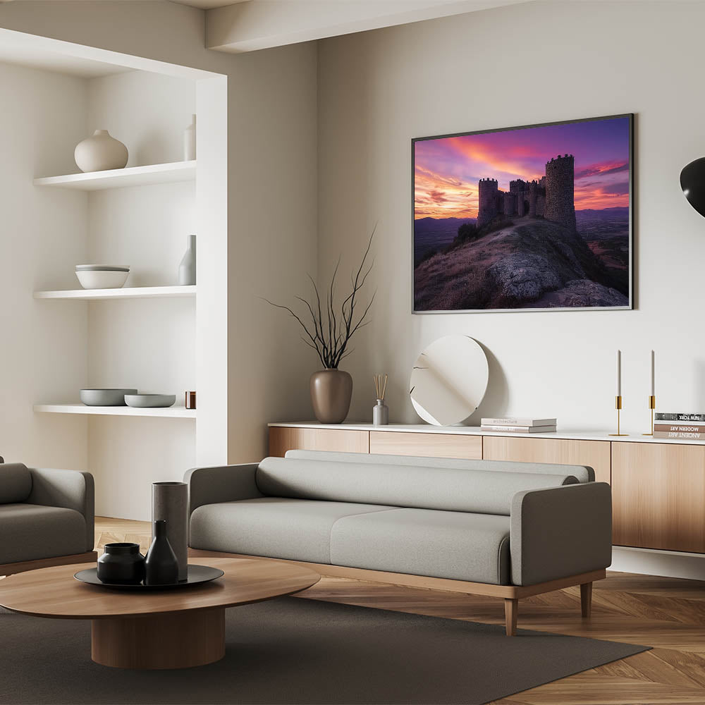 Transform your space with this unique castle artwork, perfect for lovers of history, sunsets, and dramatic landscapes.