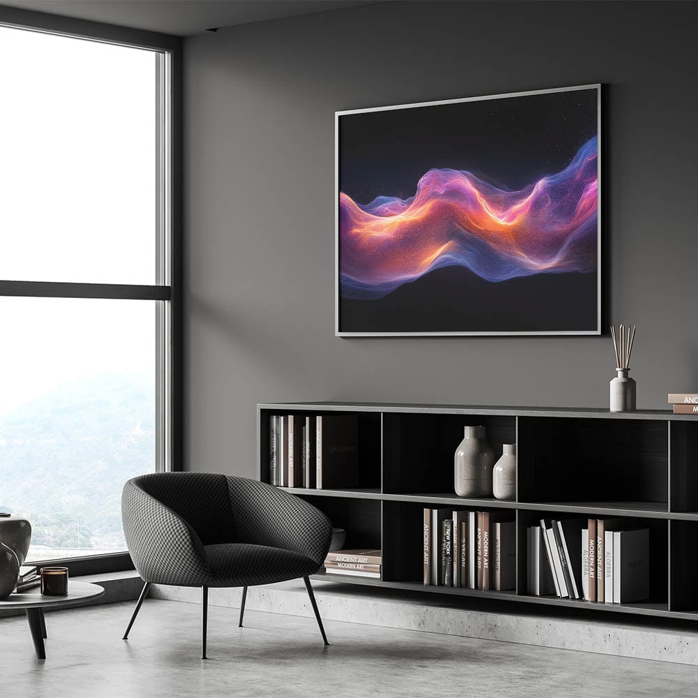 Infuse your interior with energy and elegance through Celestial Drift, a bold piece of fluid abstract wall art designed to captivate. Radiating with flowing hues of fiery orange, vivid pink, and deep purple against a jet-black background, this artwork evokes the feeling of movement, passion, and cosmic beauty.