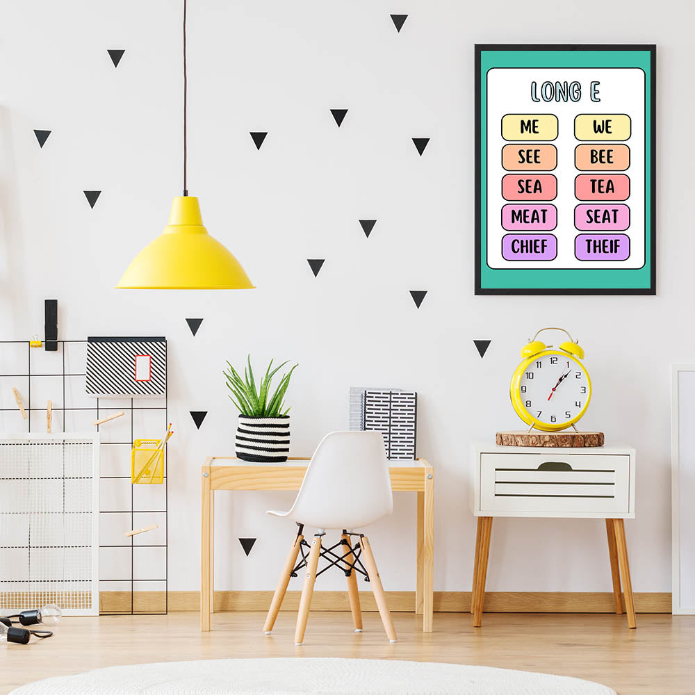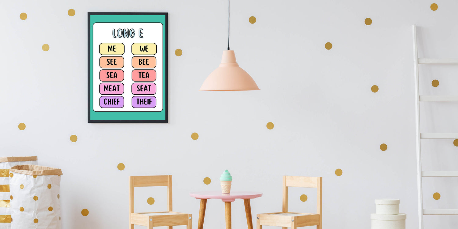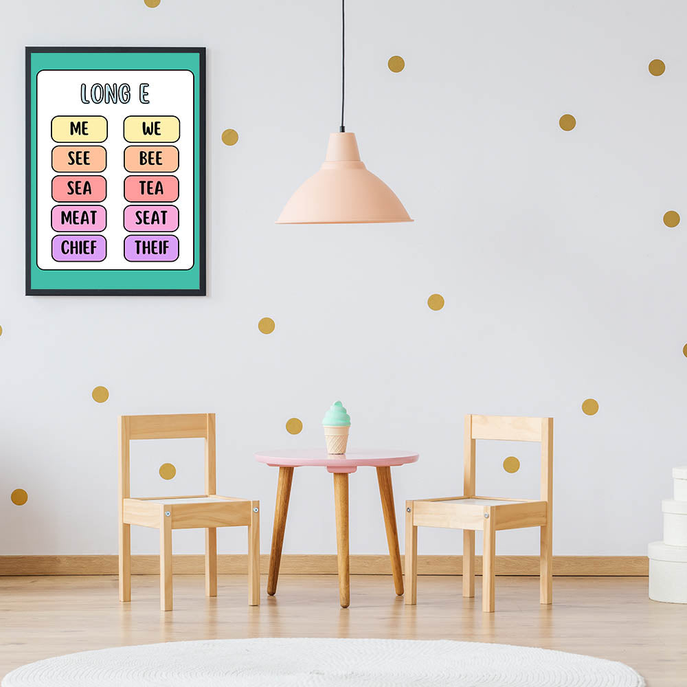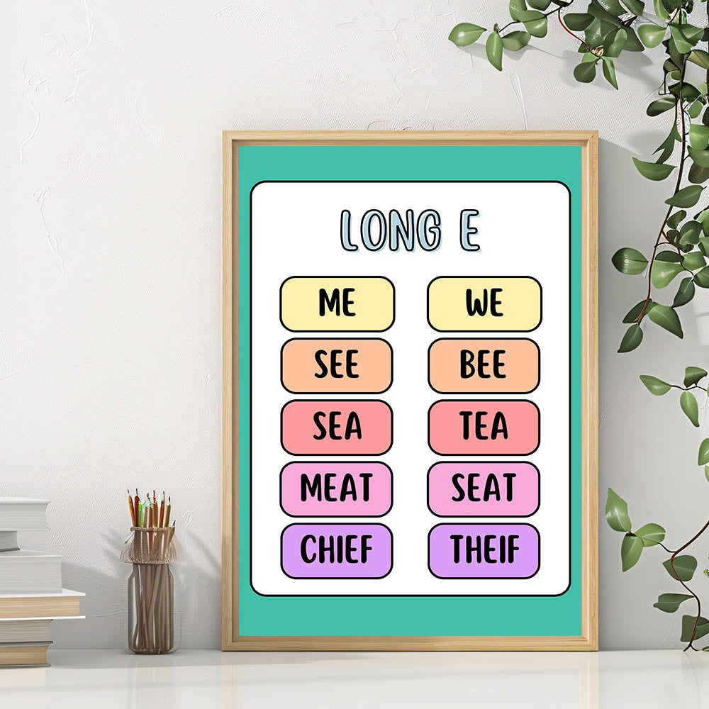 Teach phonics the fun way with this Children’s Learning Art Print focused on the Long E sound! Designed to help kids recognize and pronounce Long E words, this Educational Art for Kids’ Rooms is an essential tool for early reading development. Featuring easy-to-read words and bright visuals, this Classroom Learning Poster is perfect for nurseries, playrooms, and homeschool setups.