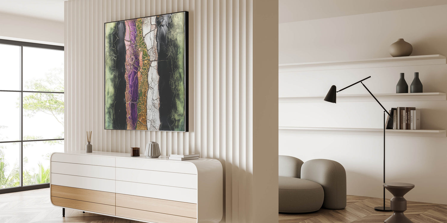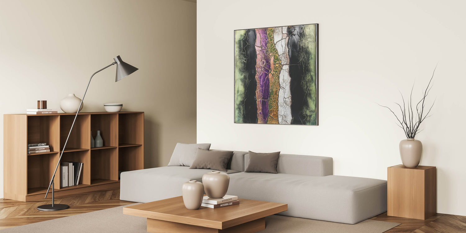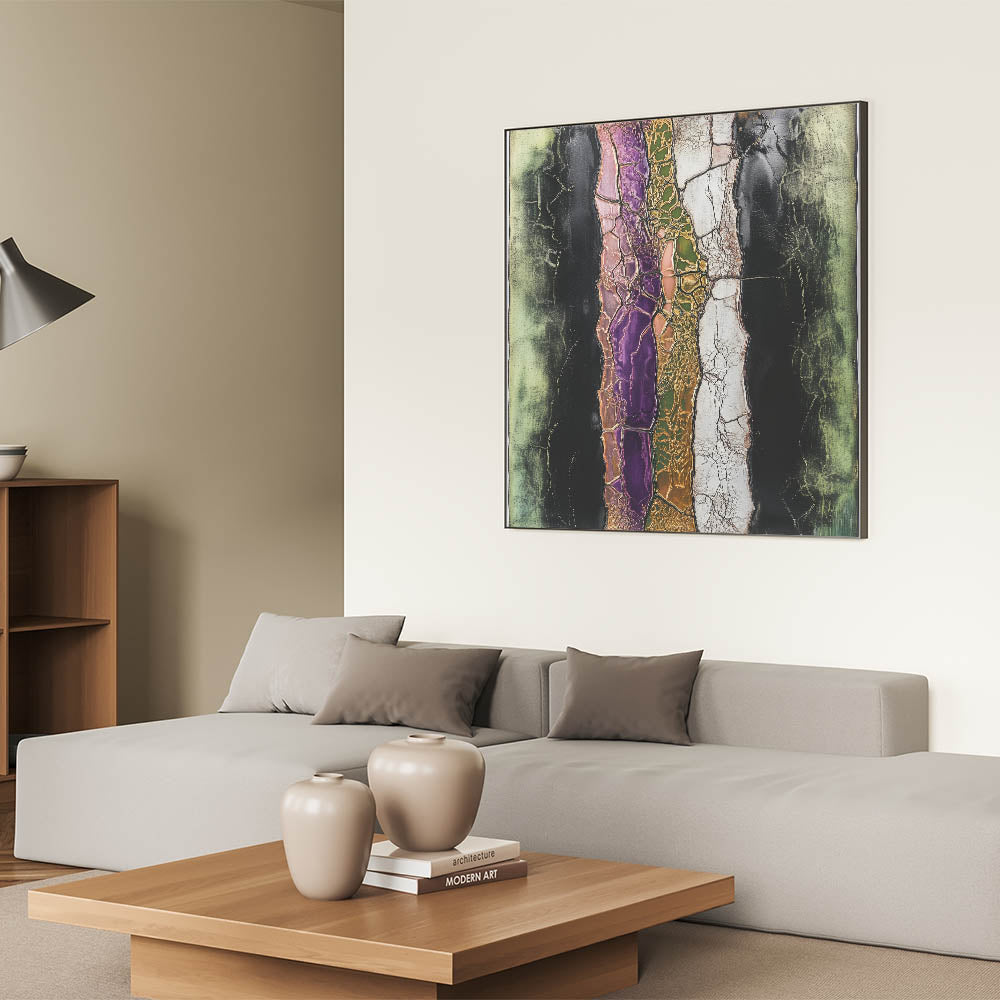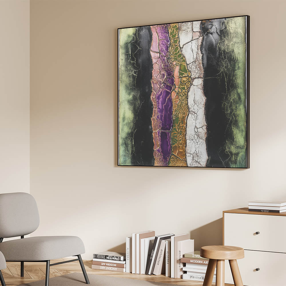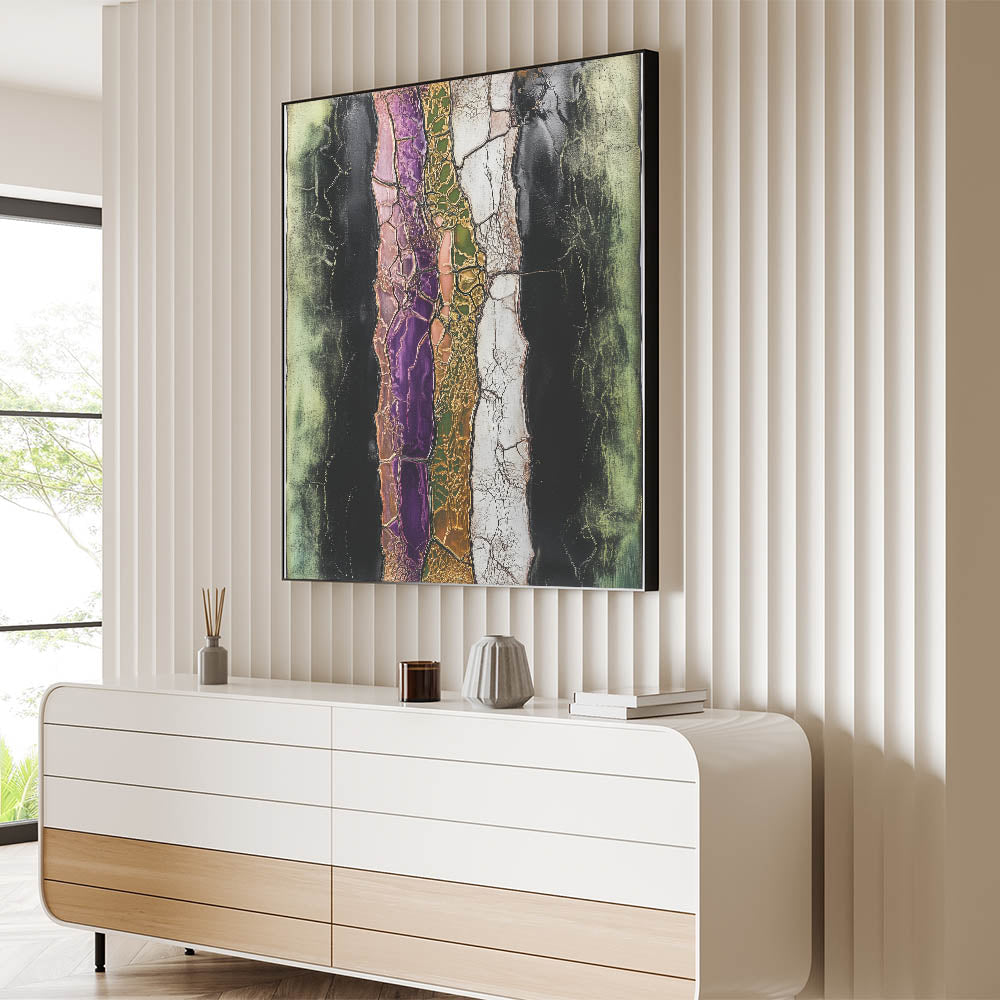 Discover the striking beauty of modern artistry with this captivating abstract floral art. Featuring a cracked layered texture, this artwork highlights vibrant tones of purple, green, and pink, accentuated by metallic gold and soft black contrasts. The intricate details and bold design make it an eye-catching statement piece for any space.