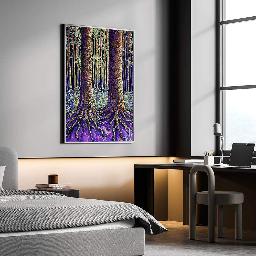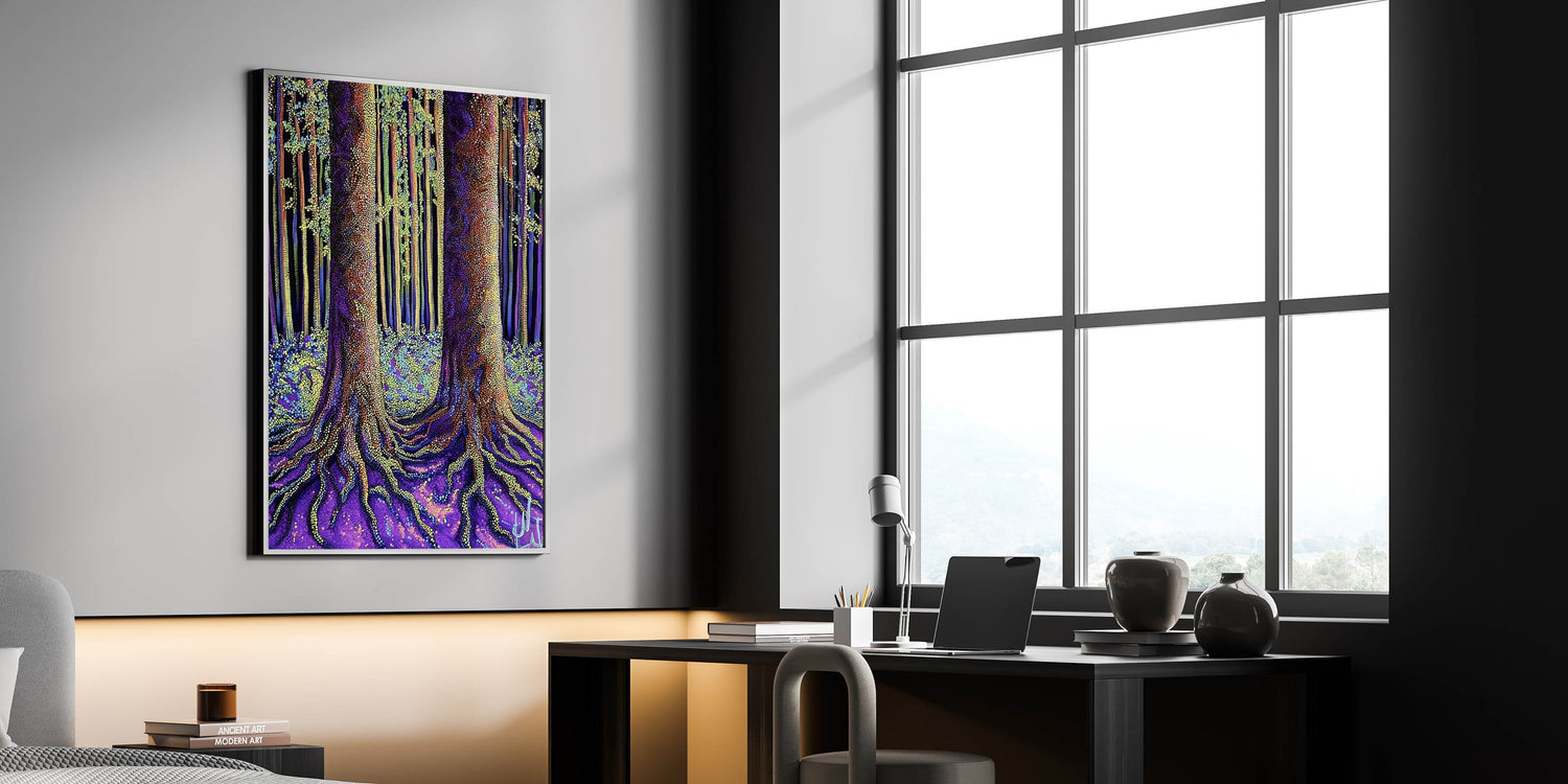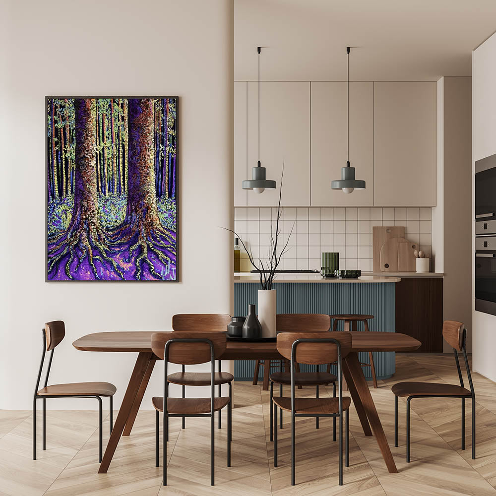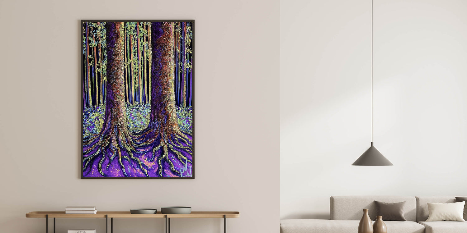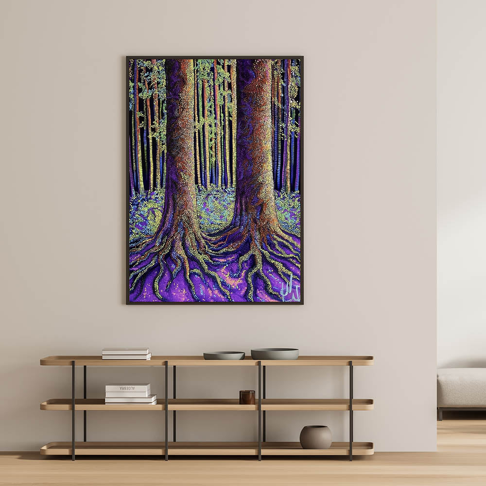 Immerse yourself in the mystical beauty of this abstract forest wall art. Featuring vibrant shades of purple, gold, green, and earthy brown, this artwork captures the enchanting essence of an illuminated woodland scene. The intricate pointillist-style dot detailing and rich textures bring depth and movement, making it a perfect statement piece for any modern living room decor.