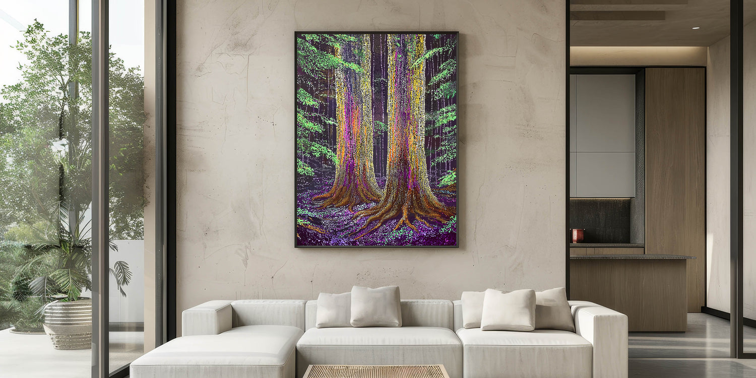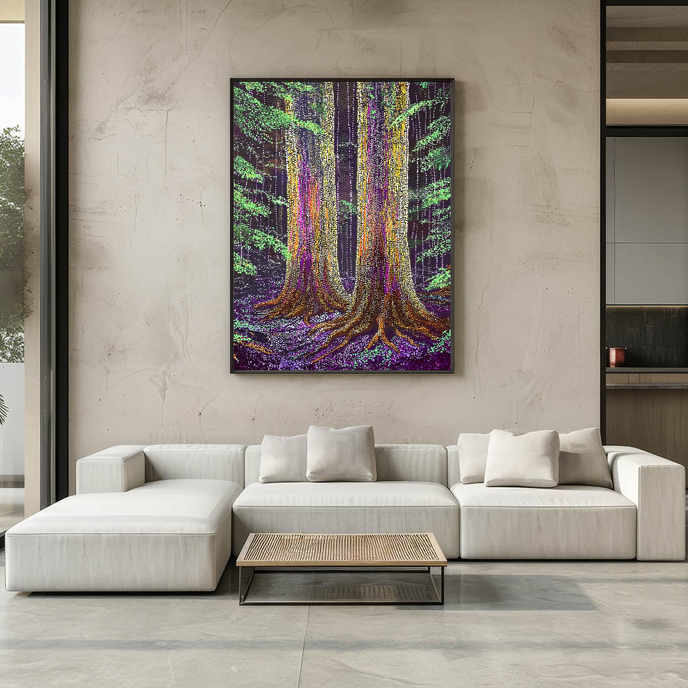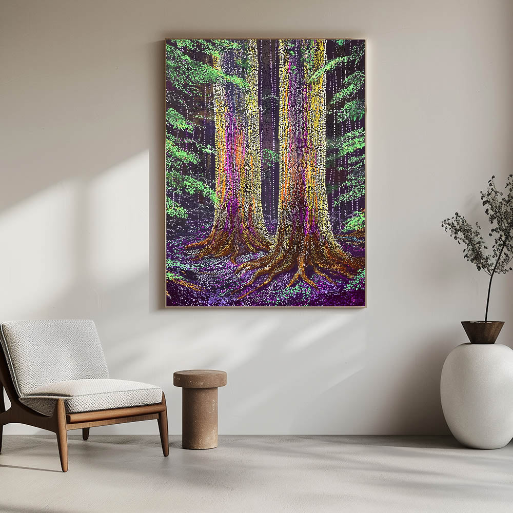 Transform your space with the enchanting glow of this abstract forest wall art. Featuring vibrant hues of gold, purple, and green, this mesmerizing artwork captures the magic of towering trees bathed in luminous light. The intricate pointillist-style dot detailing enhances depth and texture, making this a striking focal point for any modern living room decor.
