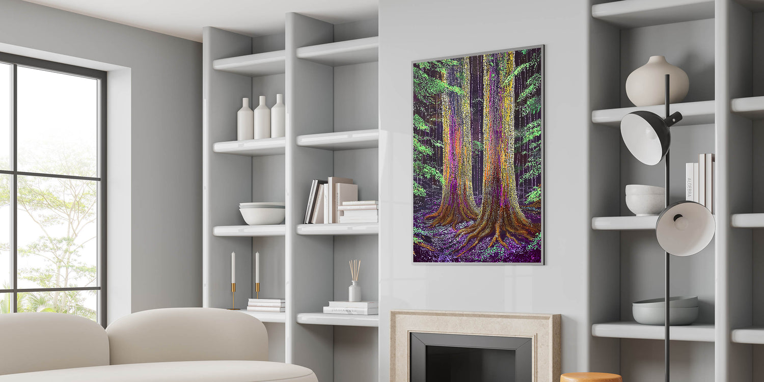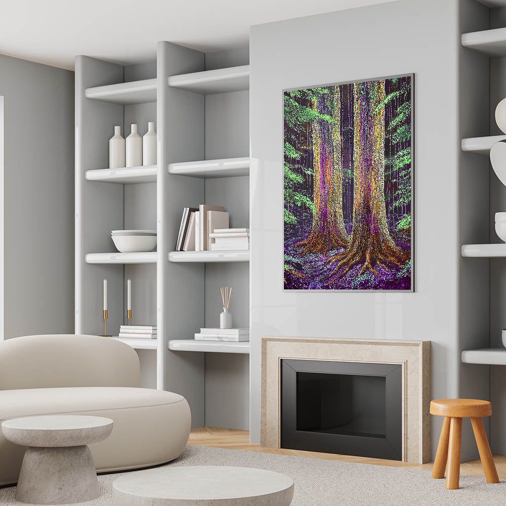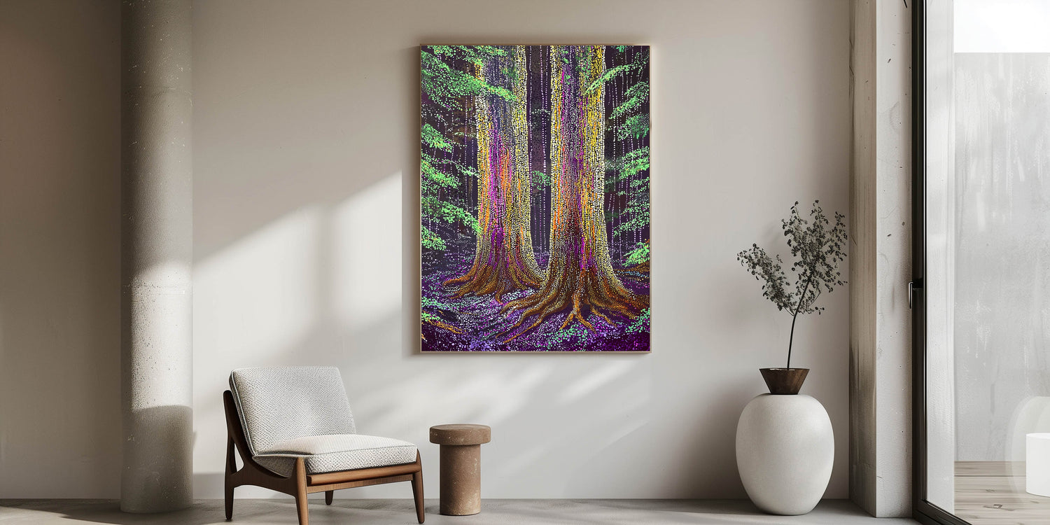 Transform your space with the enchanting glow of this abstract forest wall art. Featuring vibrant hues of gold, purple, and green, this mesmerizing artwork captures the magic of towering trees bathed in luminous light. The intricate pointillist-style dot detailing enhances depth and texture, making this a striking focal point for any modern living room decor.