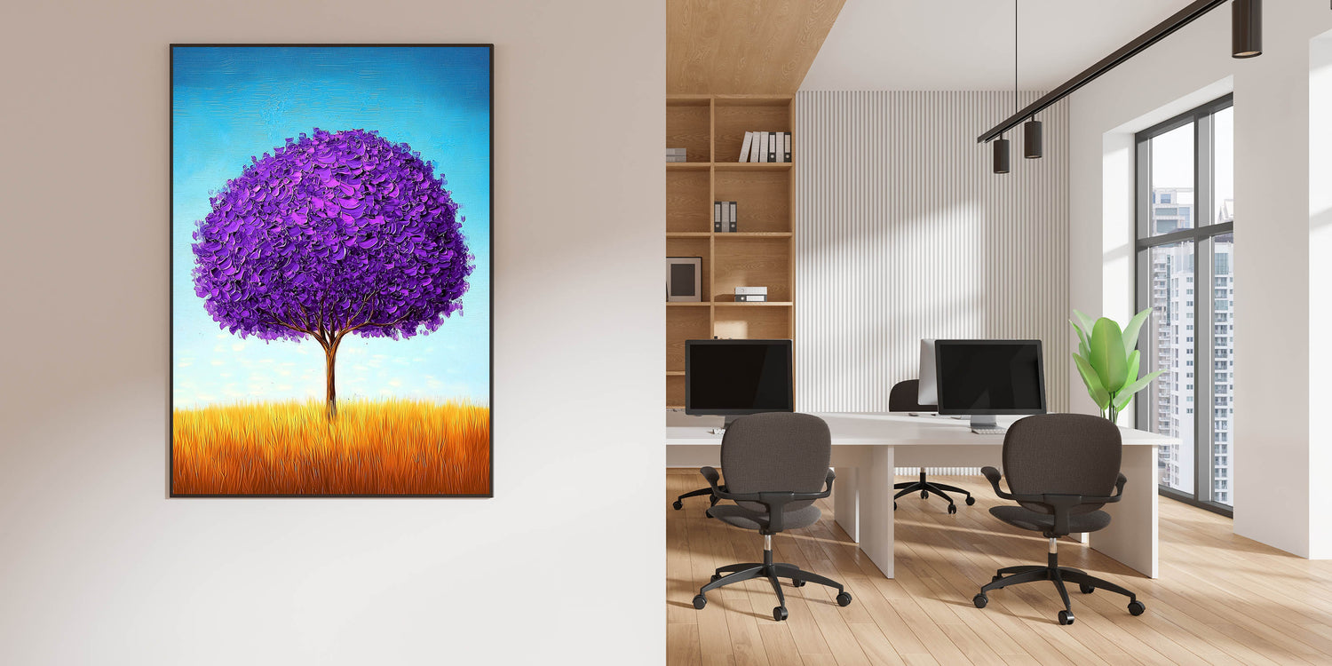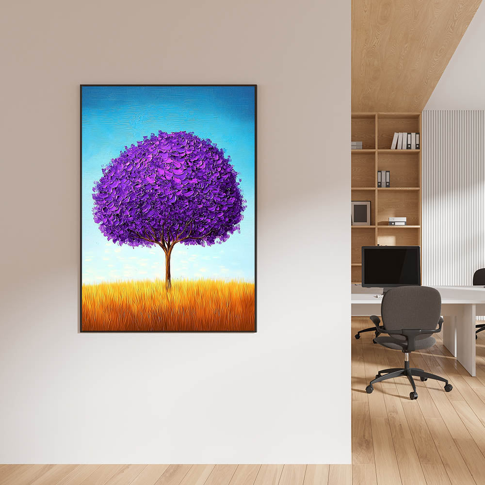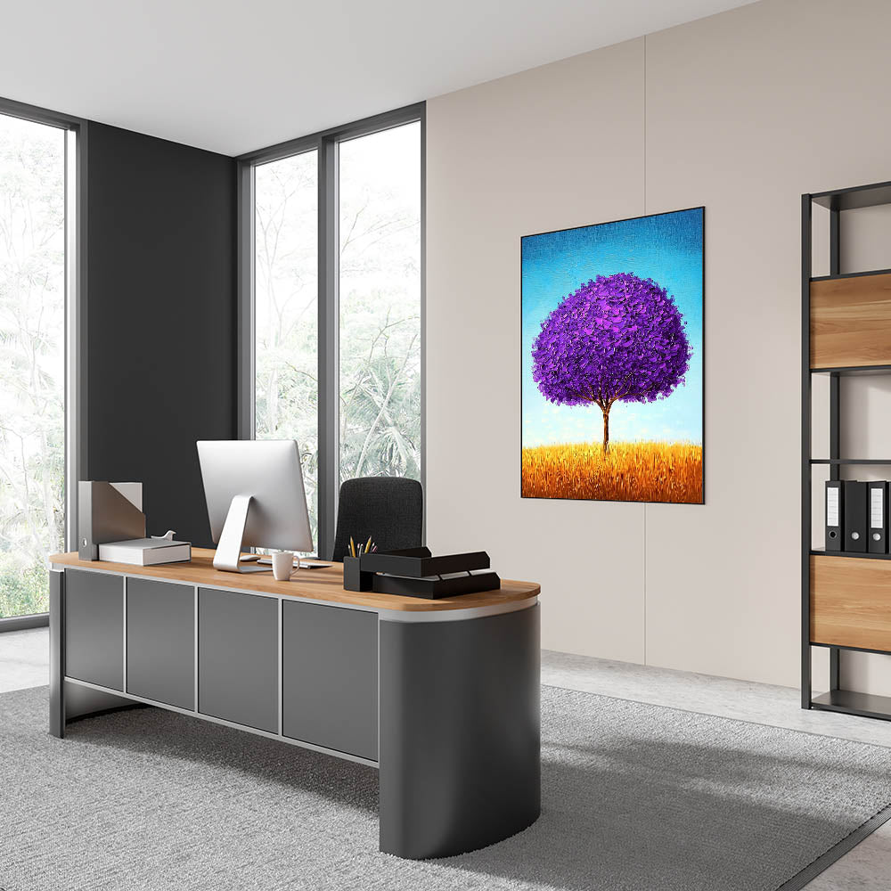 Enhance your workspace with this framed office art, featuring a mesmerizing purple tree set in a golden field under a bright blue sky. The vibrant contrast of colors and textured brushstrokes create a visually striking and contemporary office décor piece, perfect for professional spaces, executive suites, and creative work environments.