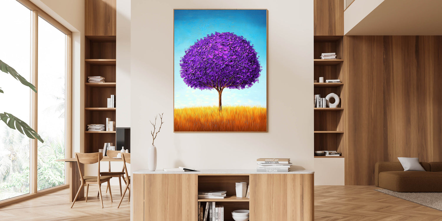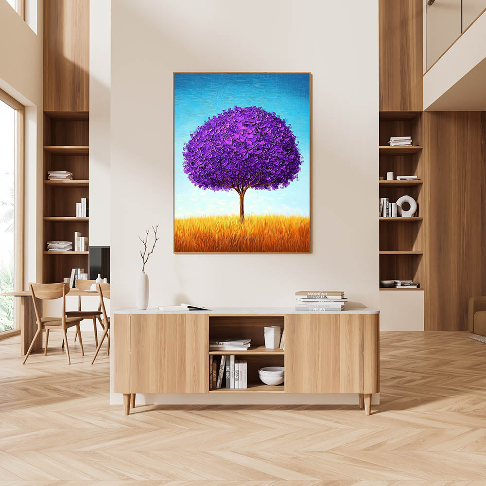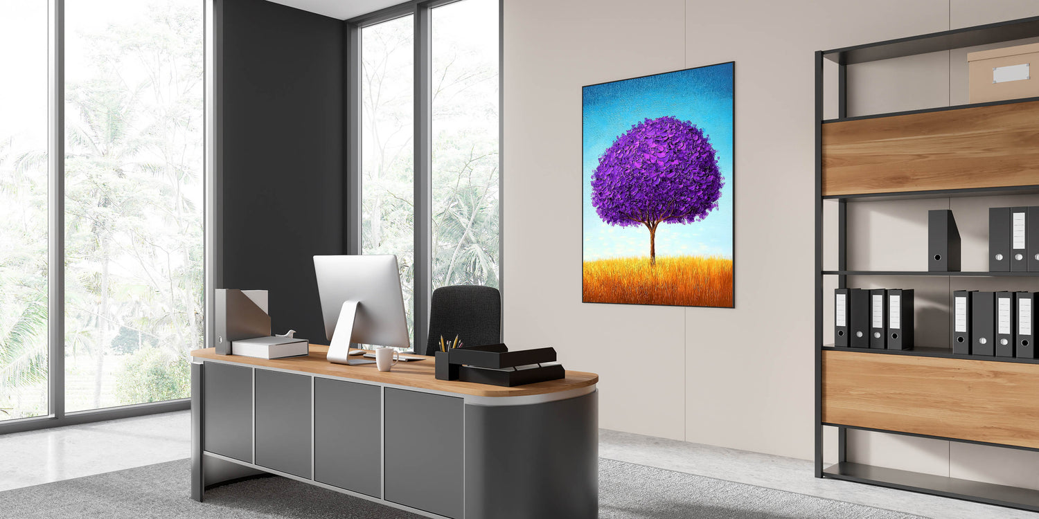 Enhance your workspace with this framed office art, featuring a mesmerizing purple tree set in a golden field under a bright blue sky. The vibrant contrast of colors and textured brushstrokes create a visually striking and contemporary office décor piece, perfect for professional spaces, executive suites, and creative work environments.