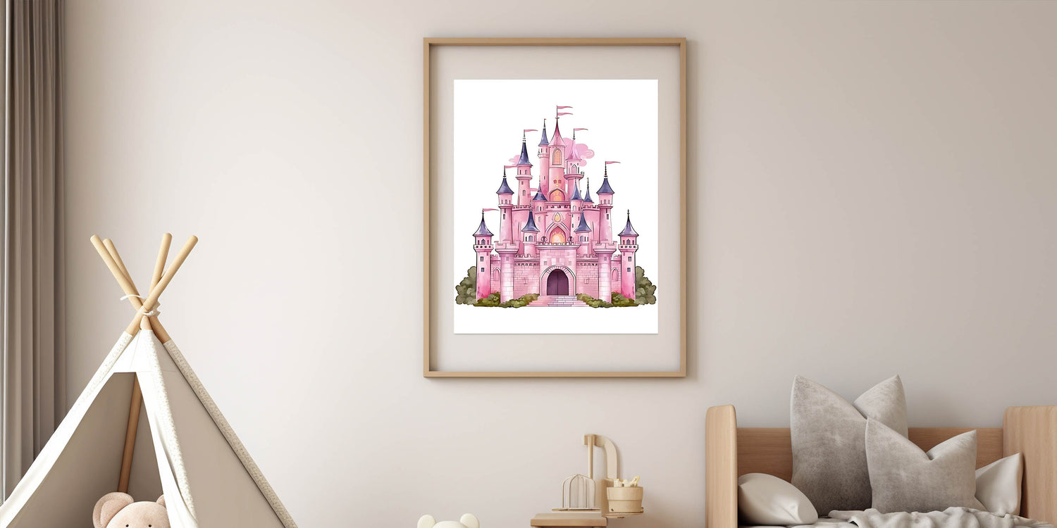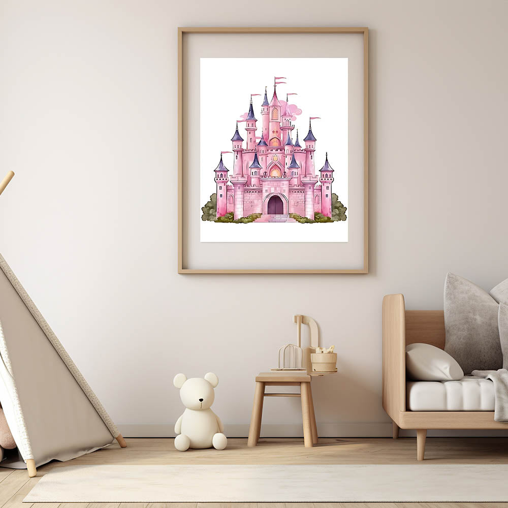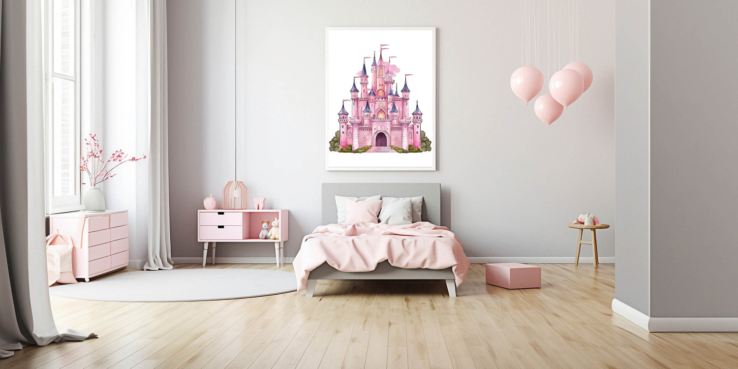 Turn your child's space into a fairy tale with this enchanting Girls Bedroom Art featuring a majestic pink castle. Designed with dreamy pastel shades of pink, purple, and soft greenery, this illustration is perfect for creating a magical atmosphere in any nursery or playroom. The whimsical details make it an ideal choice for children's wall decor and kids room art prints.