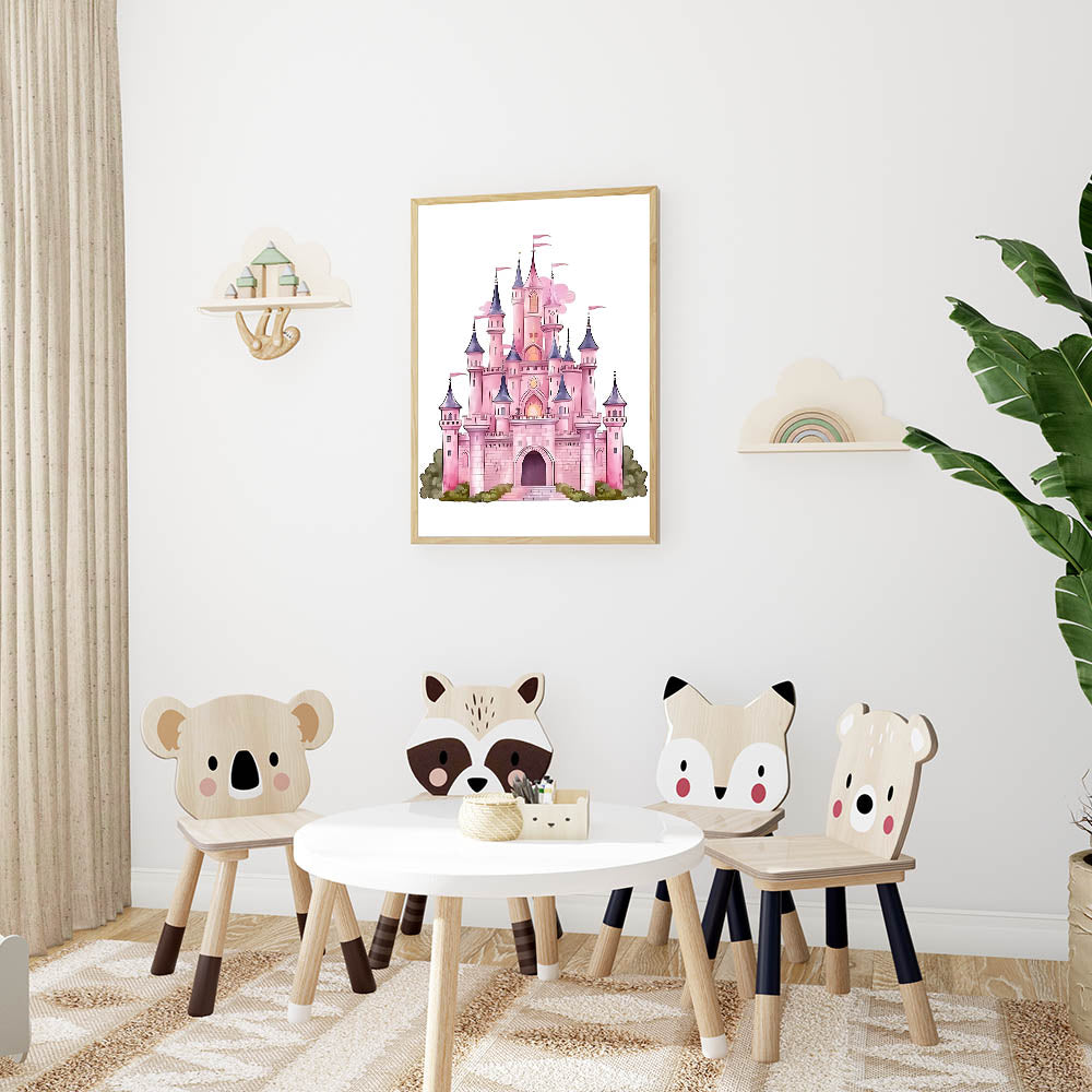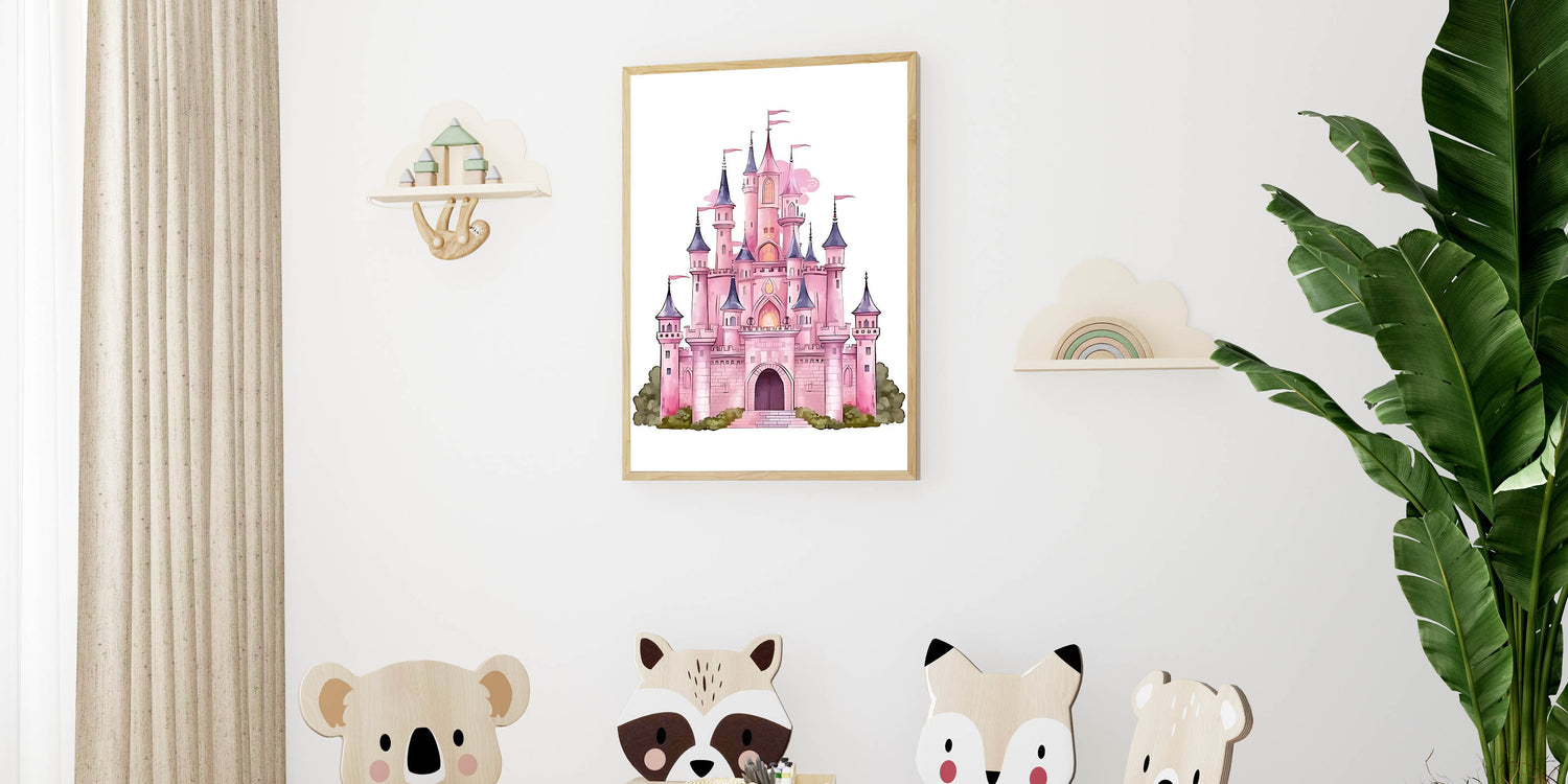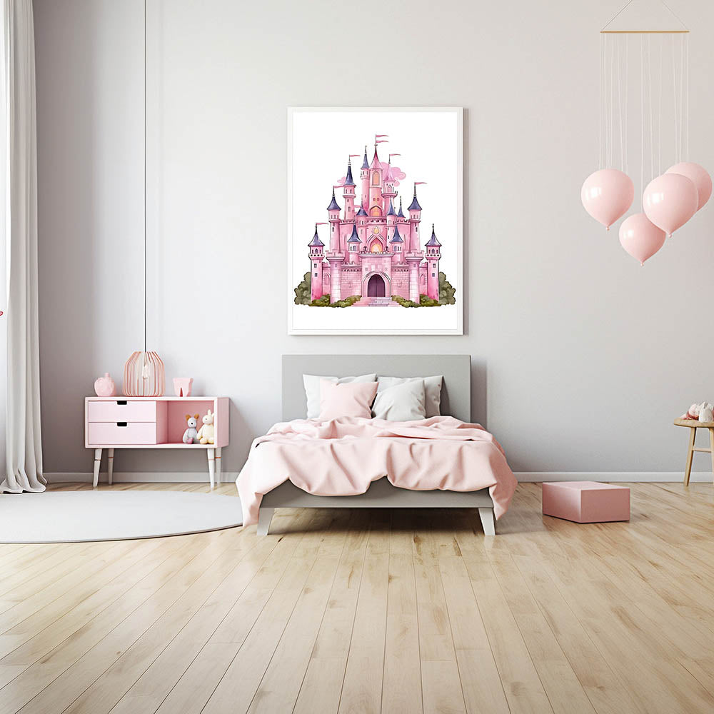Turn your child's space into a fairy tale with this enchanting Girls Bedroom Art featuring a majestic pink castle. Designed with dreamy pastel shades of pink, purple, and soft greenery, this illustration is perfect for creating a magical atmosphere in any nursery or playroom. The whimsical details make it an ideal choice for children's wall decor and kids room art prints.