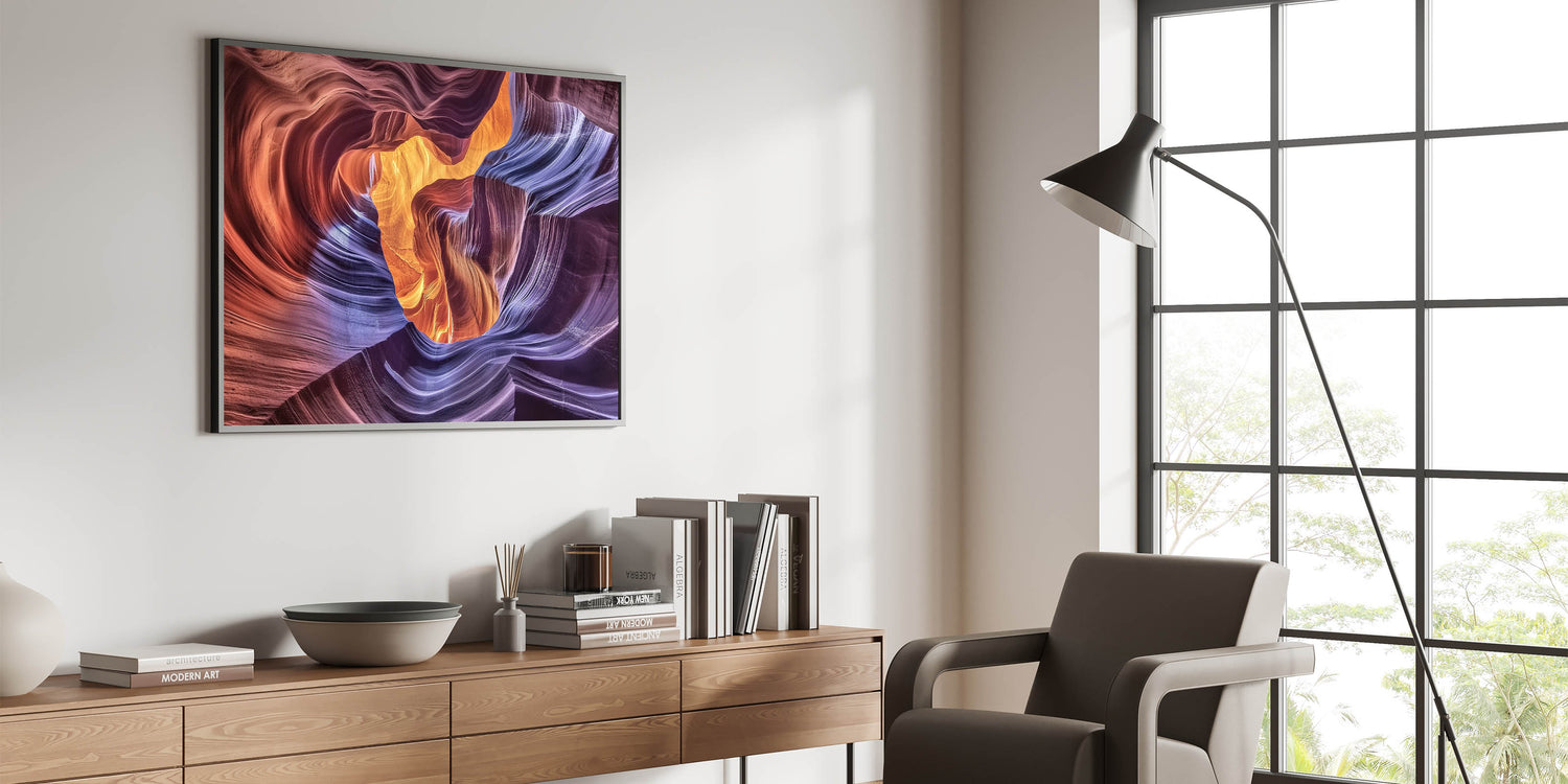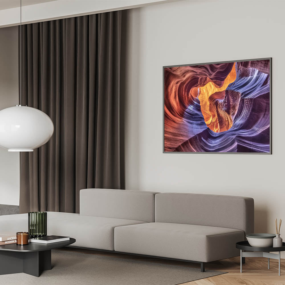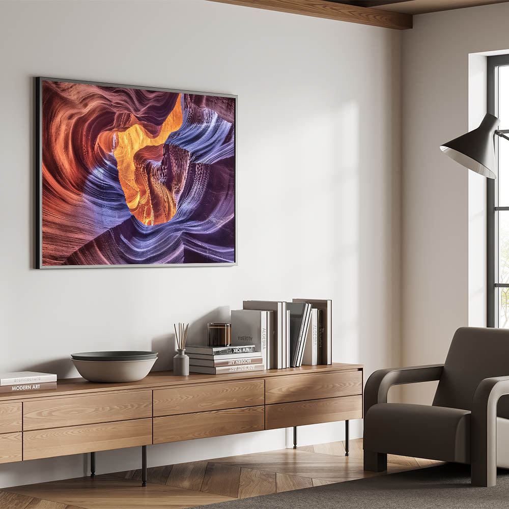 Transform your space with the radiant beauty of this Illuminated Canyon Art. Featuring an extraordinary blend of light and color, this artwork captures the flowing curves of sandstone bathed in warm orange and vibrant purple hues. The intricate patterns of the canyon walls create a mesmerizing abstract design, evoking a sense of wonder and tranquility. Ideal for living rooms, offices, or bedrooms, this piece is a perfect addition for modern and nature-inspired decor.