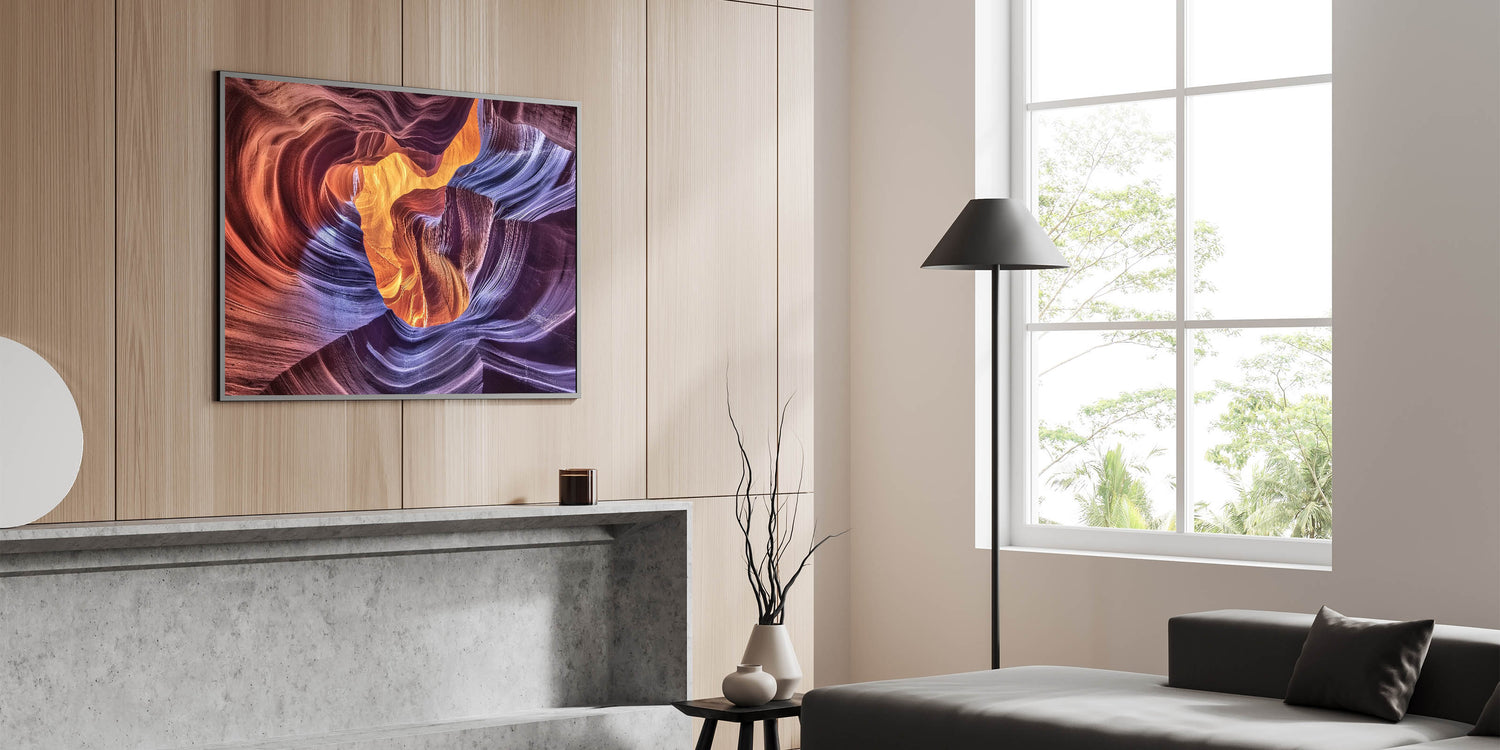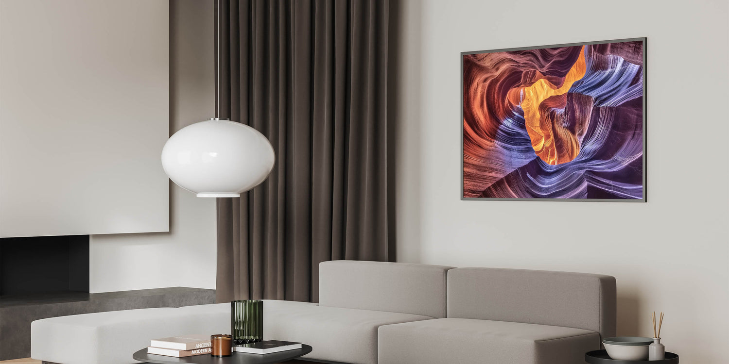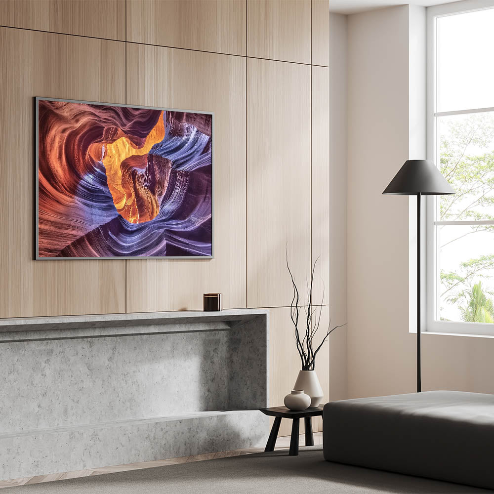 Transform your space with the radiant beauty of this Illuminated Canyon Art. Featuring an extraordinary blend of light and color, this artwork captures the flowing curves of sandstone bathed in warm orange and vibrant purple hues. The intricate patterns of the canyon walls create a mesmerizing abstract design, evoking a sense of wonder and tranquility. Ideal for living rooms, offices, or bedrooms, this piece is a perfect addition for modern and nature-inspired decor.