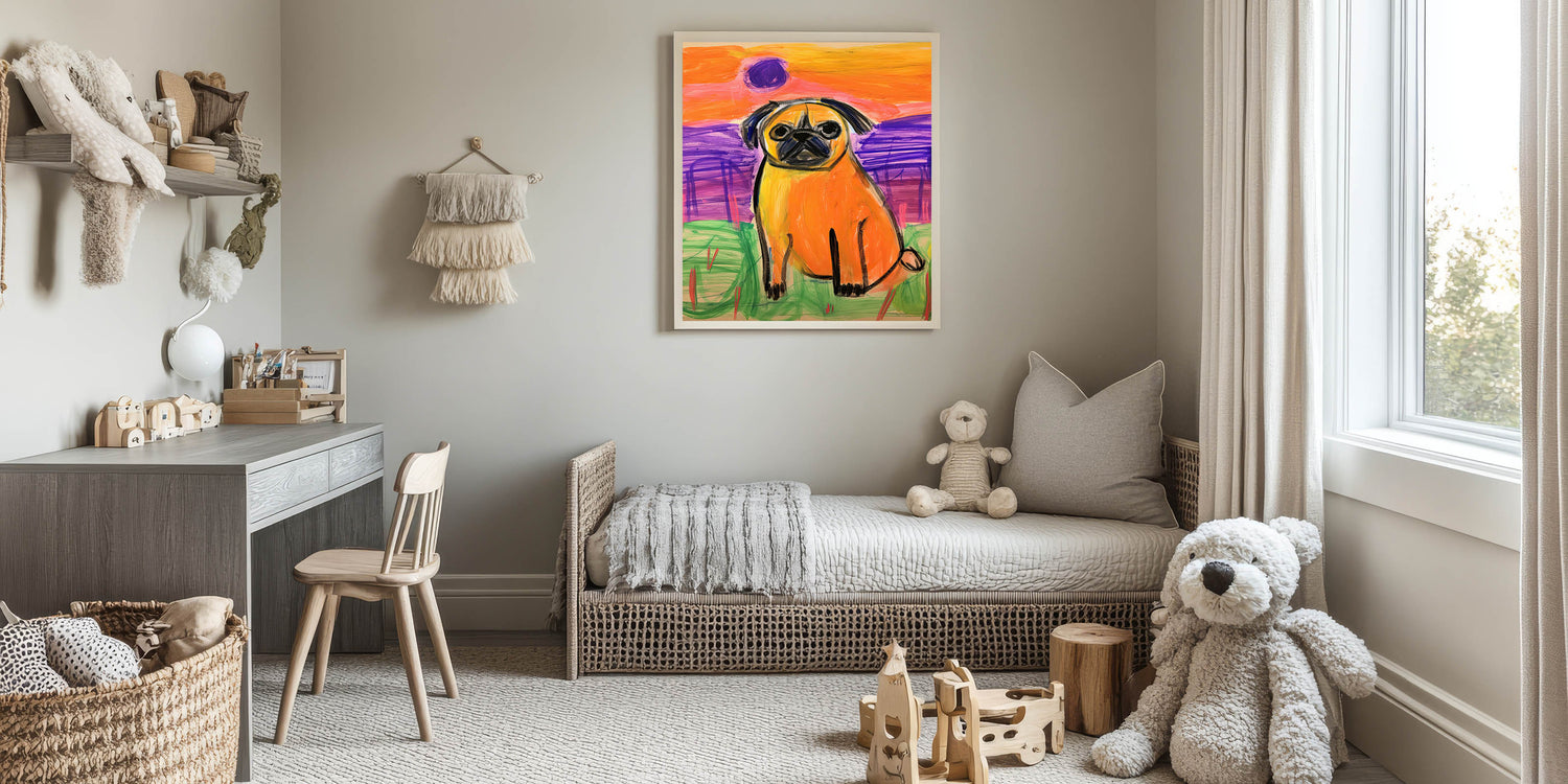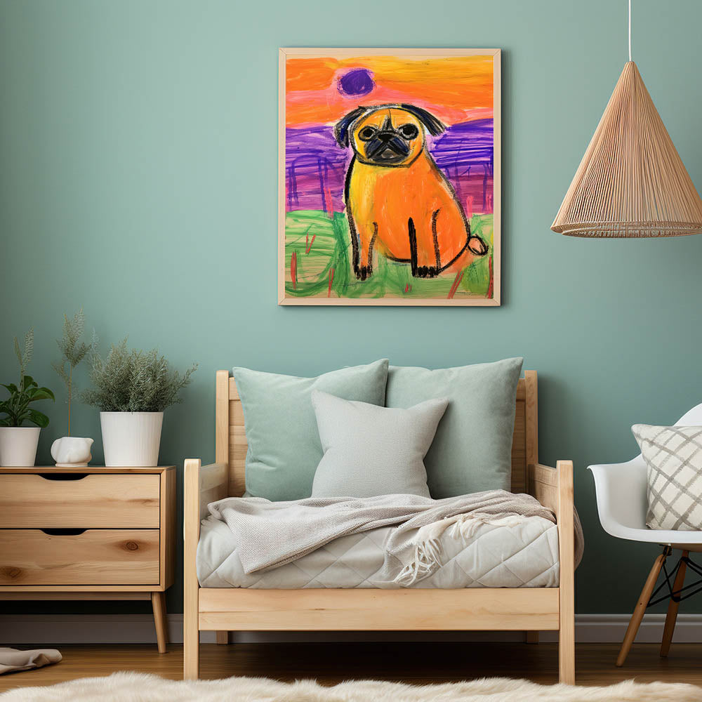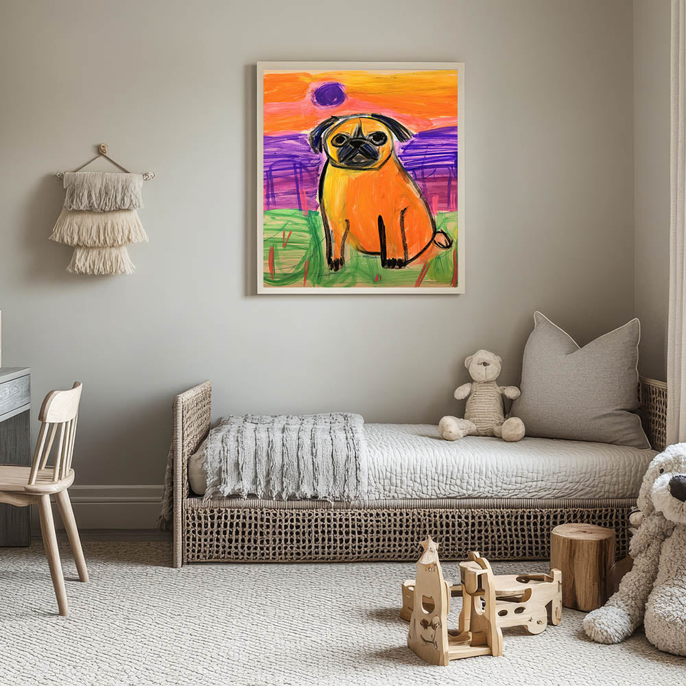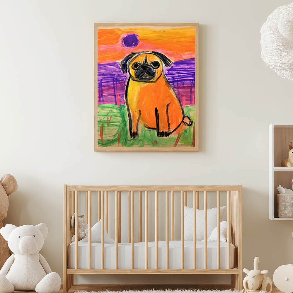 Add charm and warmth to your child’s space with this Kids Room Wall Art, featuring an adorable pug against a bold sunset landscape. The vibrant orange, purple, yellow, and green tones create a cheerful and eye-catching design, making it a perfect addition to nurseries, playrooms, or children's bedrooms.