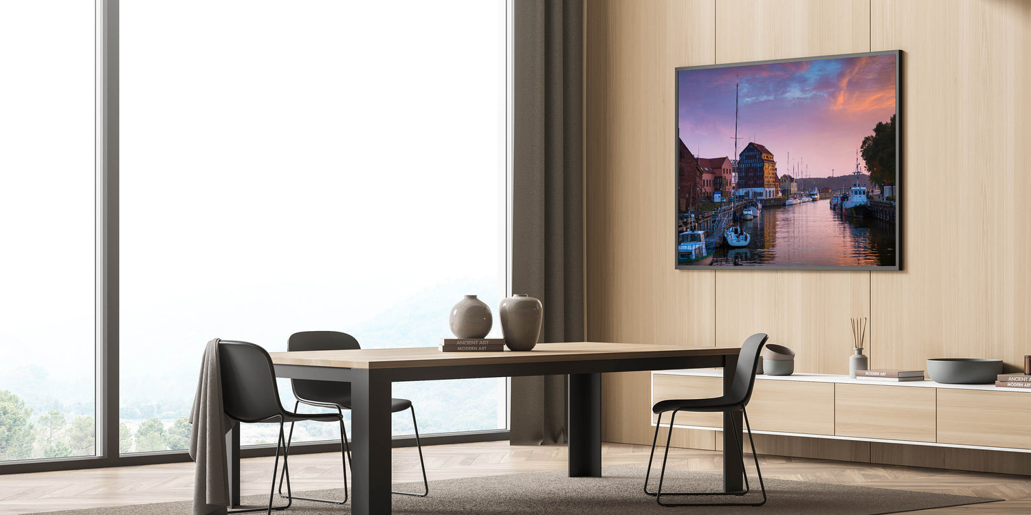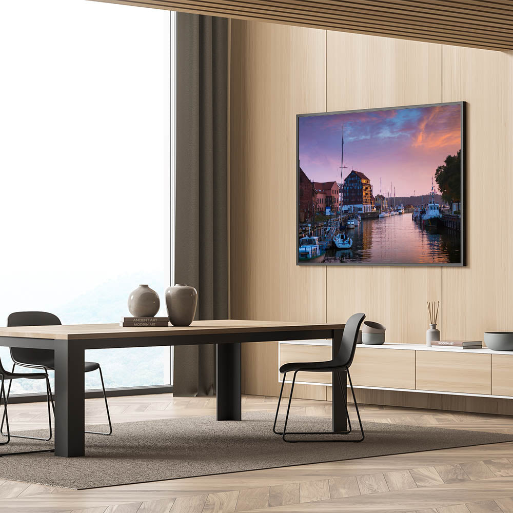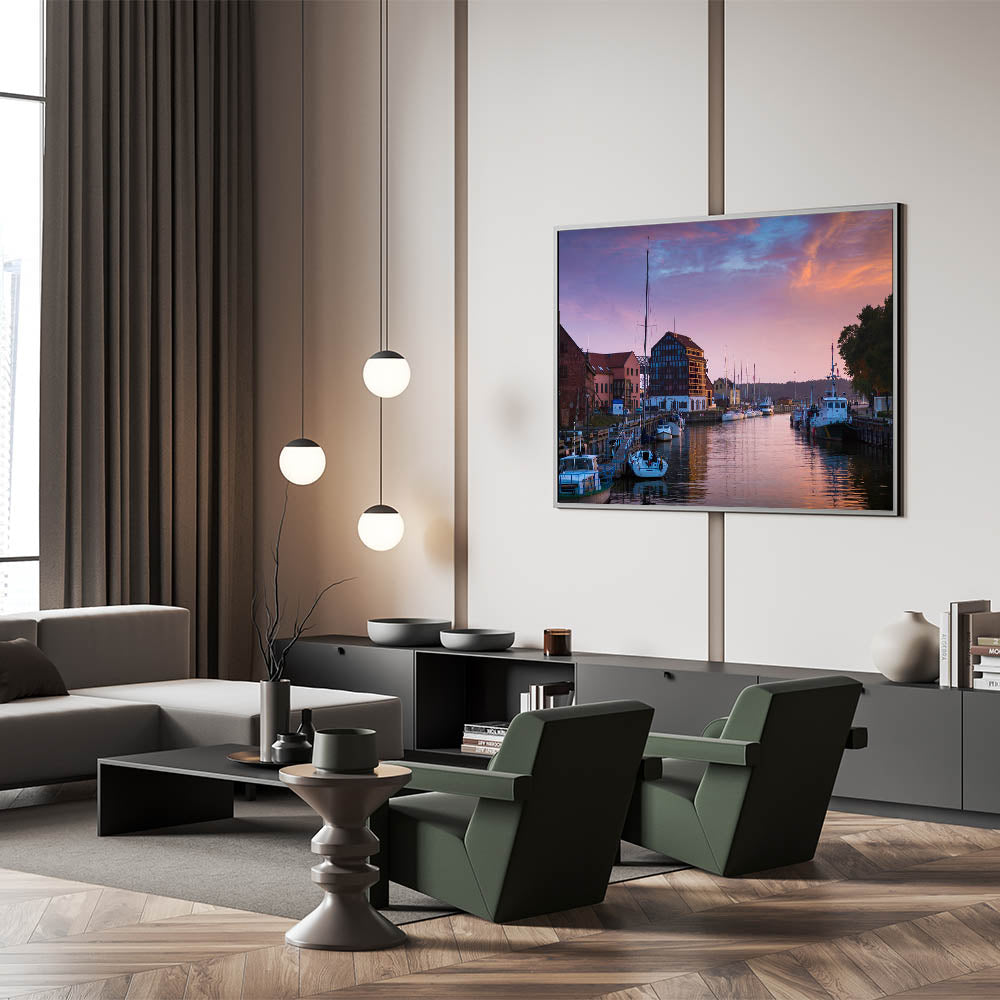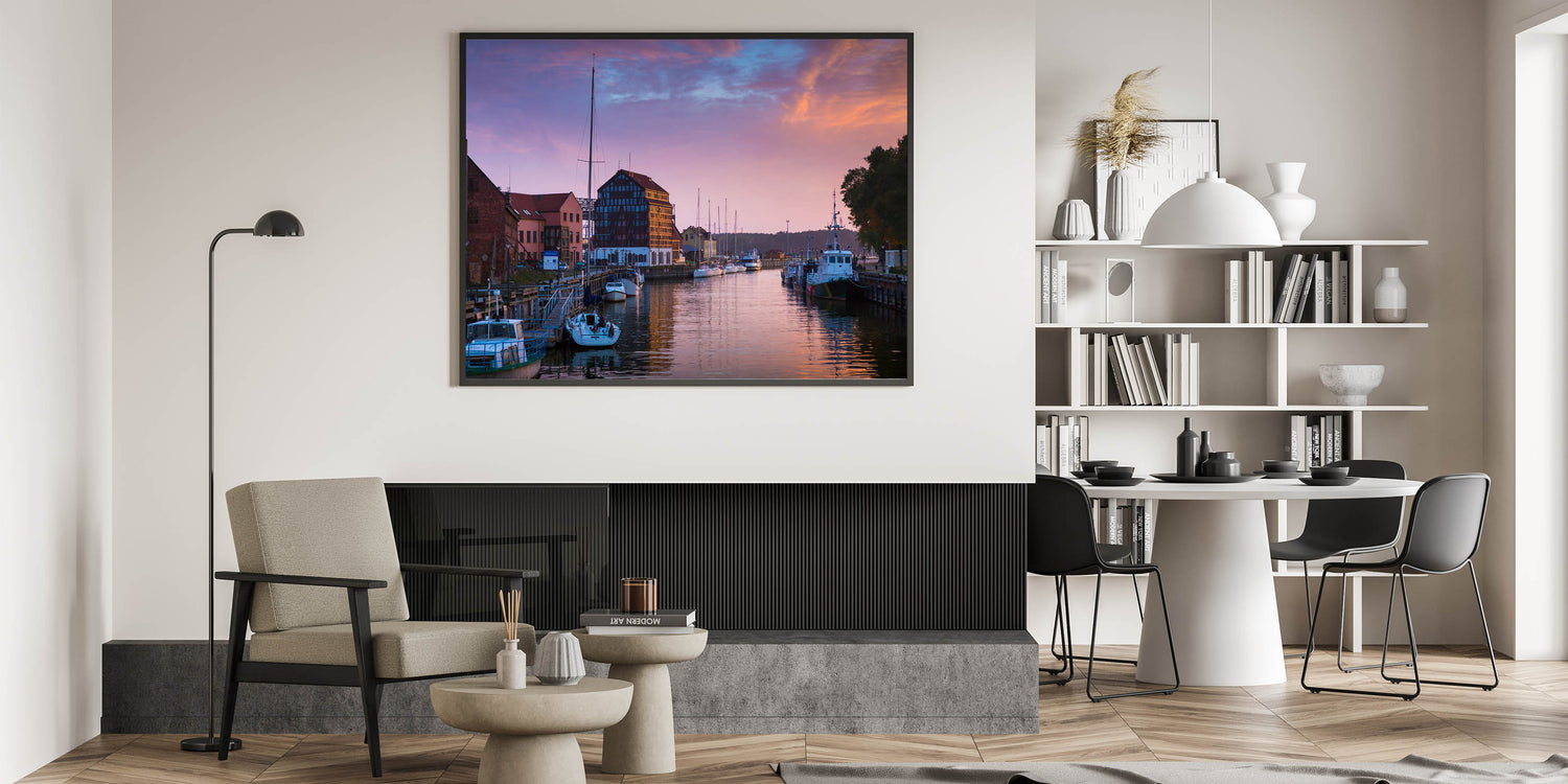 Bring the charm of Lithuania’s coastal city into your home with this stunning wall art, capturing a serene view of Klaipėda Harbor during a beautiful sunset. The soft hues of the sky blend perfectly with the still waters, creating a picturesque scene that highlights the beauty of this Baltic Sea port city. This beautiful Lithuania artwork showcases the perfect balance of nature and architecture, making it an ideal piece for anyone who loves maritime settings or tranquil seascapes.