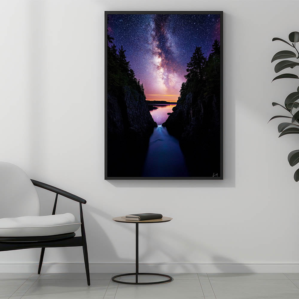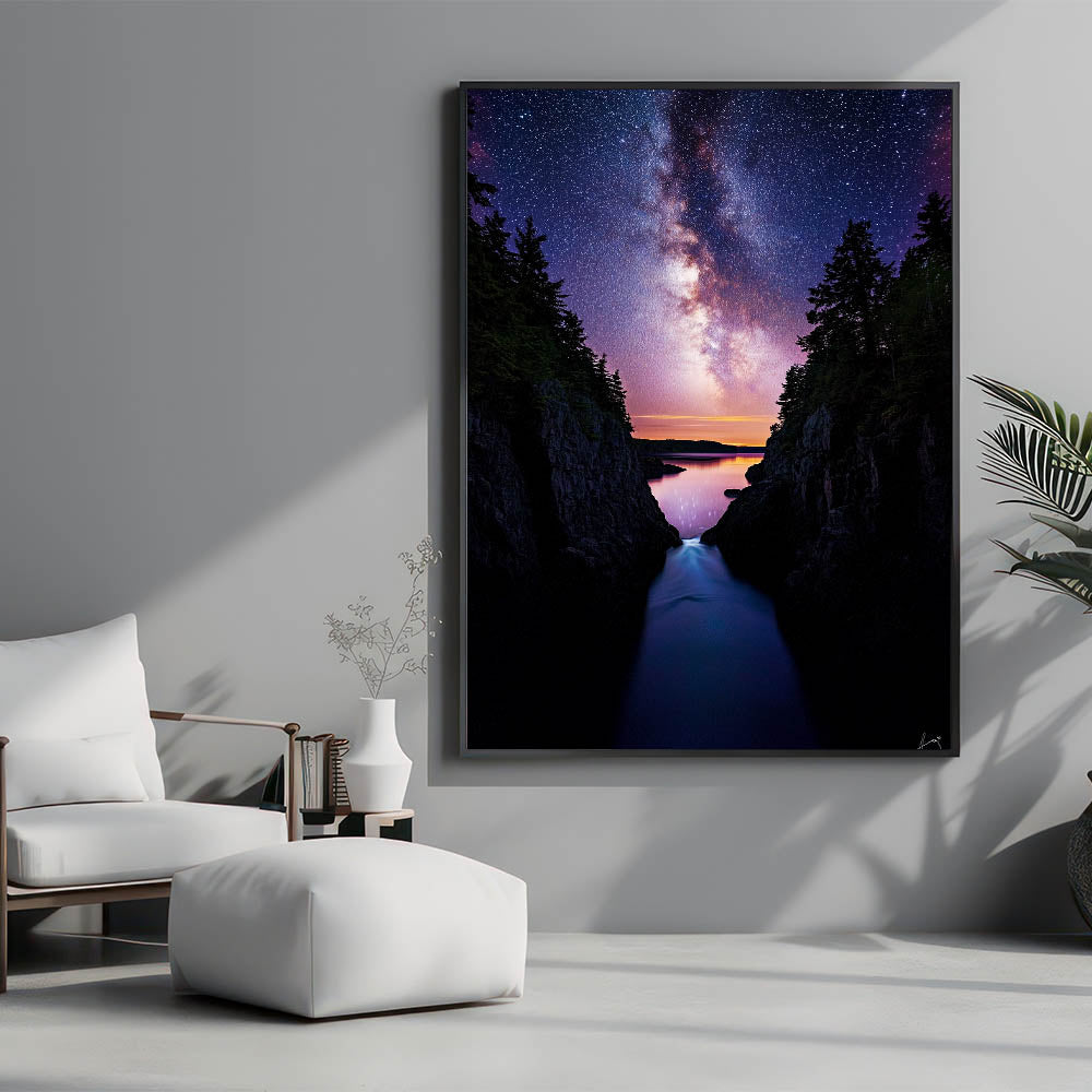 Transport yourself to the breathtaking beauty of a starry night sky with this stunning wall art. The Milky Way stretches gloriously across the heavens, framed by majestic cliffs and a tranquil waterway. The vibrant hues of purple, blue, and gold create a magical contrast against the dark silhouette of the cliffs and trees, making this piece a captivating addition to any space.