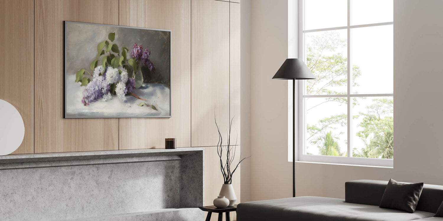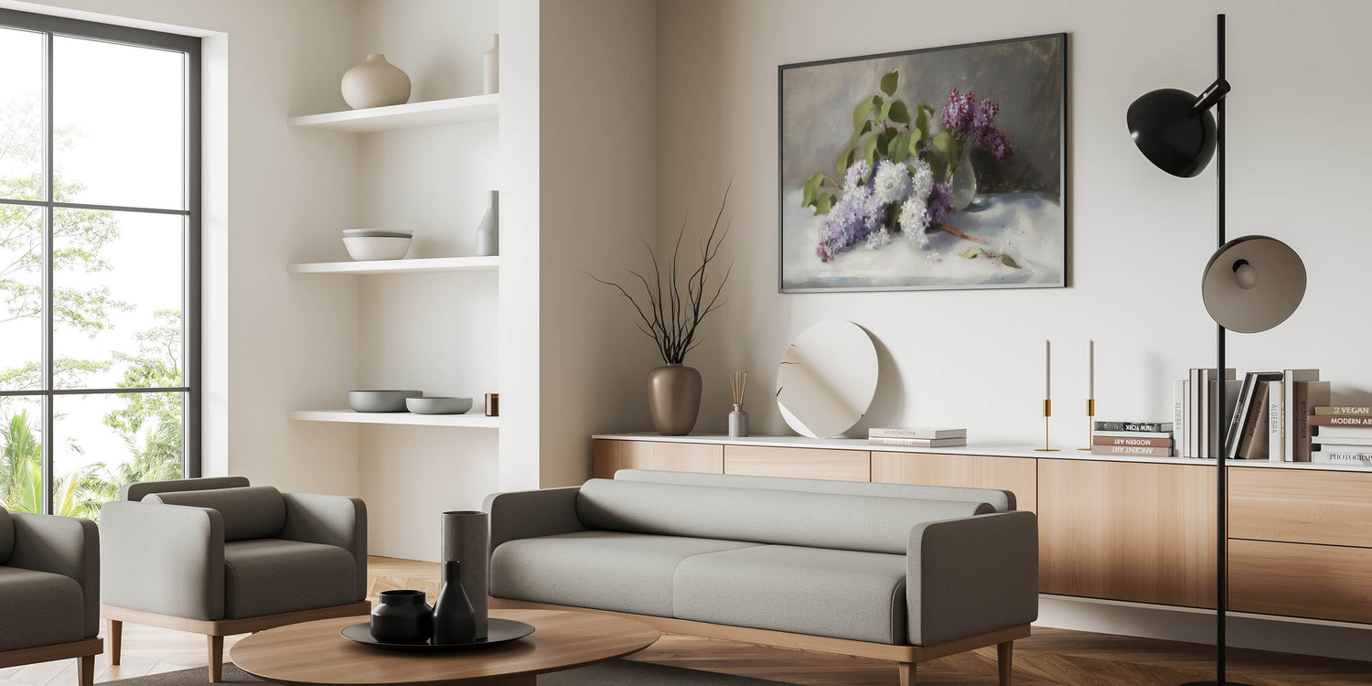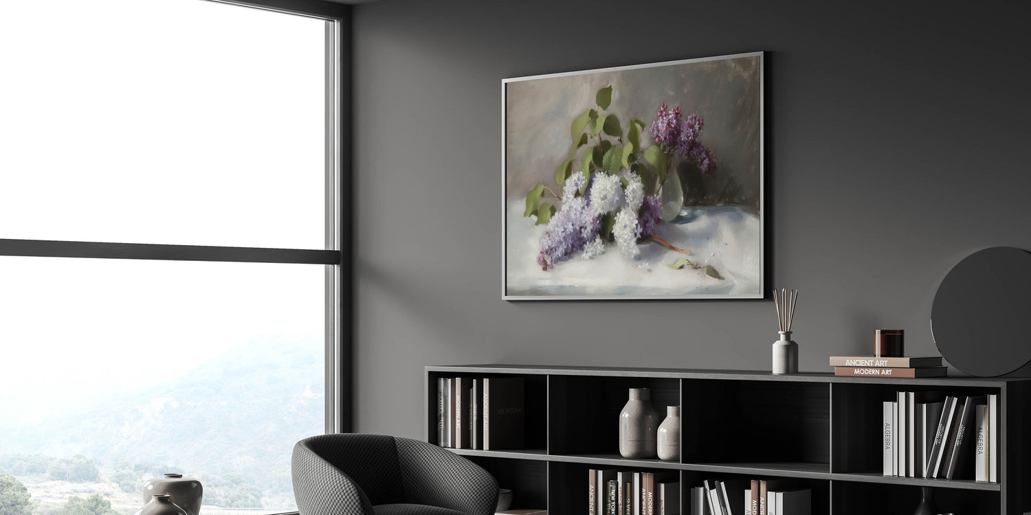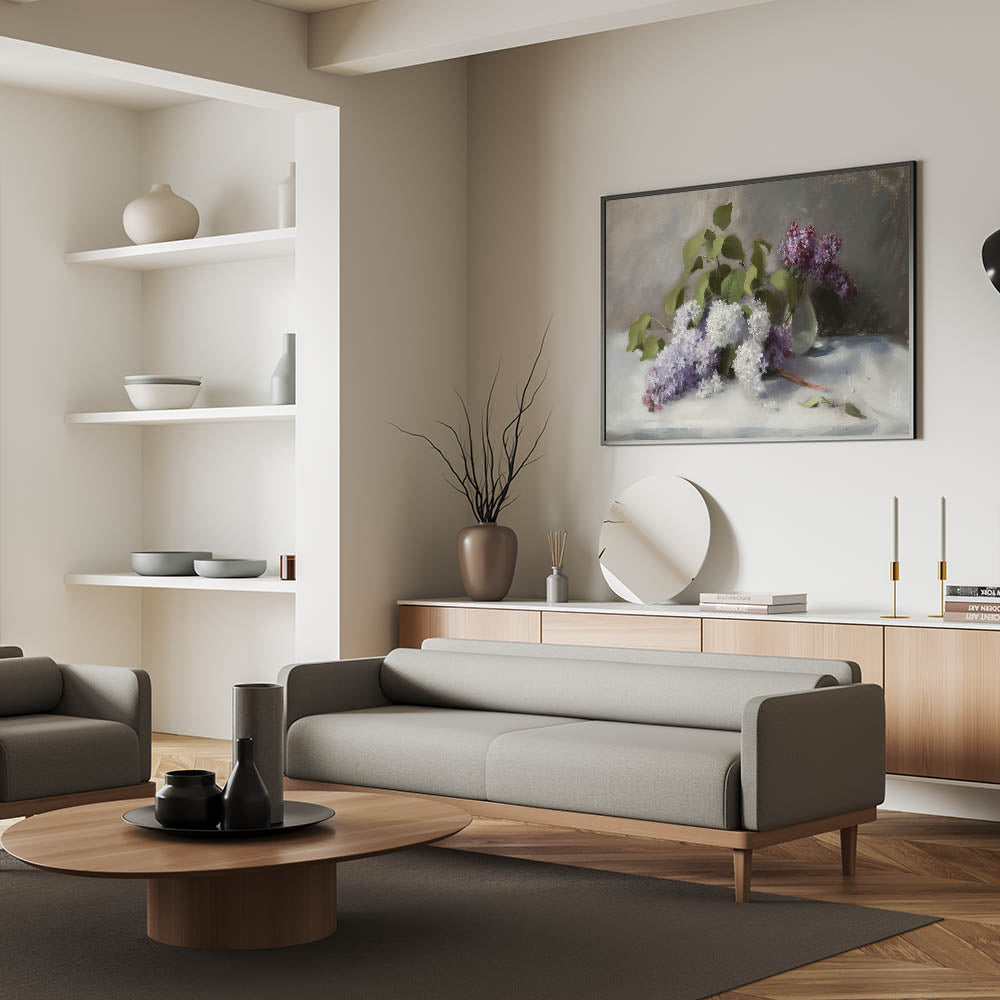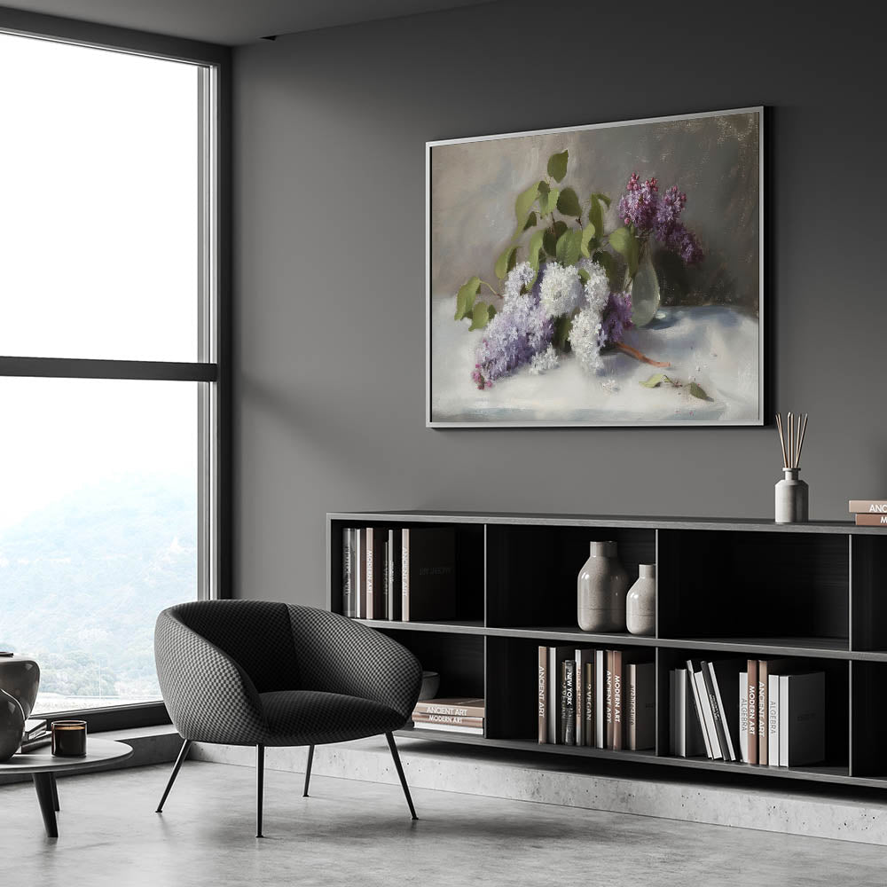 Enhance your space with this Living Room Wall Art, featuring a breathtaking arrangement of lilac flowers in soft white and rich purple hues. This Modern Wall Art blends classic floral beauty with contemporary elegance, making it the perfect choice for Modern Living Room Décor. The delicate petals, lush green leaves, and subtle light reflections create a peaceful, sophisticated atmosphere, perfect for any interior.
