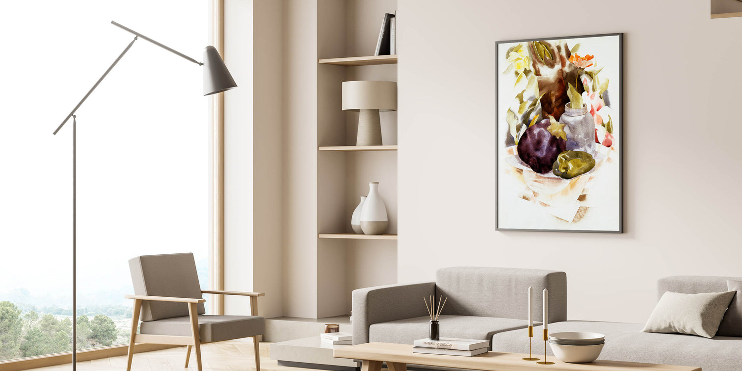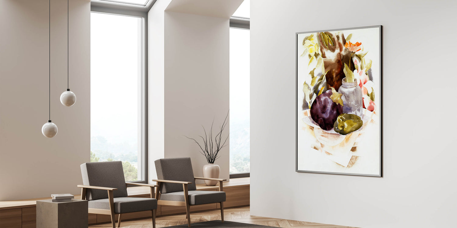 Bring nature’s beauty to your home with this Modern Wall Art, featuring a serene still life of an eggplant, green pepper, and floral accents. Rendered in soft watercolor tones of green, purple, and brown, this artwork captures the elegance of simplicity. The subtle layering and abstract touch make it a perfect example of Contemporary Art, blending traditional still life with a modern aesthetic.
