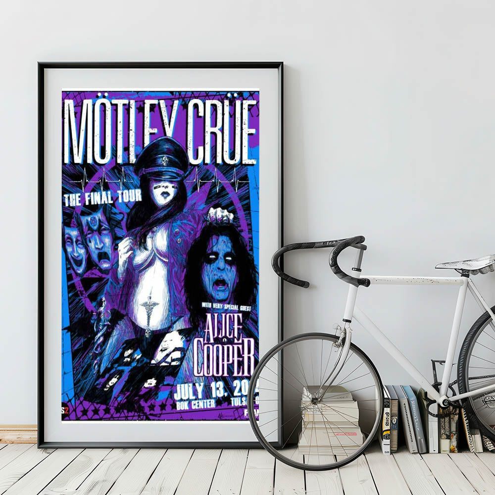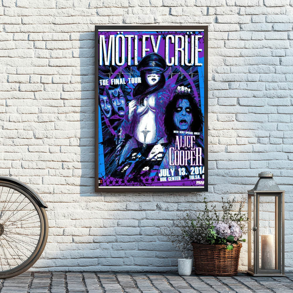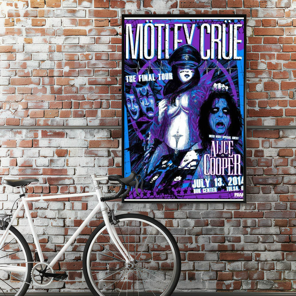 Celebrate the legendary Mötley Crüe's Final Tour with this vibrant and electrifying concert poster. Featuring the iconic band alongside Alice Cooper as a special guest, this design captures the raw energy of the rock world. The striking color palette of purple, blue, and black gives it a bold, rebellious feel, making it a must-have for any Mötley Crüe or classic rock fan. The unique artwork brings the thrill of the 2014 tour to your space, showcasing a combination of bold typography and edgy imagery.