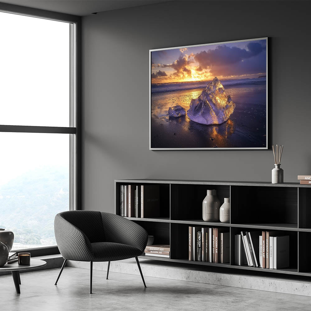 Elevate your space with this mesmerizing ocean beach canvas art, showcasing a glowing ice formation against the backdrop of a radiant sunset and reflective ocean waves. Perfect for creating relaxing coastal views, this artwork combines the beauty of nature with stunning light and texture, making it an ideal choice for beach home decor ideas. Its vivid interplay of warm and cool tones captures the essence of tropical beach scenes, adding depth and serenity to any room.