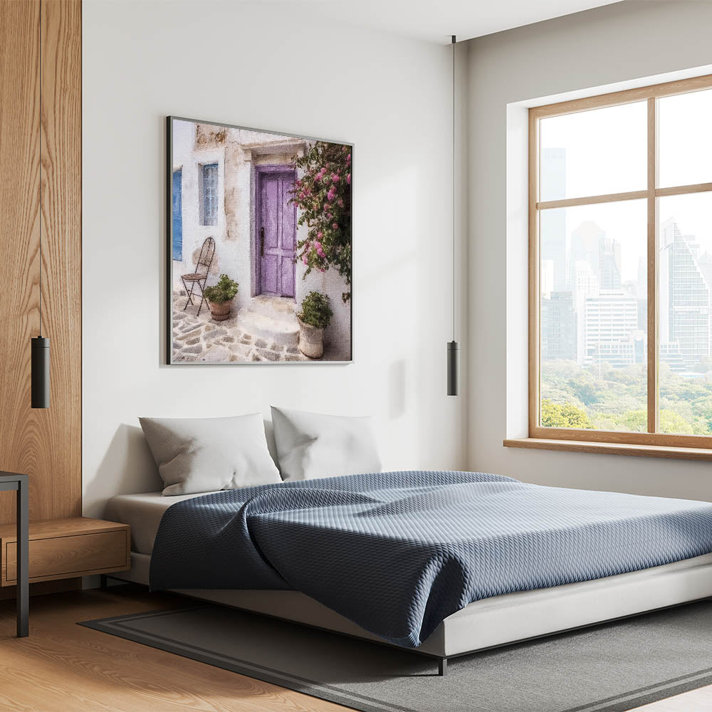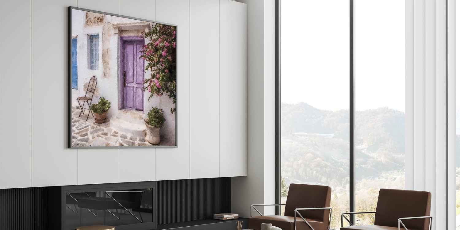 - High-quality pastel Greek door prints, available in materials like Stretched Canvas, Framed Canvas, and Acrylic Glass.