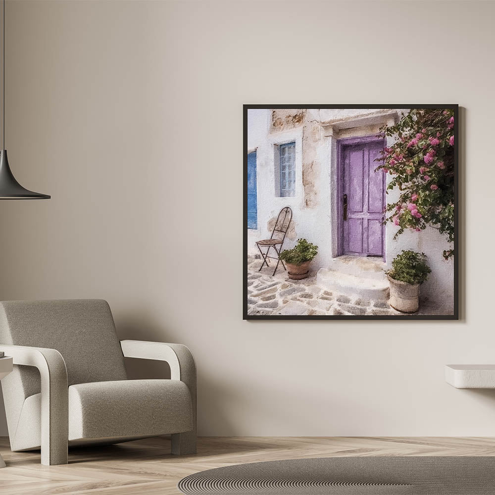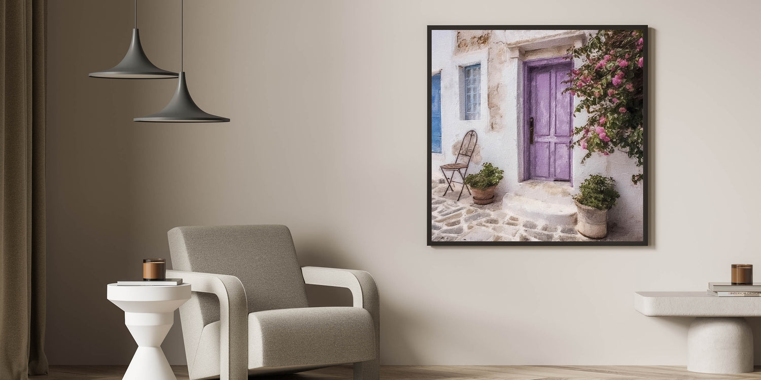 Bring the tranquil beauty of Greek island life into your home with our Pastel Greek Door Print. This delightful artwork features a pastel lavender door framed by cascading pink flowers, complemented by a rustic iron chair and terracotta pots filled with lush greenery. The charming stone pathway and worn textures create a serene, inviting scene that captures the essence of a traditional Greek village. The soft pastel colors and delicate details make this piece an ideal choice for adding a touch of elegance and calm to any decor.