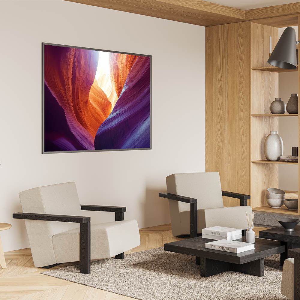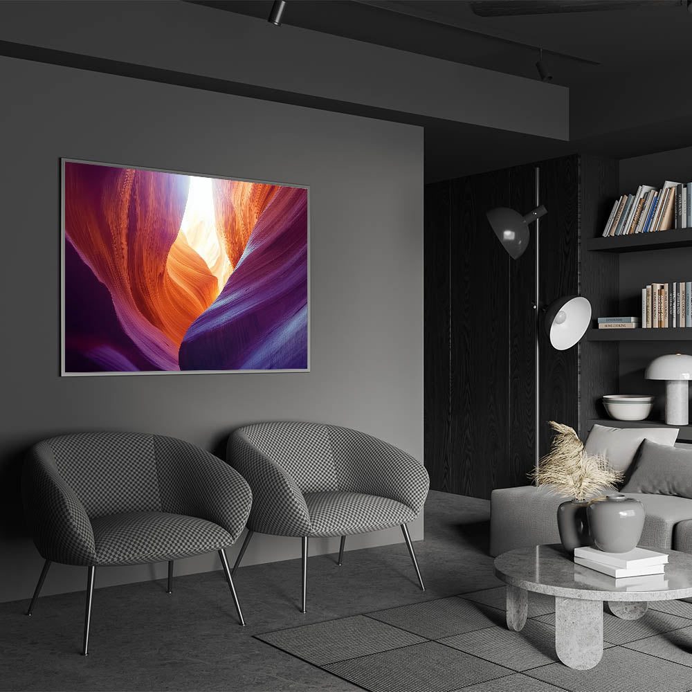 Experience the breathtaking beauty of radiant canyon colors with this abstract wall art. The flowing canyon walls, illuminated by natural light, showcase stunning hues of orange, red, and deep purple. This dramatic interplay of colors and curves creates a captivating and dynamic visual that celebrates the essence of nature's artistry.