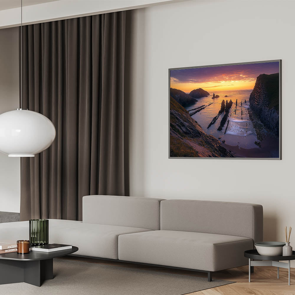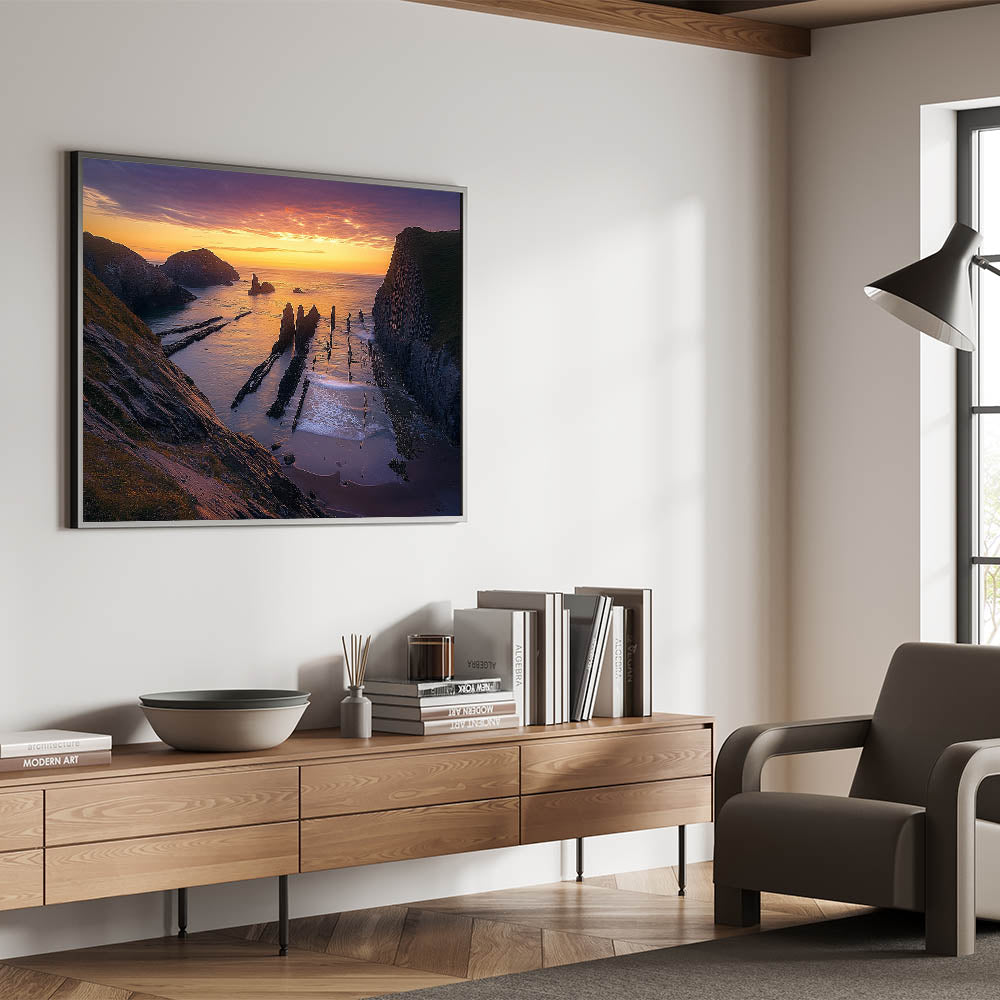 Bring the beauty of the coast to your space with this scenic cliffs artwork featuring a serene sunset over rugged rock formations and calm coastal waters. The rich tones of purple, orange, and gold in the evening sky reflect on the water, creating a tranquil yet dramatic atmosphere. This breathtaking artwork captures the natural splendor of the shoreline, perfect for enhancing your decor.