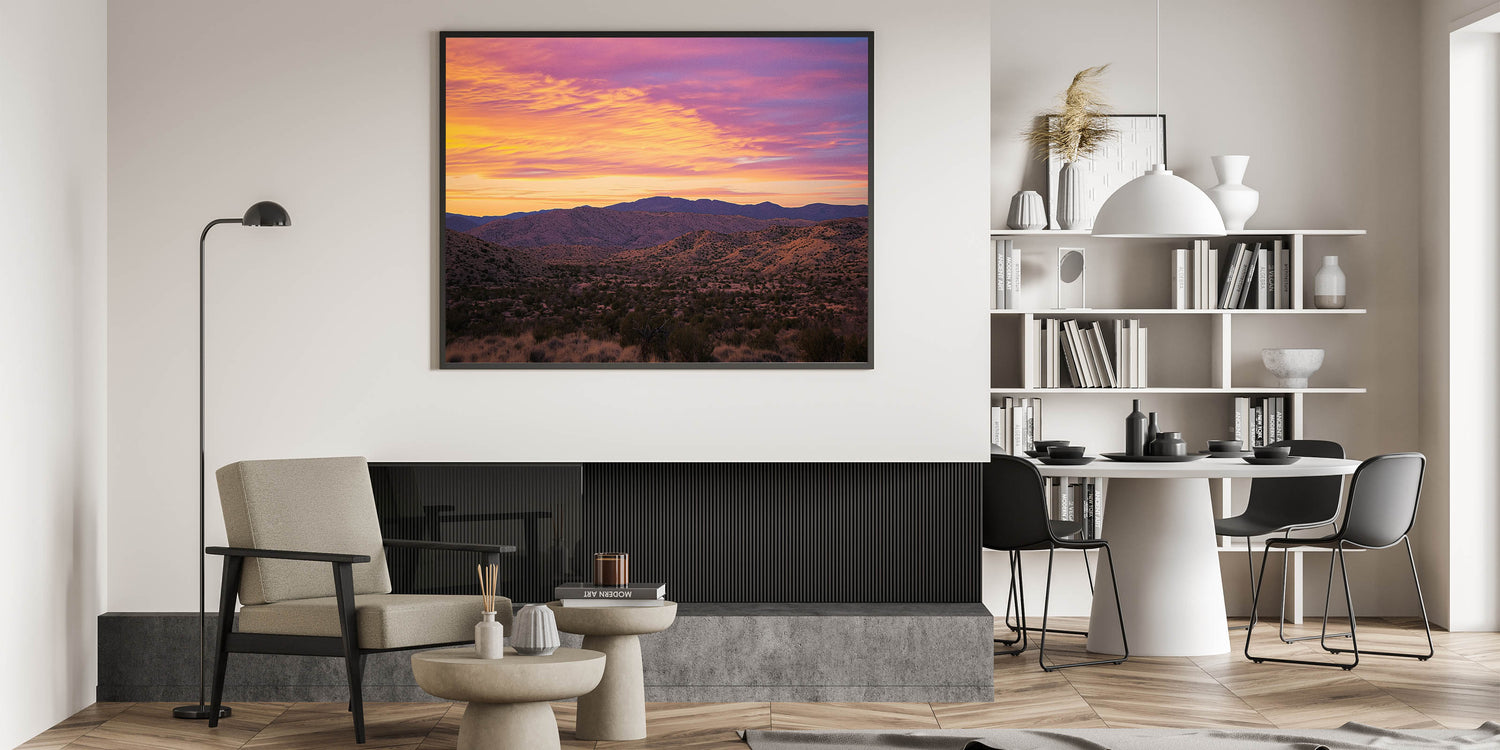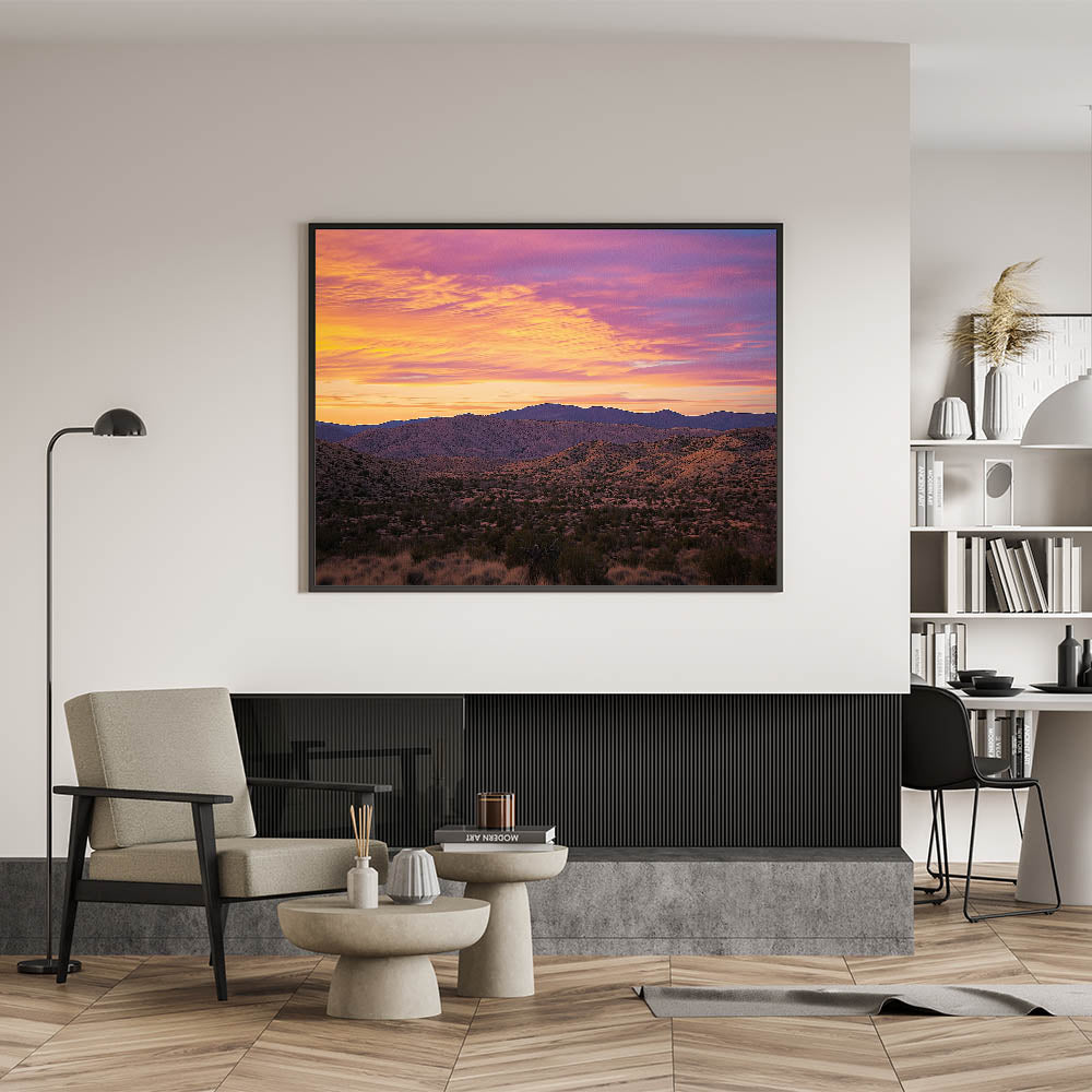 Embrace the beauty of this Southwestern desert art, showcasing a vibrant sunset cascading over rolling desert hills. The sky is alive with streaks of orange, yellow, and purple, creating a mesmerizing blend of colors that evokes warmth and serenity. This stunning artwork perfectly captures the rugged charm and peaceful allure of the desert landscape.