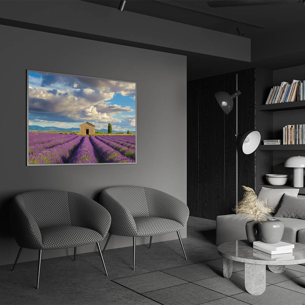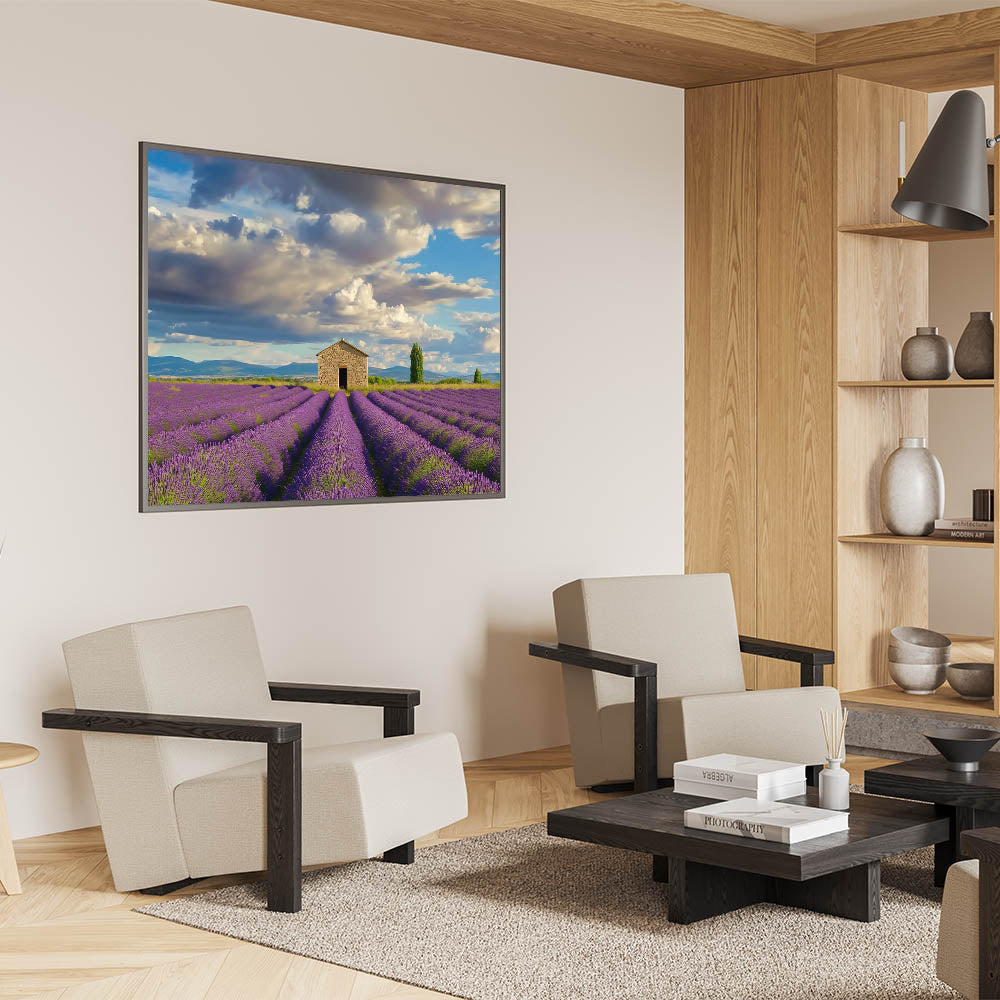 Immerse yourself in the beauty of Provence with this stunning barn and lavender field wall art. This photograph captures a charming stone barn surrounded by vibrant rows of blooming lavender under a dramatic, cloud-filled sky. The vivid purple hues and natural textures create a calming and picturesque scene, making it a perfect addition to farmhouse or nature-inspired interiors.