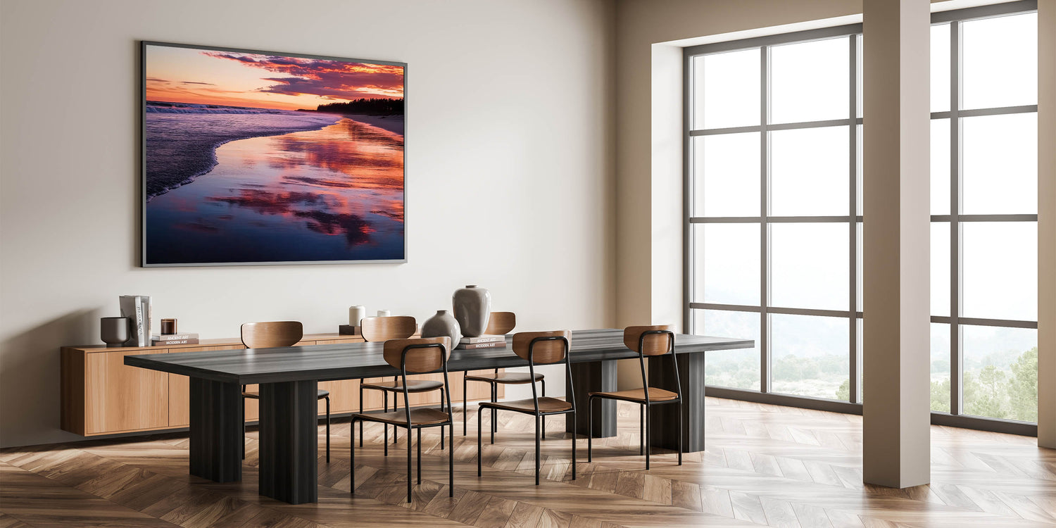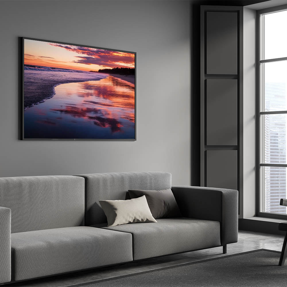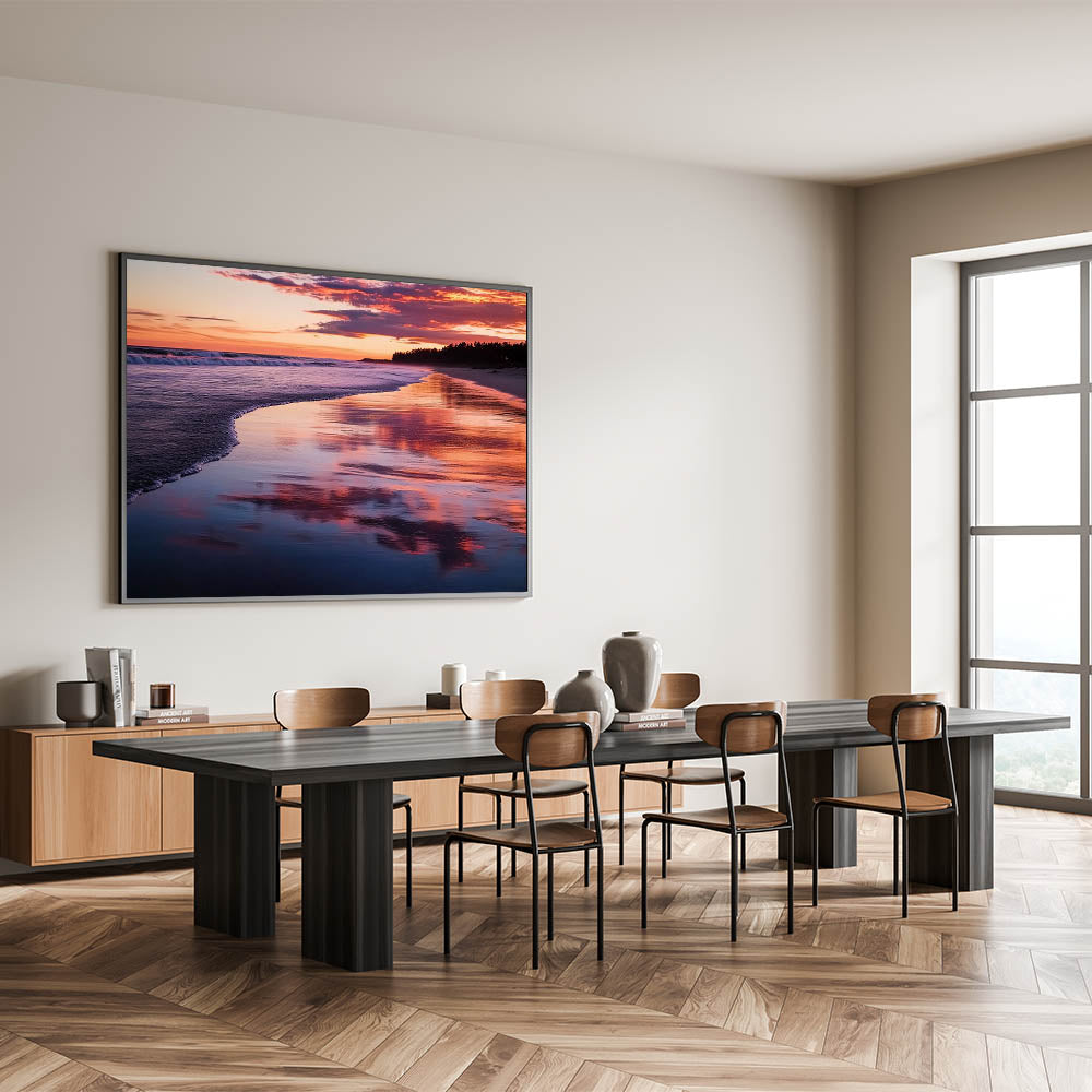 Bring the tranquil beauty of a tropical sunset into your home with this stunning wall art, featuring a serene shoreline illuminated by vibrant hues of pink, orange, and deep purple. The smooth, reflective surface of the water mirrors the radiant sky, creating an enchanting display of nature's artistry. This artwork perfectly captures relaxing coastal views, making it an ideal centerpiece for beach home decor ideas.