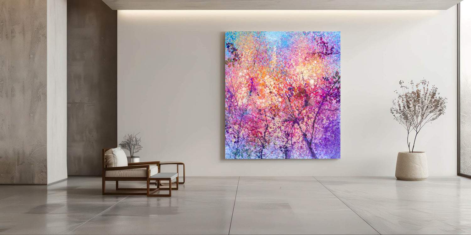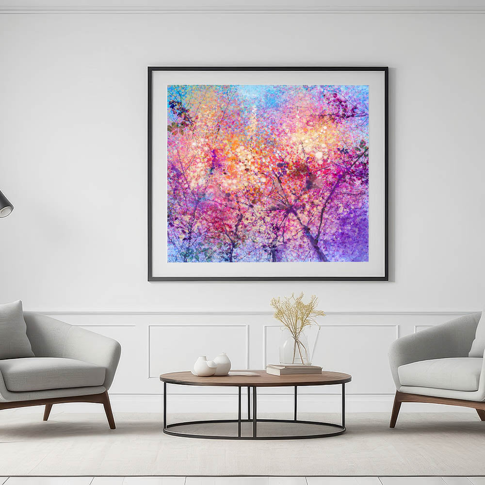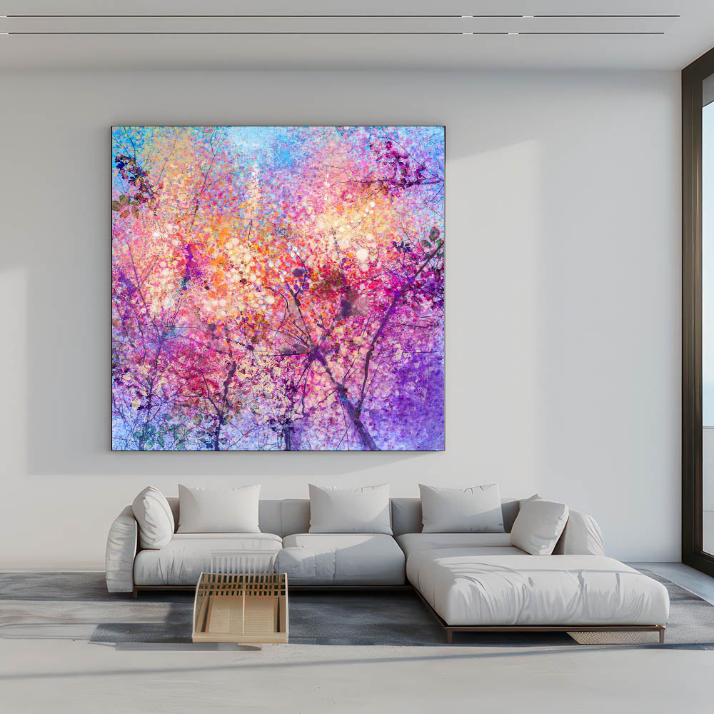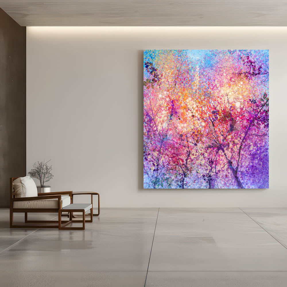 Bring a burst of color to your home with this modern wall art, featuring a mesmerizing abstract tree painting in shades of pink, purple, orange, and blue. The unique layering of vibrant hues and dynamic brushstrokes gives this canvas wall art a dreamlike quality, making it a perfect statement piece for living room wall art collections. This contemporary art print blends the beauty of nature with an artistic explosion of color, adding warmth and vibrancy to any space.