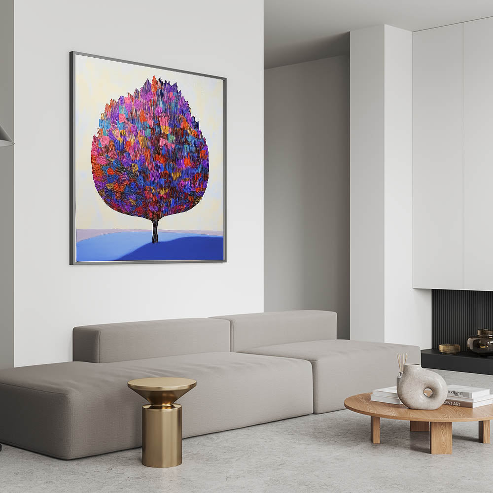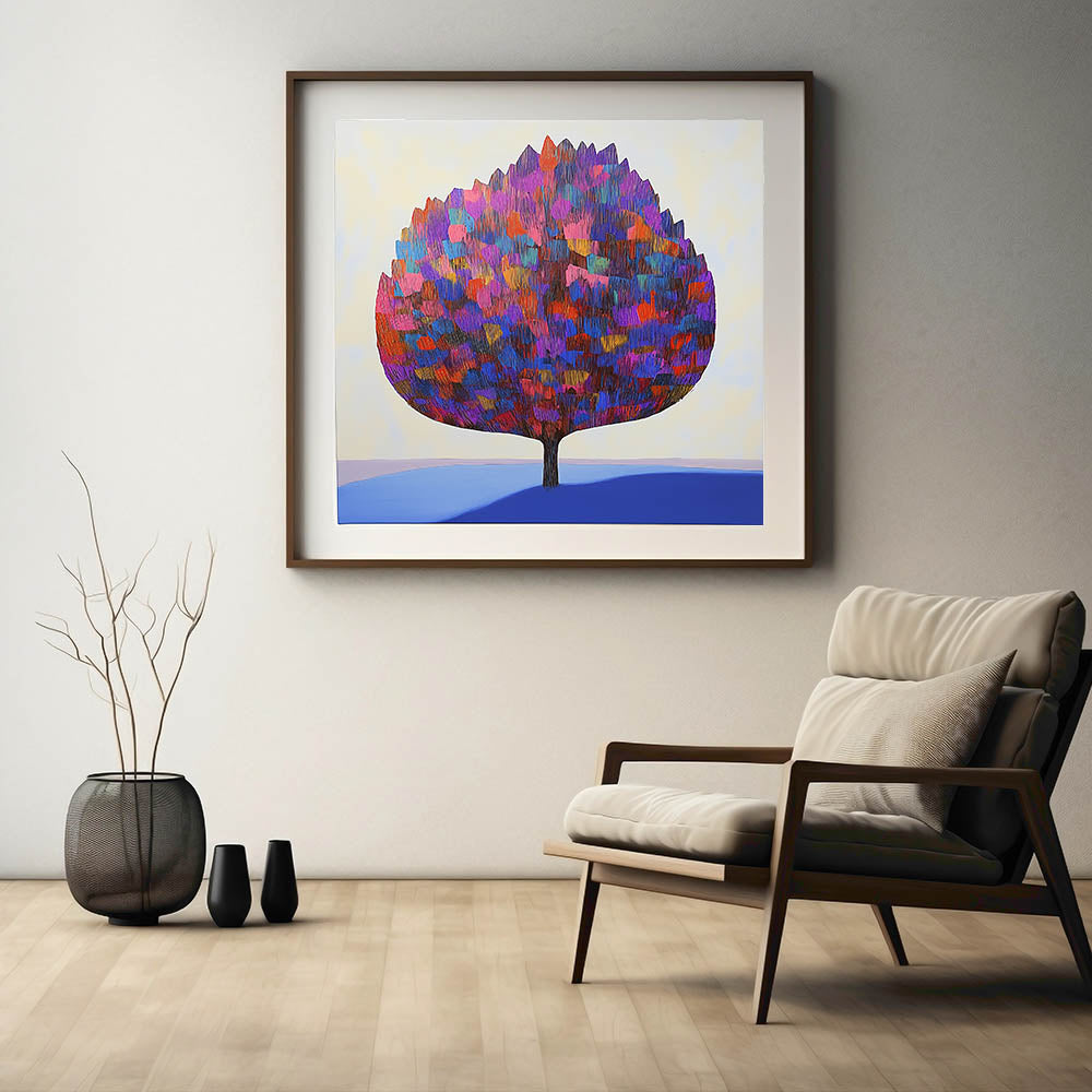 Make a bold statement in your space with this Vibrant Abstract Tree Wall Art. Featuring a geometric-inspired multicolor tree with a striking combination of purple, red, blue, and orange hues, this canvas wall art is a stunning fusion of modern artistry and nature. The intricate brushwork and vivid colors create a mesmerizing effect, making it a perfect addition to modern living room decor. Whether displayed as stretched canvas, framed prints, or acrylic glass, this large wall art adds energy and contemporary elegance to any interior.