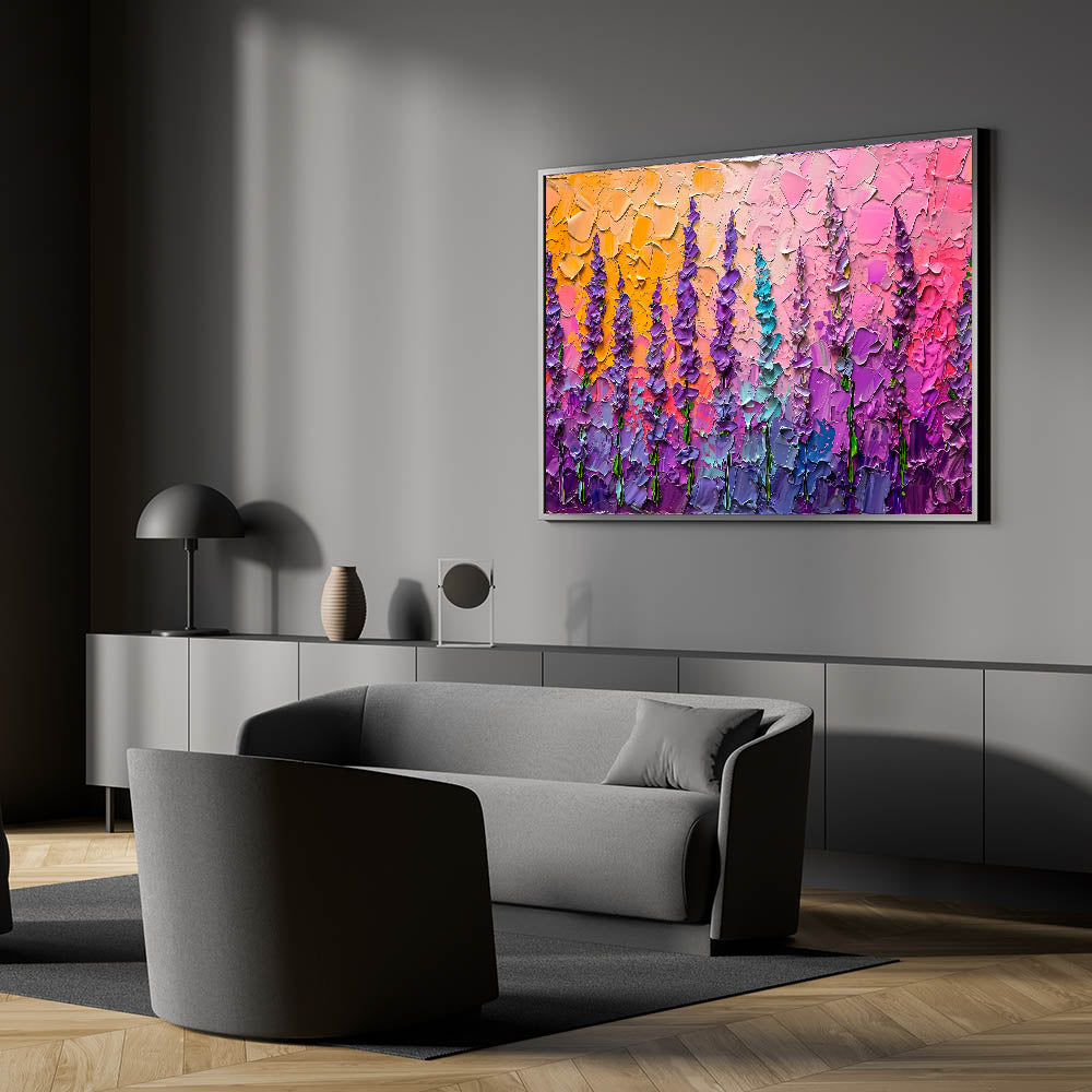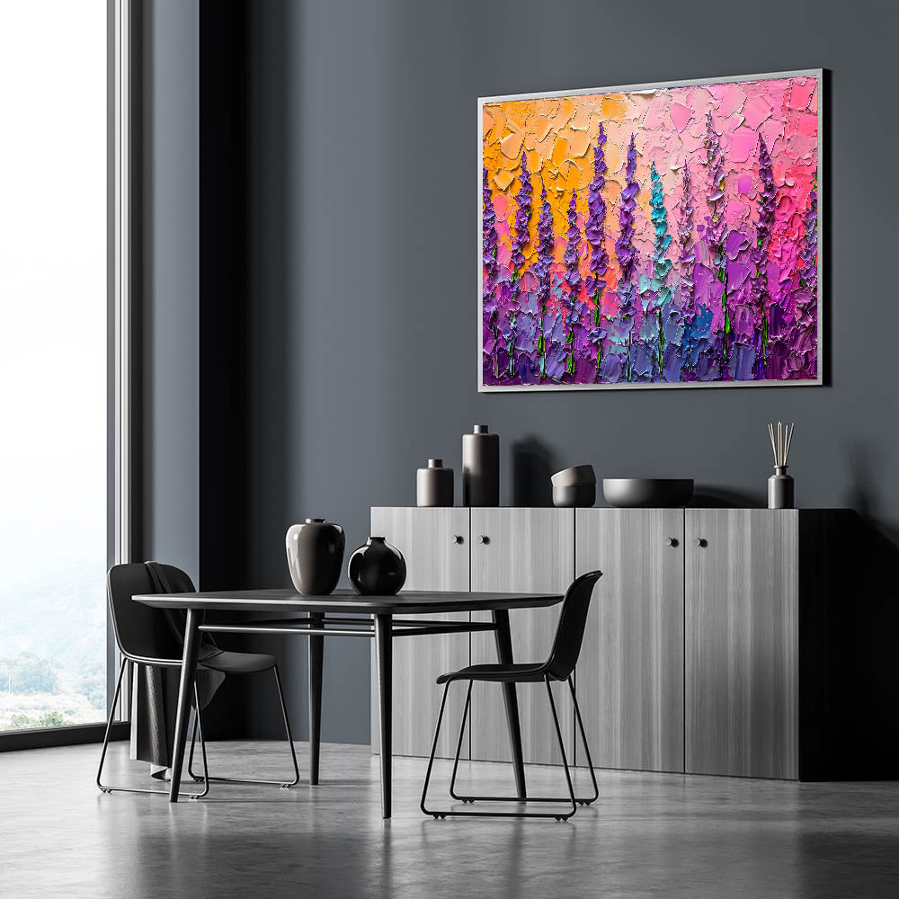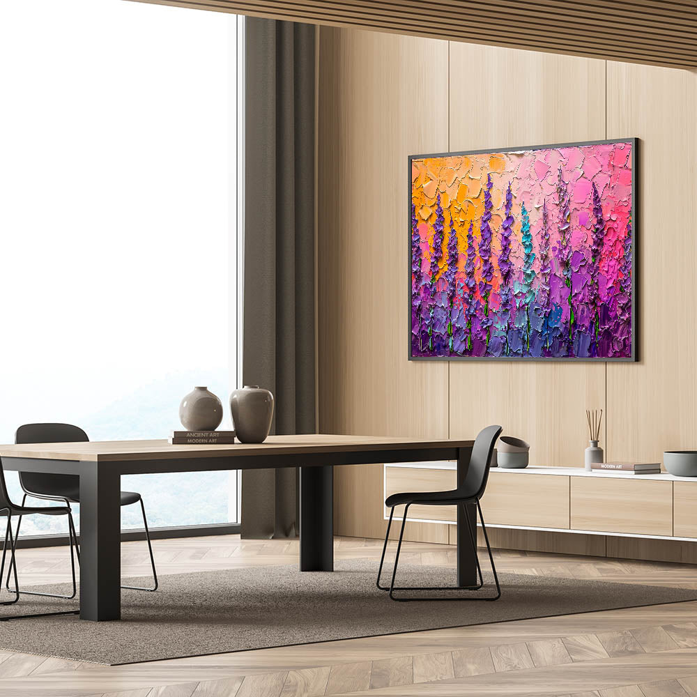 Bring energy and color to your space with this vibrant floral wall art, featuring bold purple, pink, and orange tones in a stunning abstract composition. This modern wall art showcases an expressive, textured painting of lively wildflowers, creating depth and movement with its rich brush strokes. Perfect as wall art for living room spaces, this piece instantly transforms any area into a bright and artistic sanctuary.