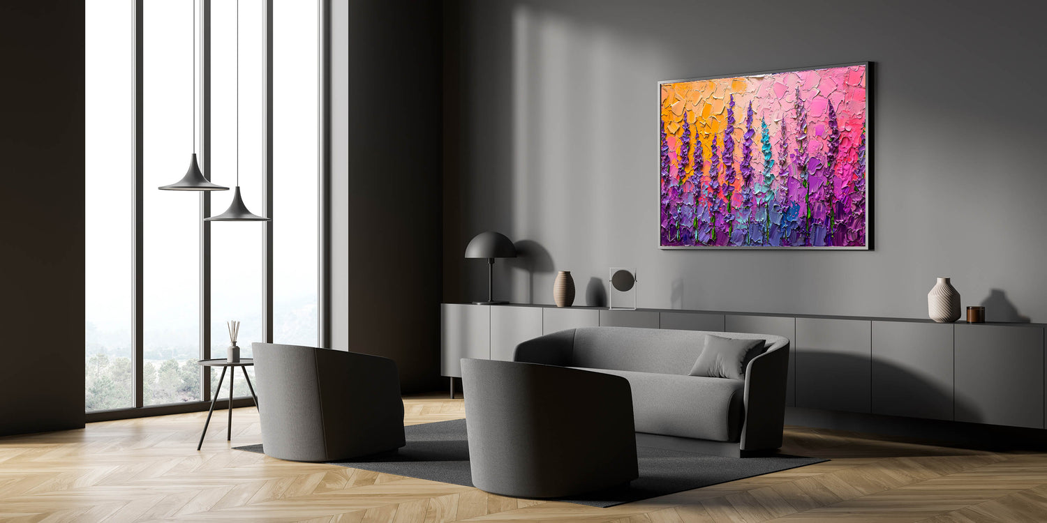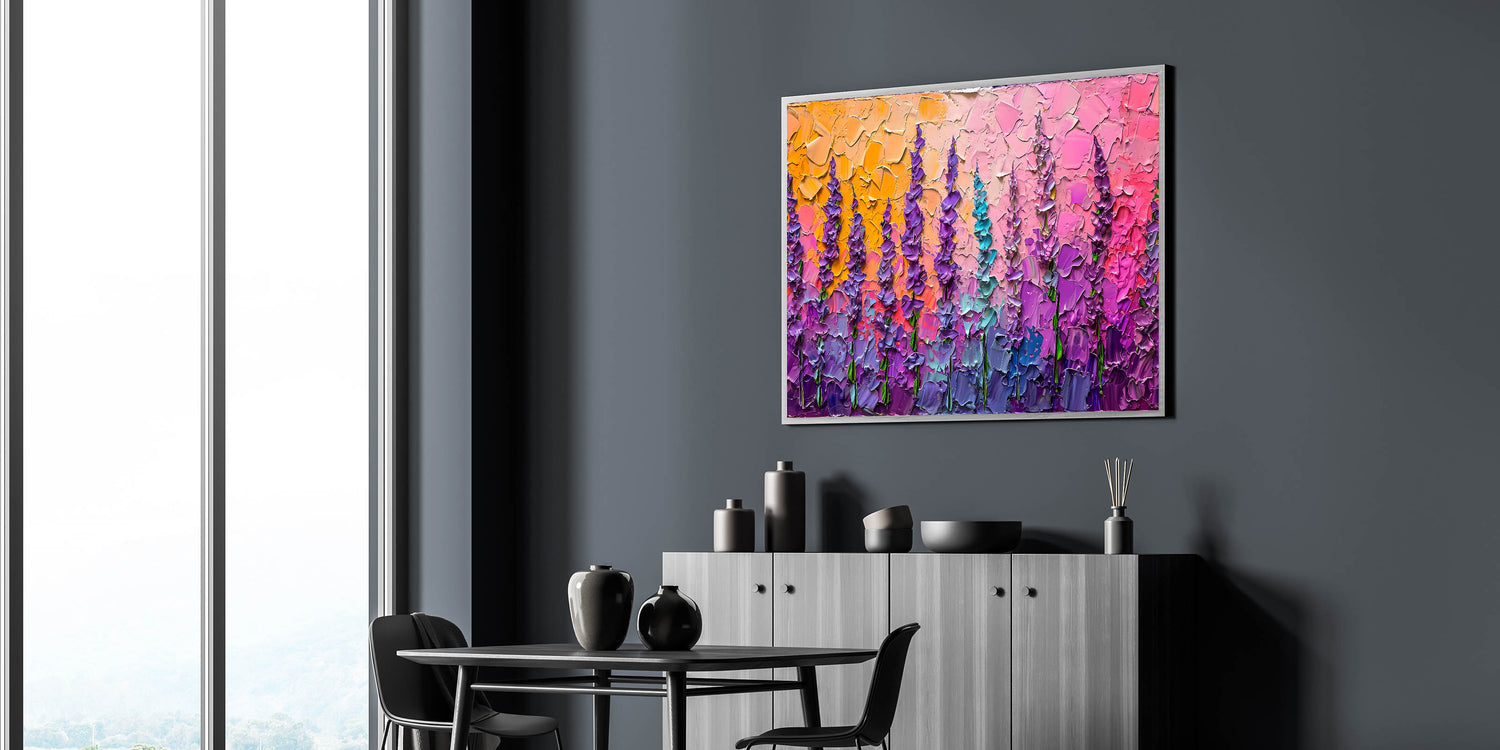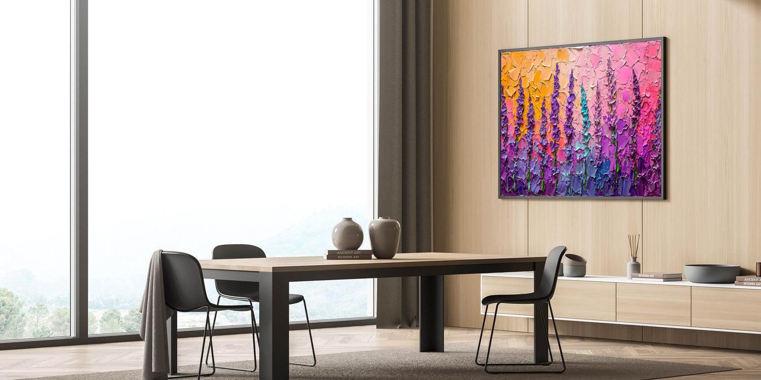 Bring energy and color to your space with this vibrant floral wall art, featuring bold purple, pink, and orange tones in a stunning abstract composition. This modern wall art showcases an expressive, textured painting of lively wildflowers, creating depth and movement with its rich brush strokes. Perfect as wall art for living room spaces, this piece instantly transforms any area into a bright and artistic sanctuary.
