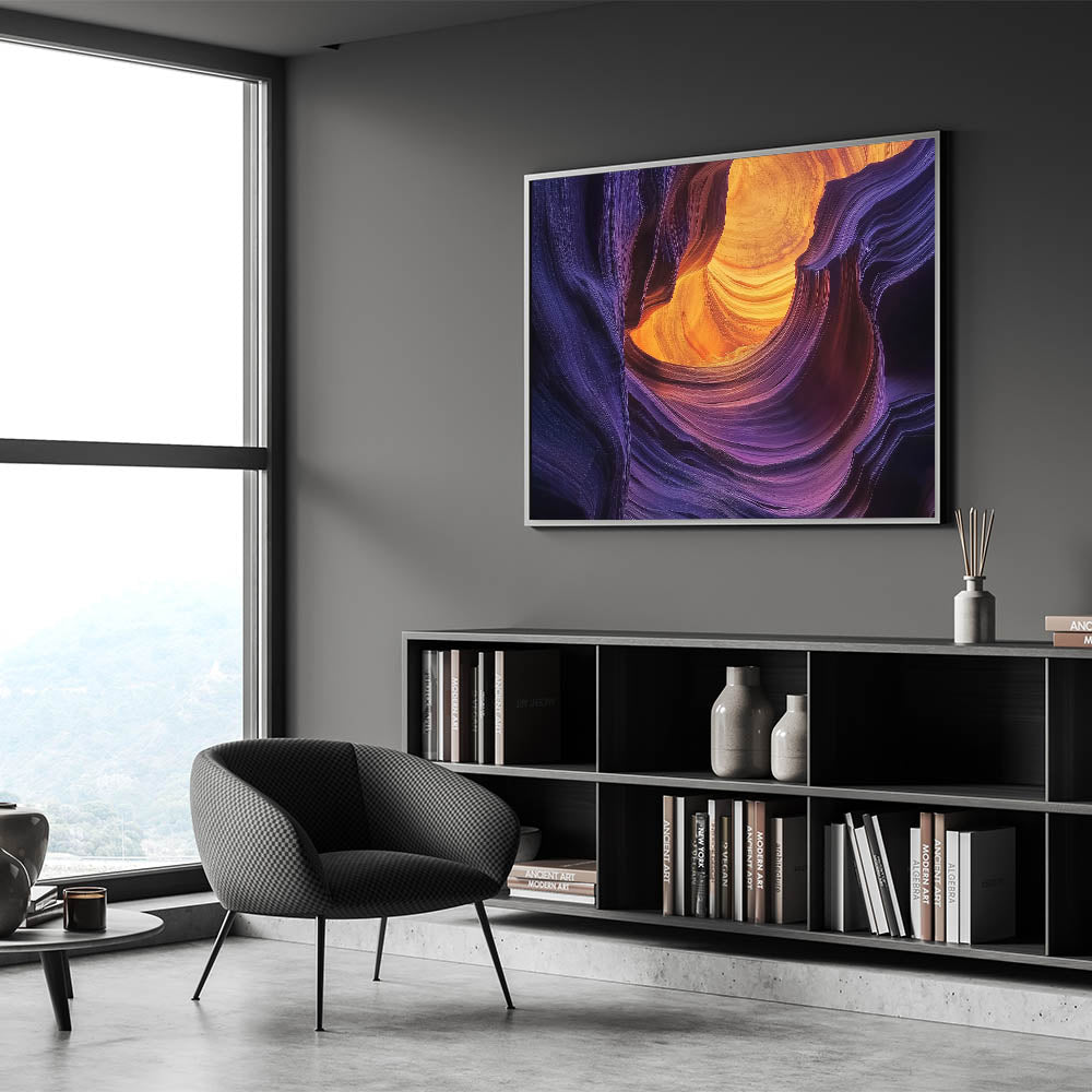 Immerse yourself in the dramatic beauty of this abstract canyon artwork, featuring vivid purple and gold hues. The swirling sandstone formations create a mesmerizing composition, blending bold colors with intricate textures. This piece captures the raw elegance of nature's artistry and is perfect for adding energy and sophistication to your space.