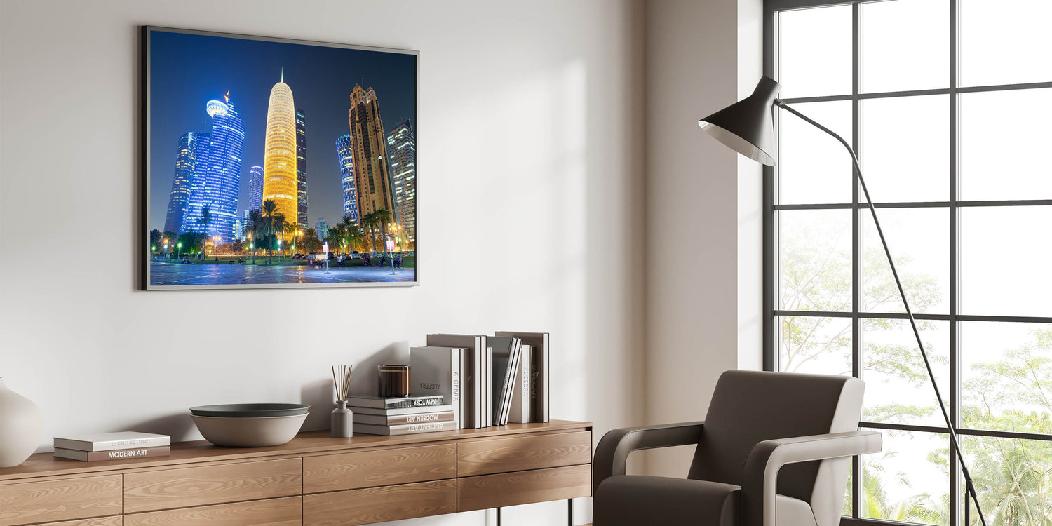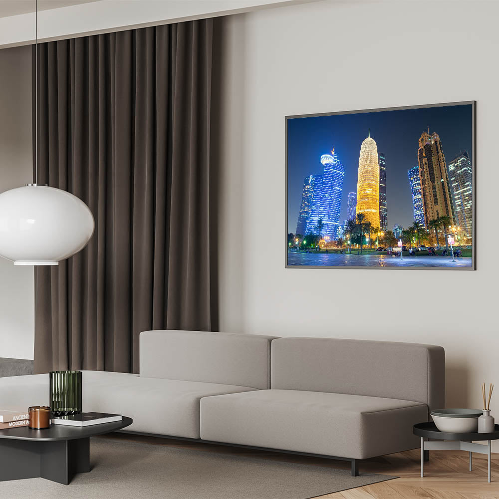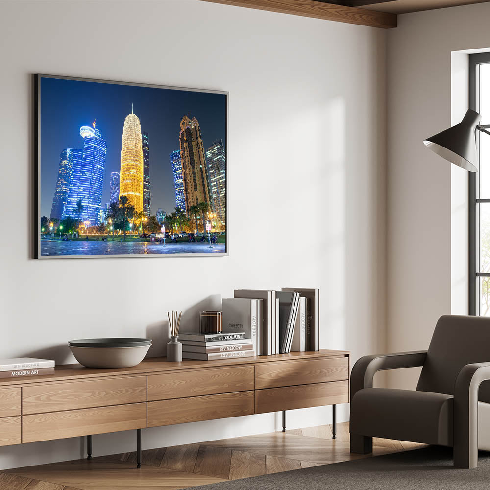 Illuminate your home with the breathtaking beauty of our "Doha Cityscape Prints - Modern Qatar Night Skyline Art." This canvas print features the dynamic and vibrant skyline of Doha, captured in stunning clarity and vibrant colors, highlighting the city's architectural prowess.