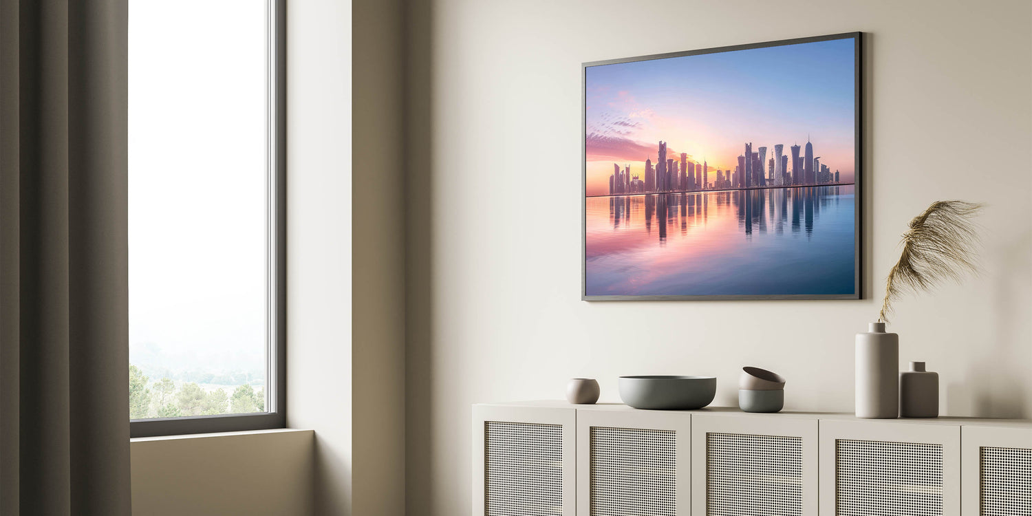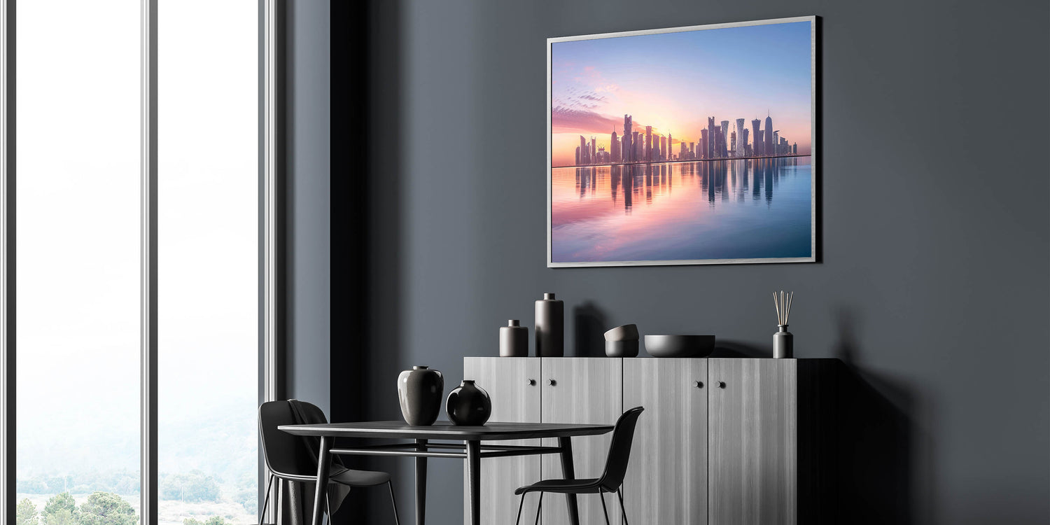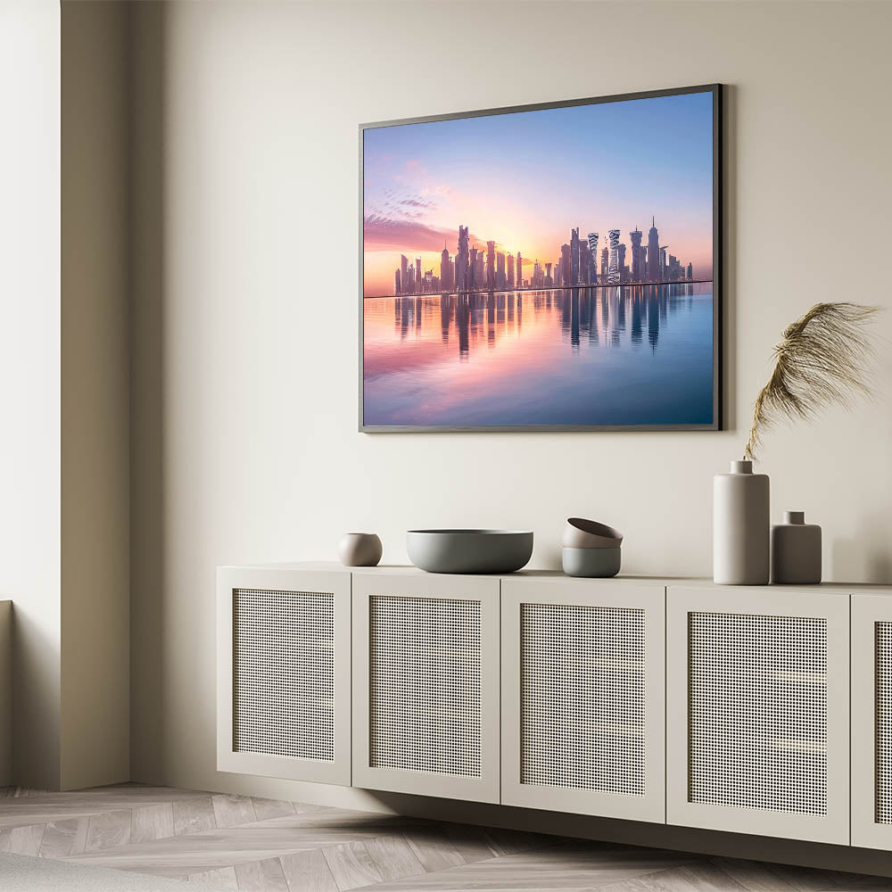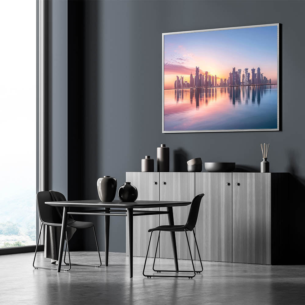 Begin every day with the calm and beauty of our "Serene Sunrise Doha Skyline - Reflective Waters Canvas Print." This stunning artwork captures the peaceful early morning hours in Doha, where the city’s modern skyline is beautifully mirrored in the still waters below, under a softly lit sky.