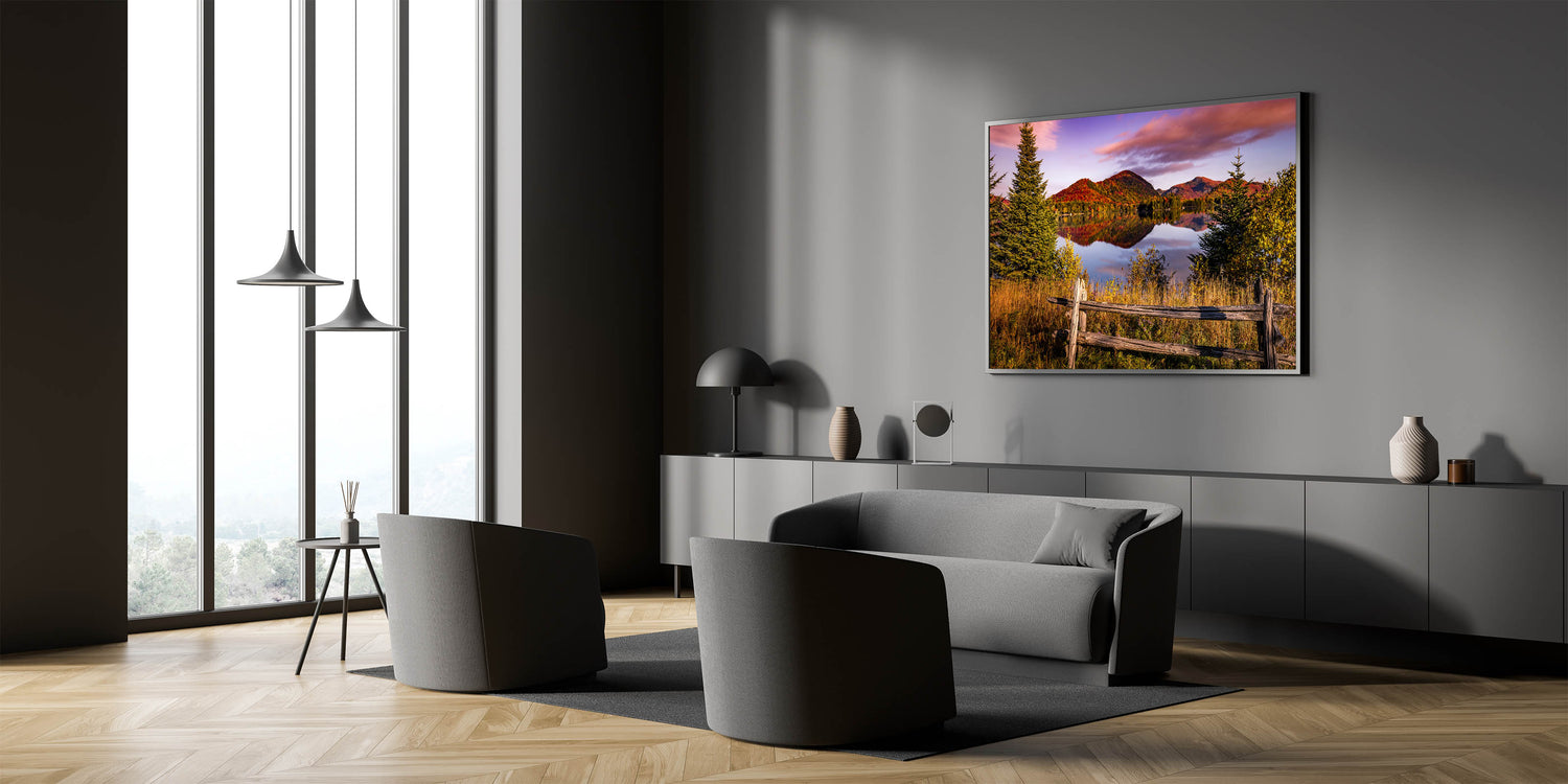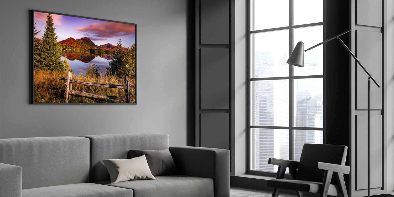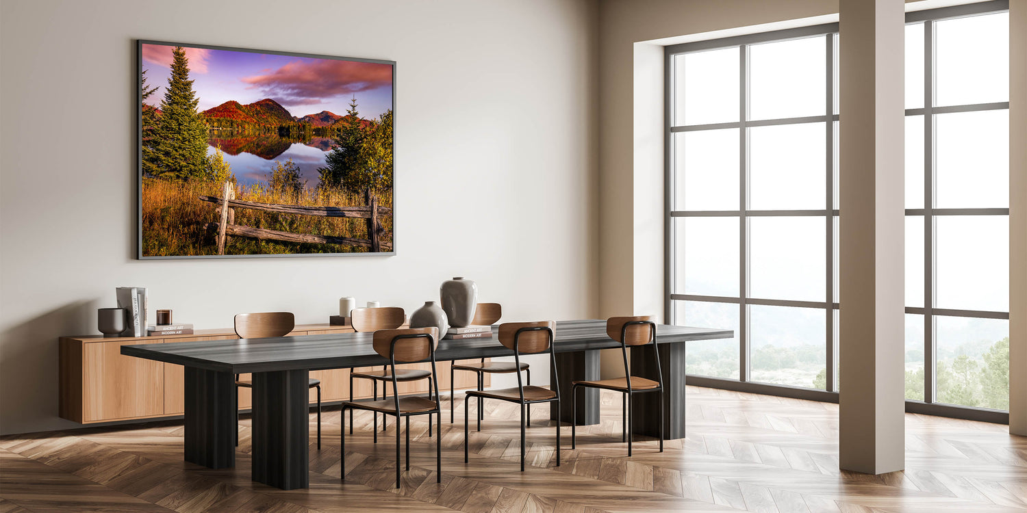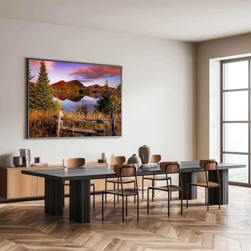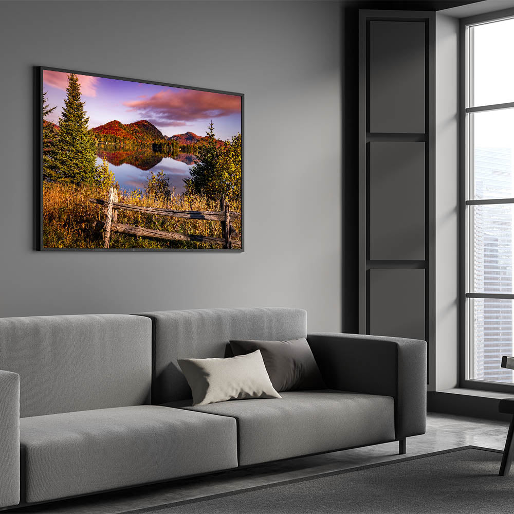 Add a touch of rustic beauty to your home with this peaceful Quebec lakeside scene. Capturing the vivid colors of autumn, this artwork showcases a still lake reflecting the vibrant mountains and trees, framed by a simple wooden fence. The orange and red tones of the mountains, coupled with the rich green foliage, create a serene yet captivating atmosphere, perfect for those who love nature’s seasonal beauty. Ideal for rustic or nature-inspired decor, this wall art brings a warm and tranquil vibe to any space.