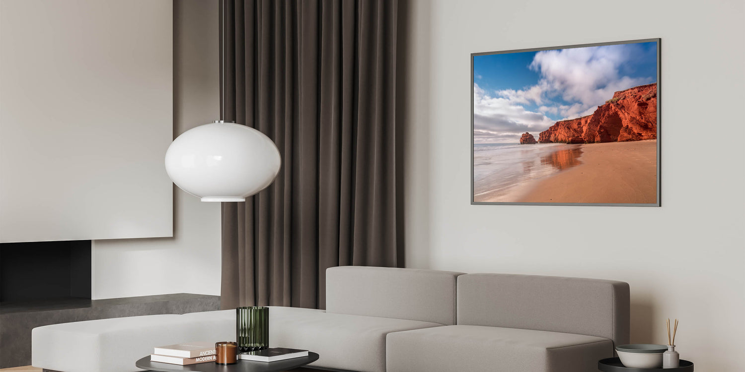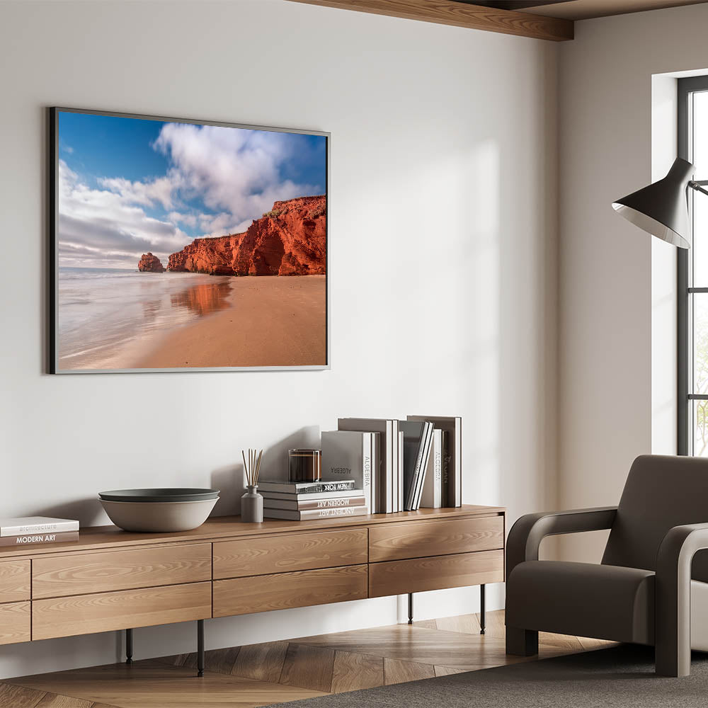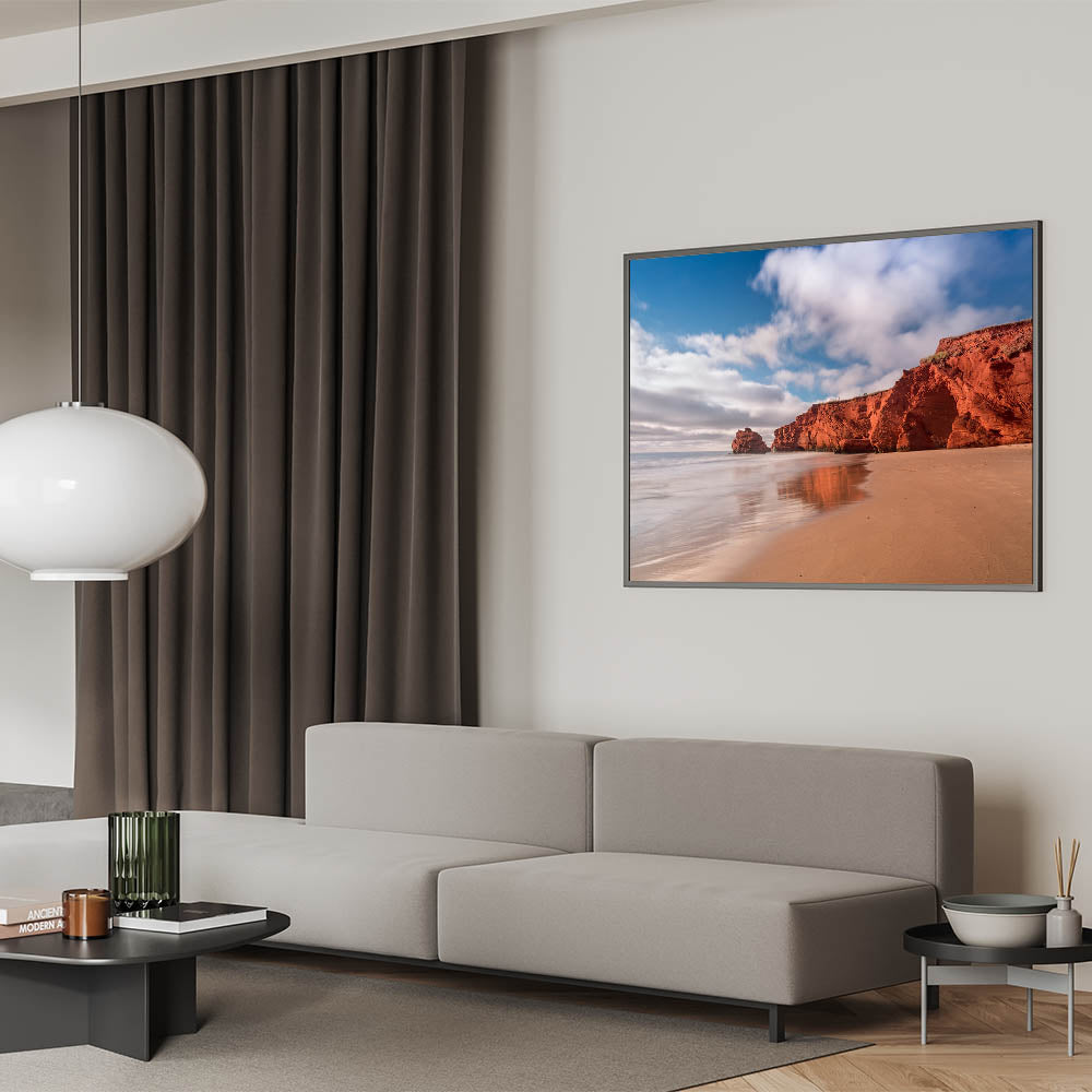 Embrace the rugged beauty of Quebec's red cliffs with this stunning coastal wall art. Capturing the vivid red rock formations set against a serene sandy beach, this piece brings the natural warmth and striking contrast of the landscape to life. The calm waters and clear skies create a tranquil backdrop, making this artwork perfect for adding an element of peace and beauty to your living space. Ideal for beach lovers and those who enjoy nature’s raw elegance, this print will bring a touch of warmth to any room.