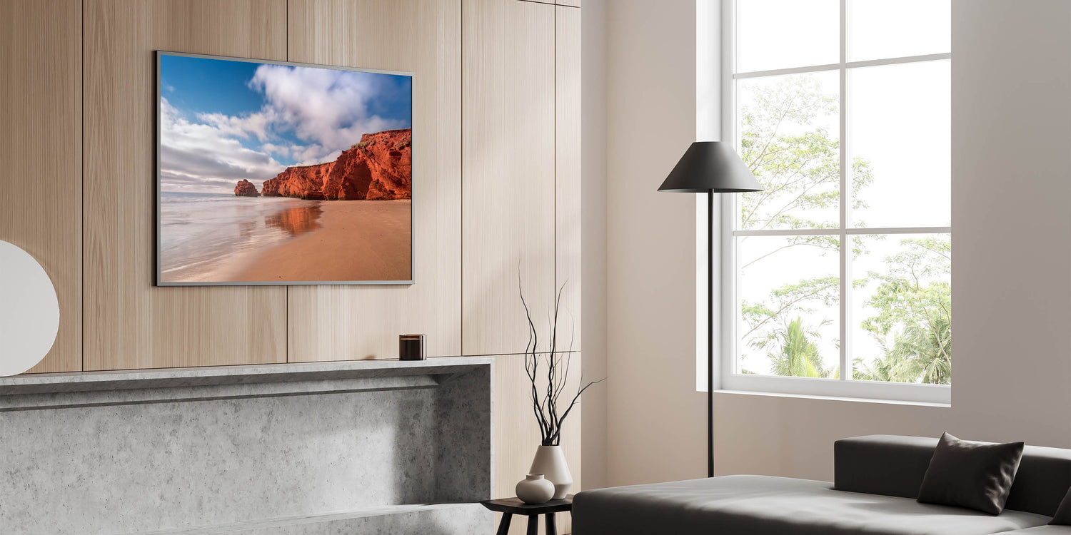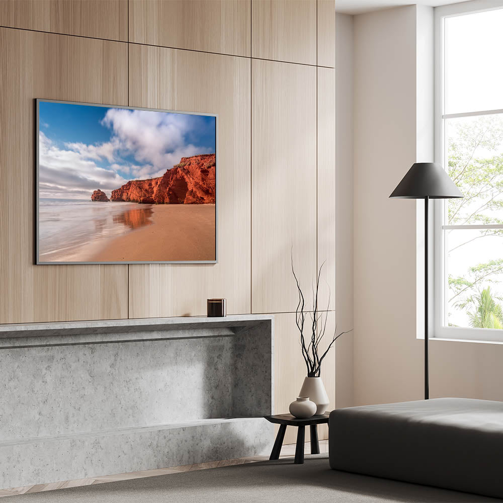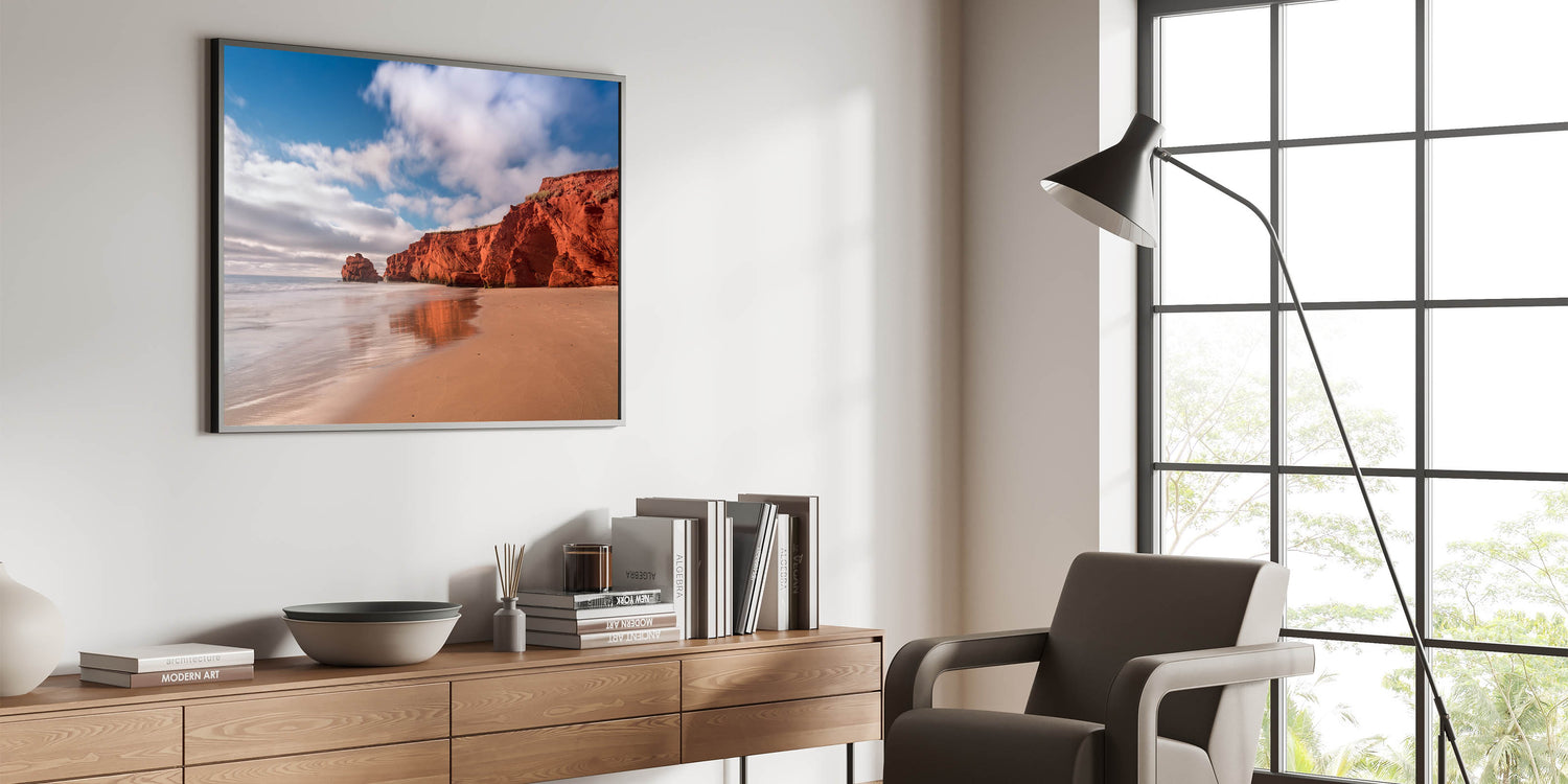 Embrace the rugged beauty of Quebec's red cliffs with this stunning coastal wall art. Capturing the vivid red rock formations set against a serene sandy beach, this piece brings the natural warmth and striking contrast of the landscape to life. The calm waters and clear skies create a tranquil backdrop, making this artwork perfect for adding an element of peace and beauty to your living space. Ideal for beach lovers and those who enjoy nature’s raw elegance, this print will bring a touch of warmth to any room.