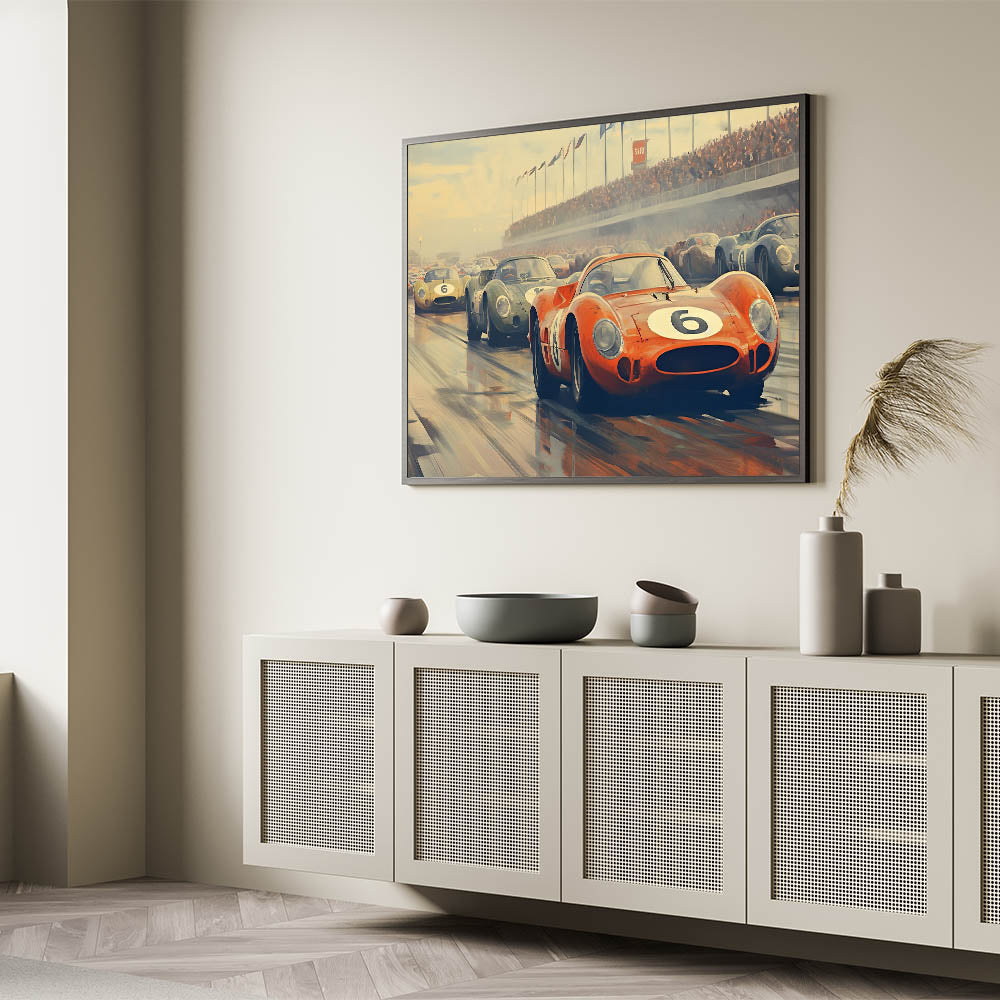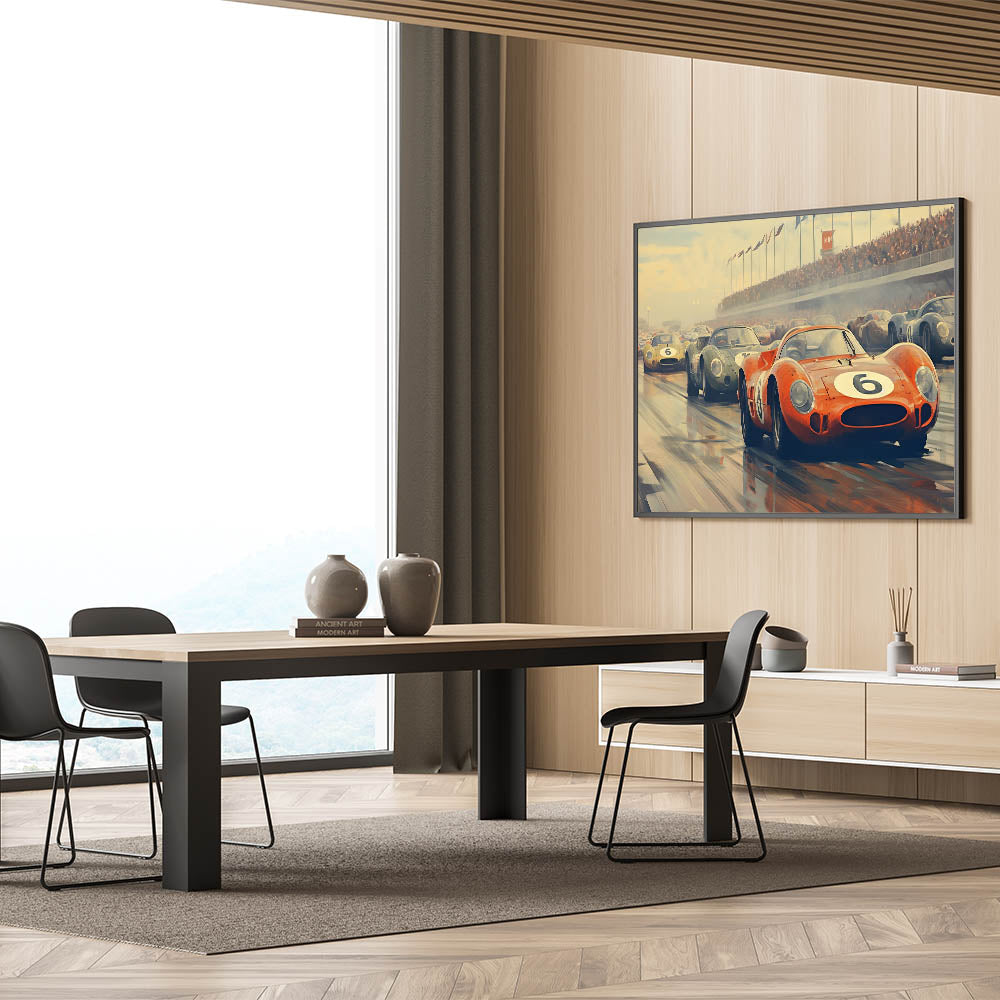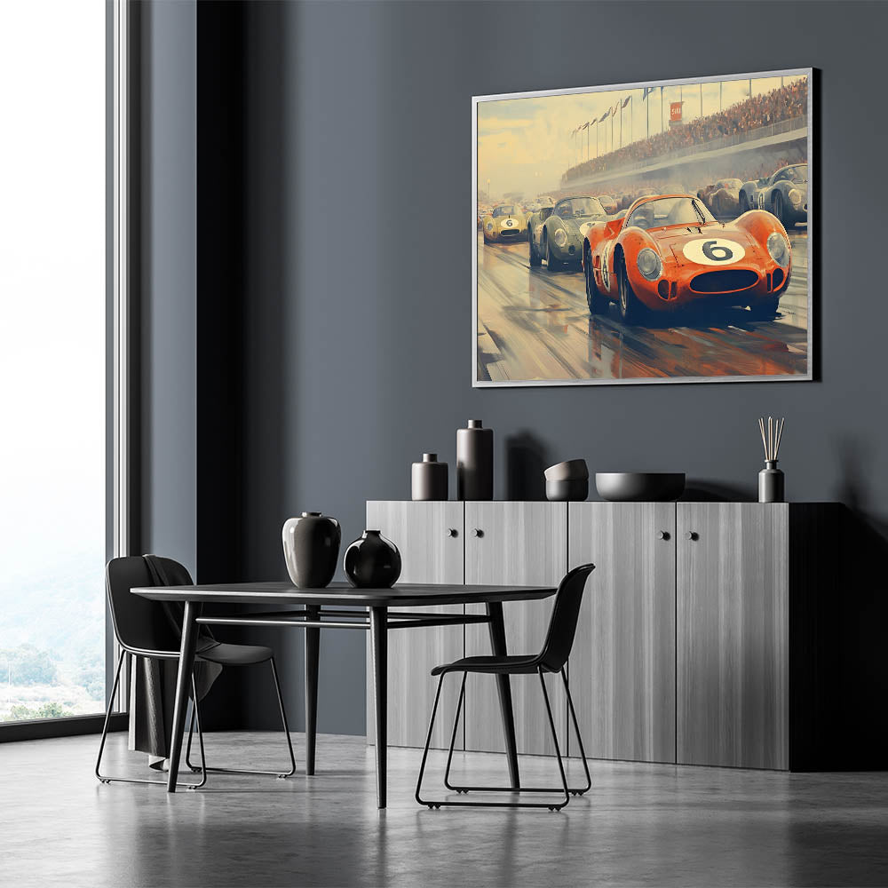 Step into the world of classic motorsport with this vibrant racing car wall art. This vintage speedway canvas print captures the energy and excitement of a race, with cars in vivid colors charging forward on a wet track. Perfect for car enthusiasts and fans of racing history, this piece adds a nostalgic yet dynamic touch to any space, whether it’s your living room, office, or garage.