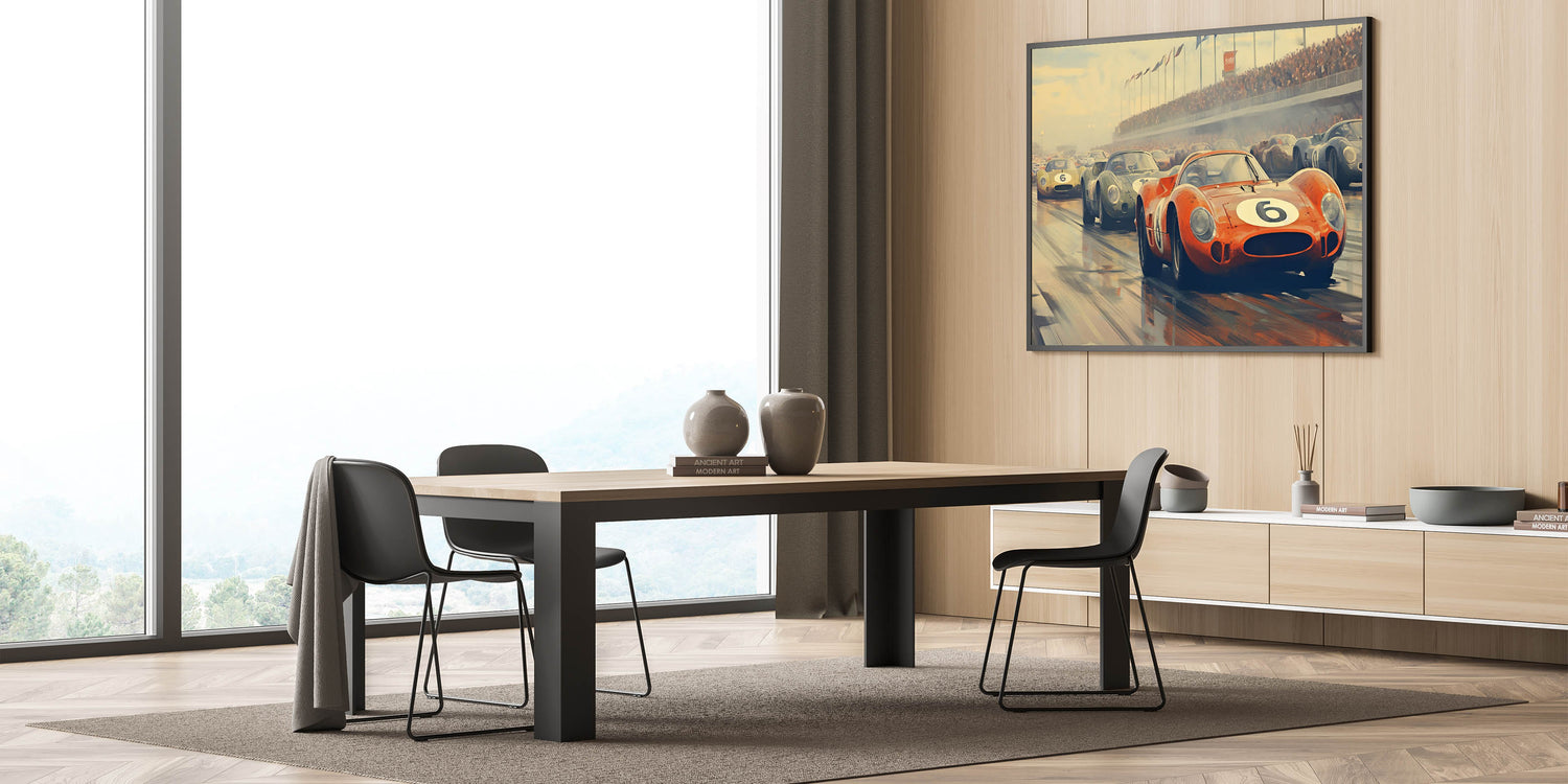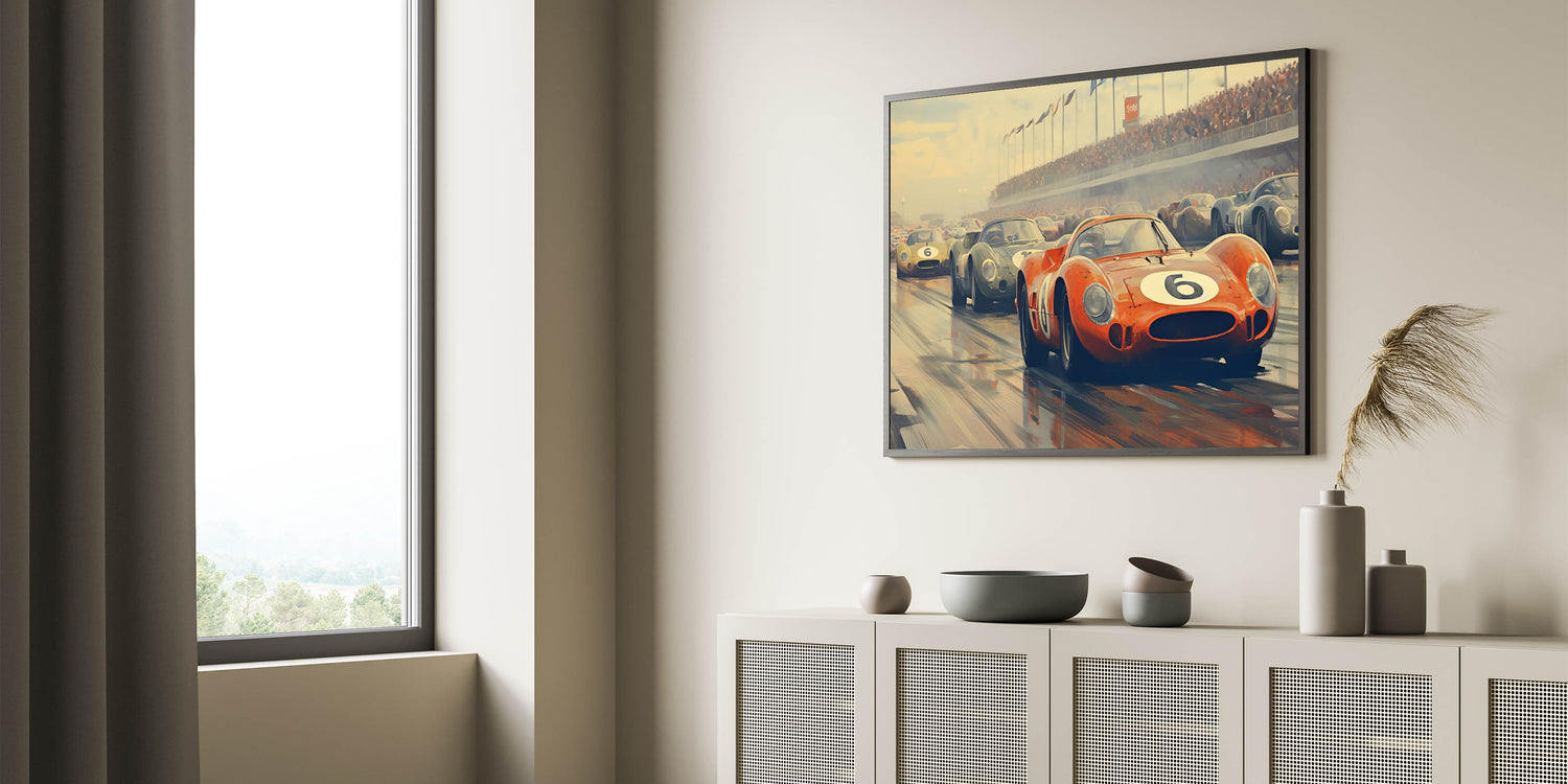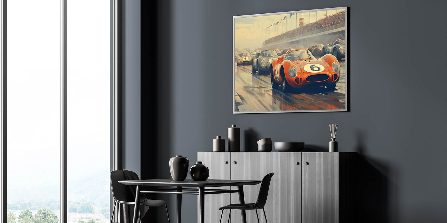 Step into the world of classic motorsport with this vibrant racing car wall art. This vintage speedway canvas print captures the energy and excitement of a race, with cars in vivid colors charging forward on a wet track. Perfect for car enthusiasts and fans of racing history, this piece adds a nostalgic yet dynamic touch to any space, whether it’s your living room, office, or garage.
