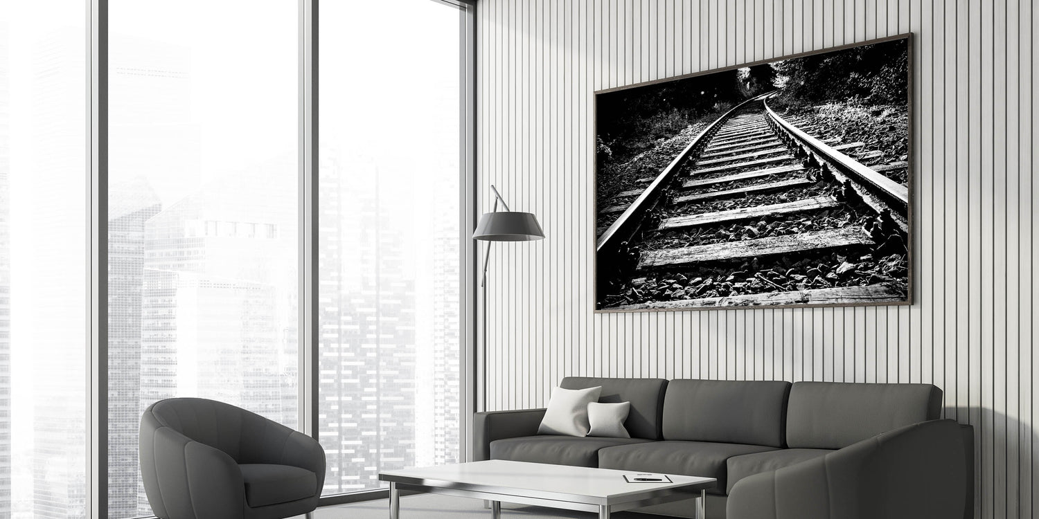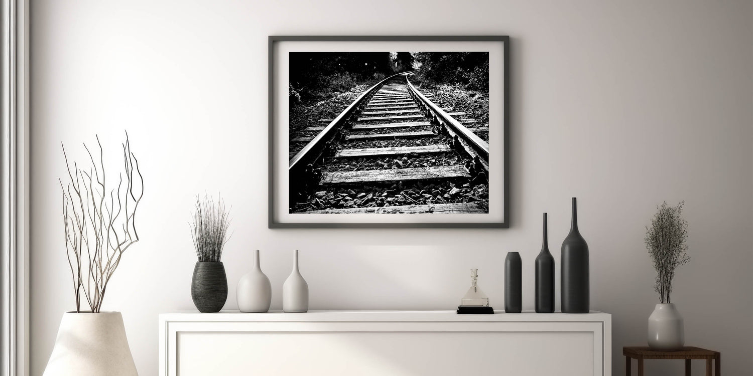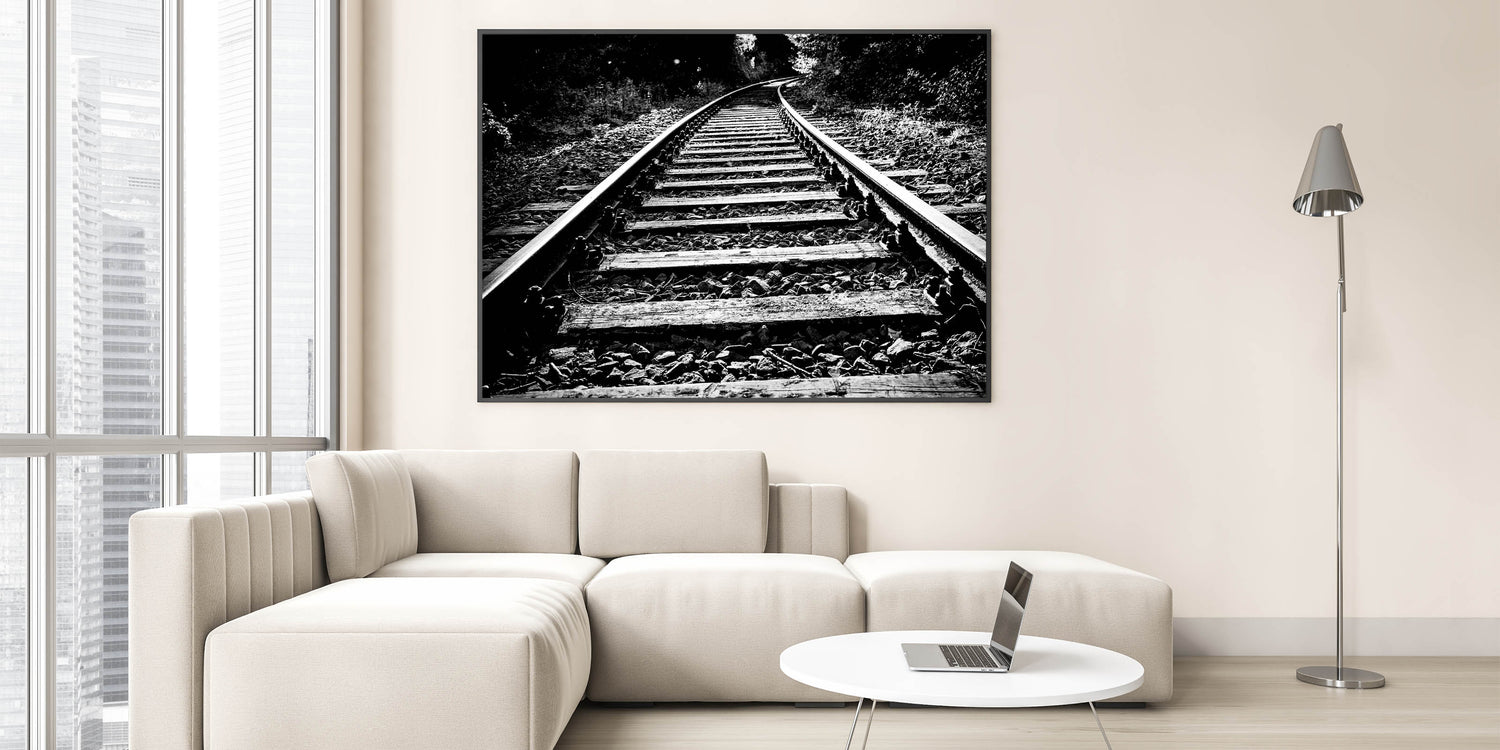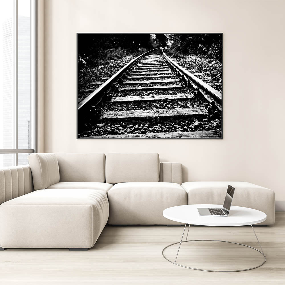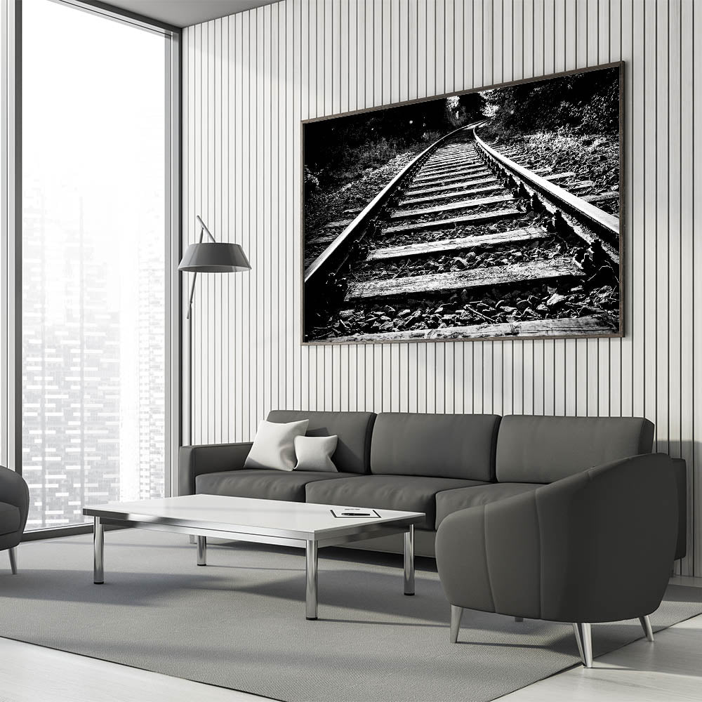 Step into a world of contrast and timeless beauty with this monochrome railroad wall art. The stark black and white tones highlight the raw textures of the railway, evoking a sense of solitude and journey into the unknown.