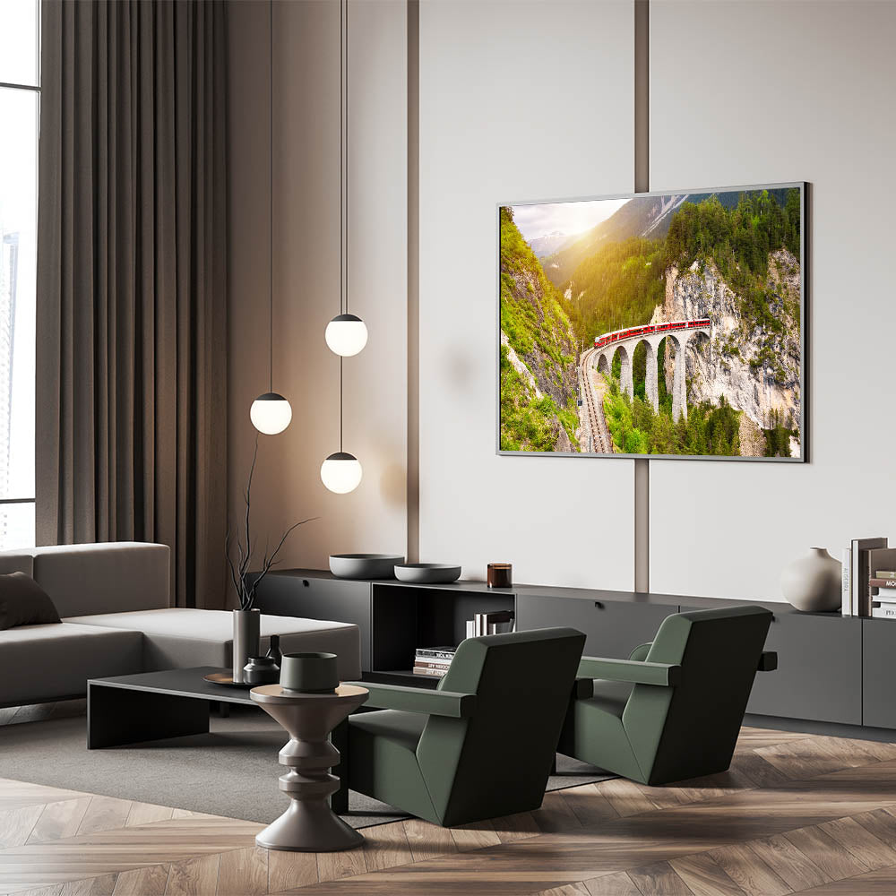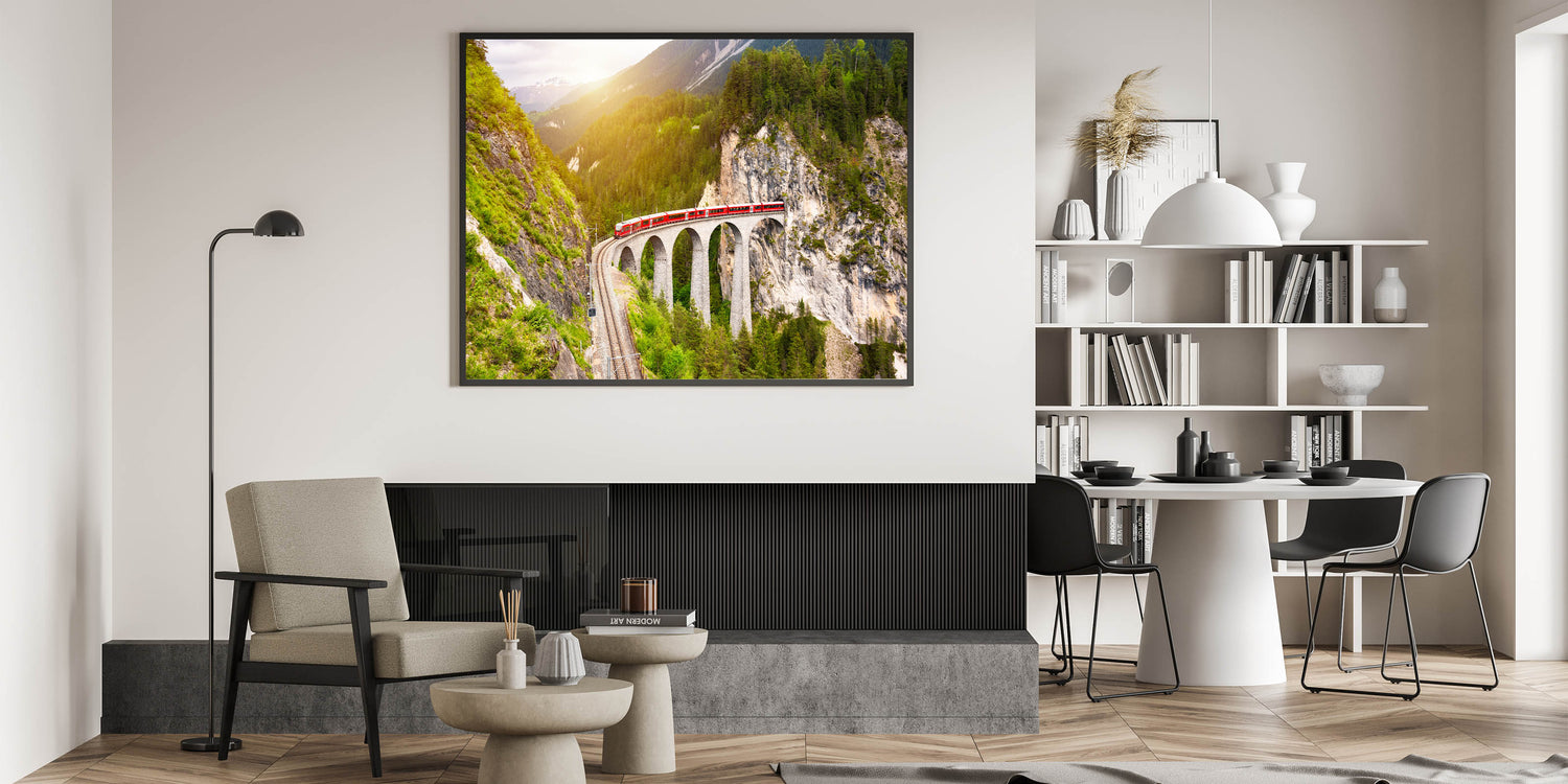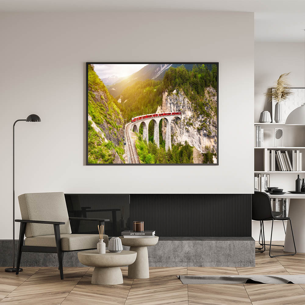 Capture the essence of adventure and scenic beauty with this stunning mountain bridge railway wall art. The vibrant red train stands out against the lush green forest and rugged mountain cliffs, creating a breathtaking contrast that draws the viewer into the scene.