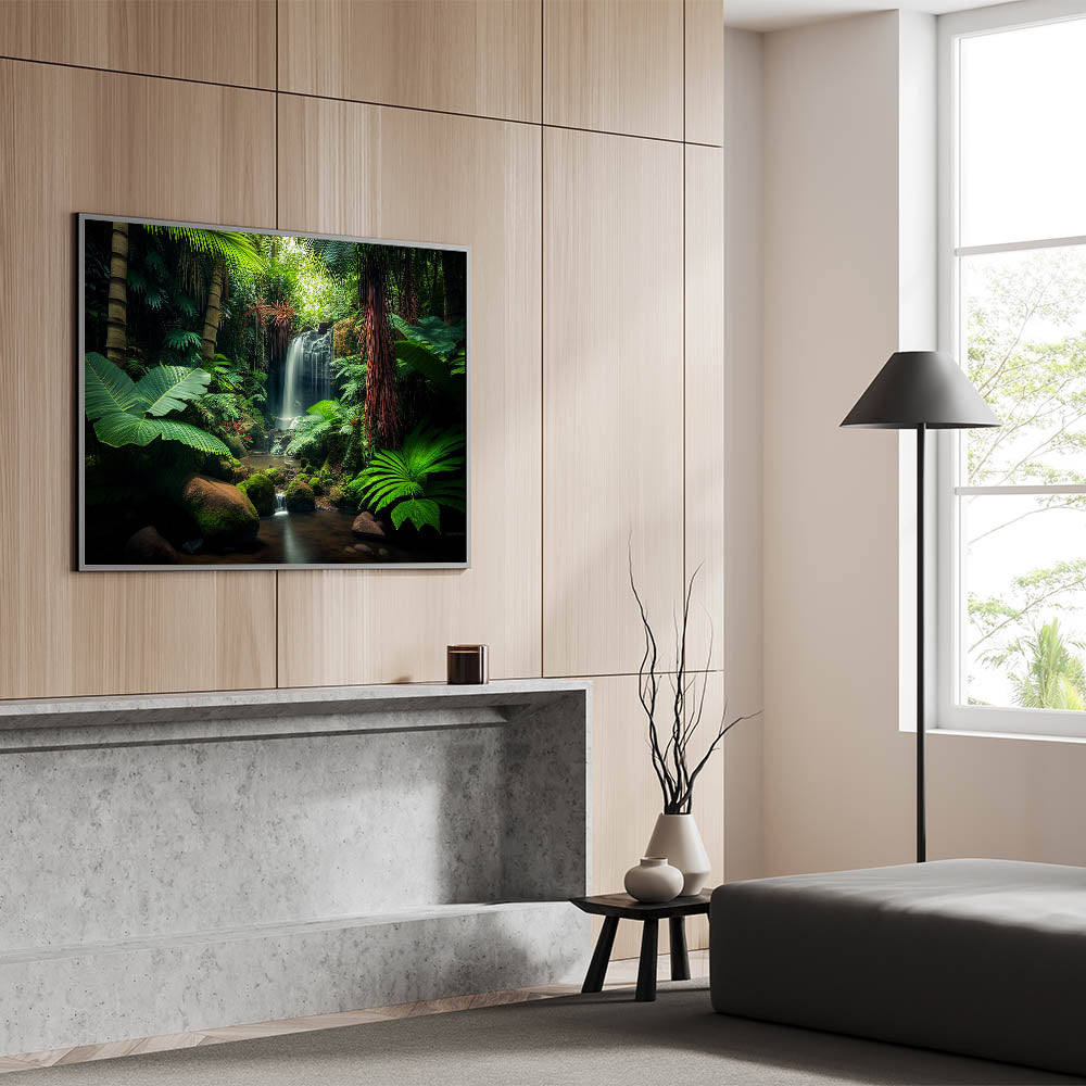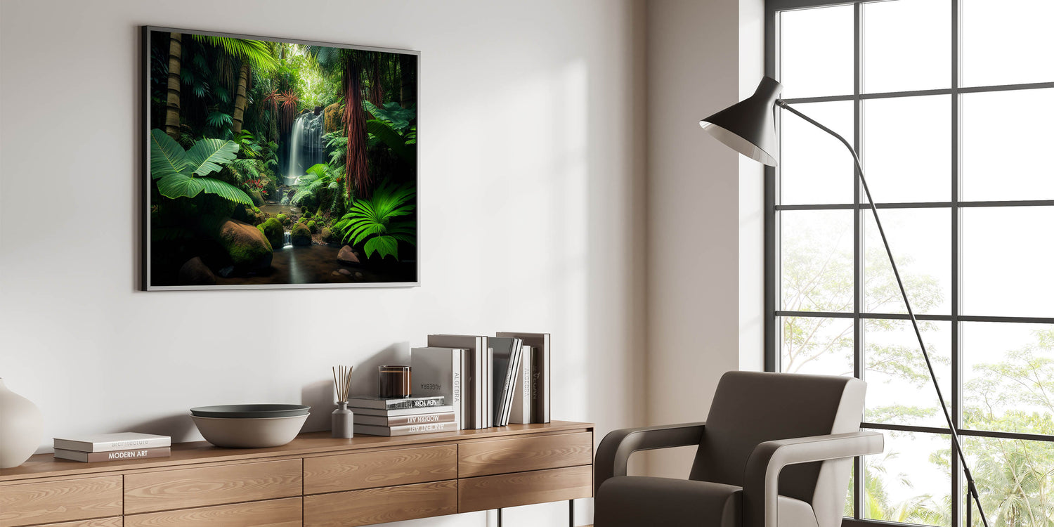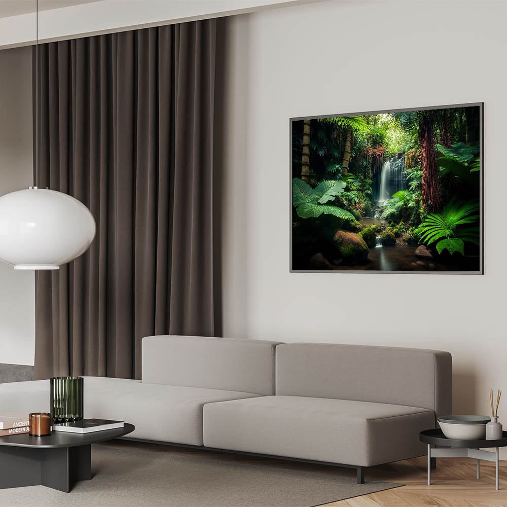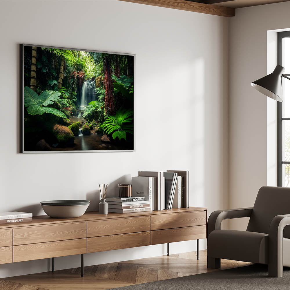 Transform your space with the serene beauty of the tropical rainforest, captured in this stunning wall art. The vibrant greens and intricate details of the lush jungle are brought to life, with a breathtaking waterfall serving as the focal point. This piece is perfect for nature lovers who want to bring the tranquility and richness of the Amazon jungle into their homes.