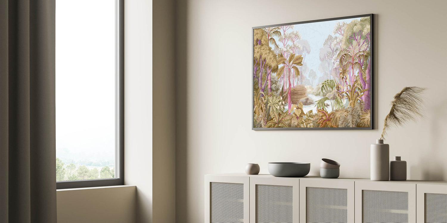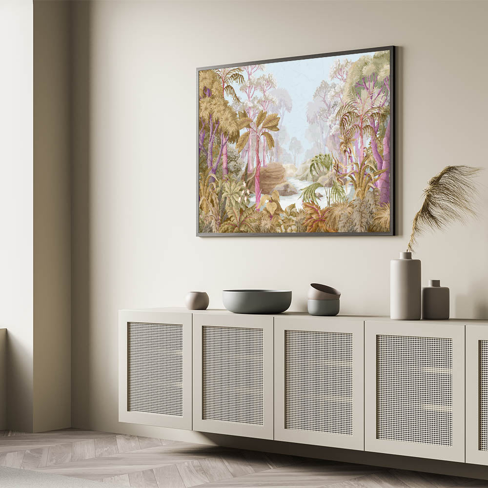 Add a touch of whimsical beauty to your home with our Pastel Rainforest Illustration Art. This enchanting print features a serene jungle scene rendered in soft, pastel tones, where delicate shades of pink, lavender, and beige create a dreamy atmosphere. The gentle hues and intricate details make this artwork a perfect addition for those looking to bring a sense of calm and elegance into their space.